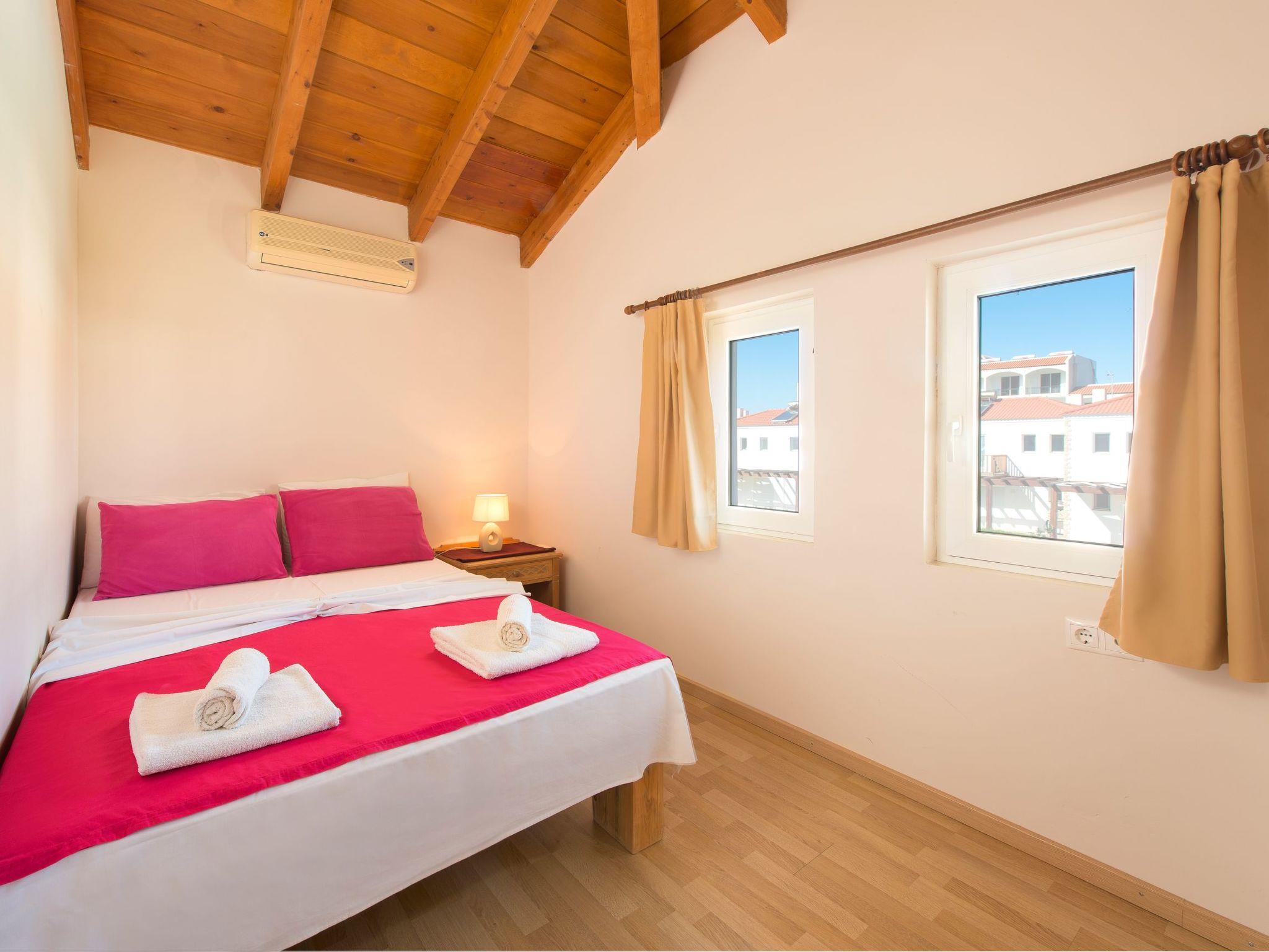 These modern Greek-style villa is only 300m from the beach and with a beautiful view of the surrounding mountains. Cozy semi-detached house with modern comforts and a big common swimming pool. Everything you need is on a walking distance!