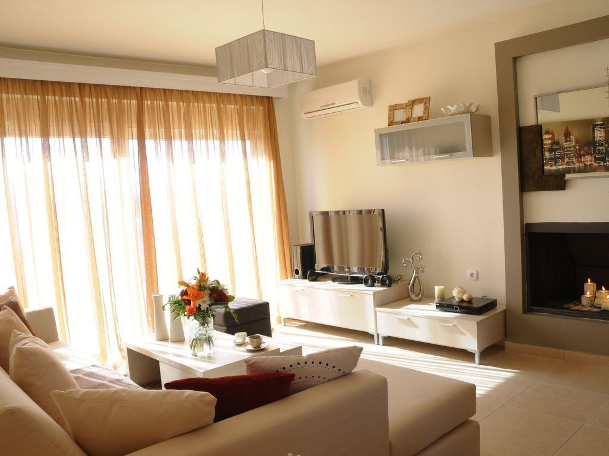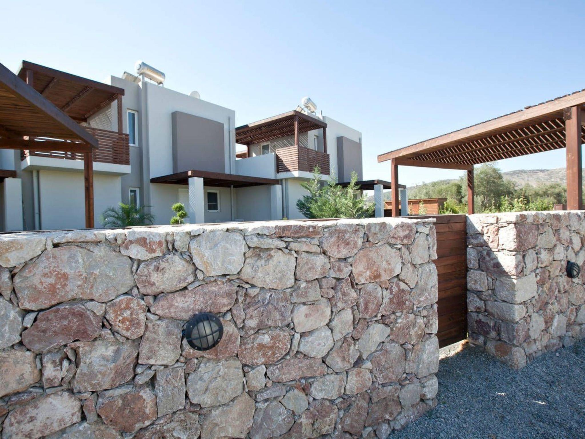 The beach is about 1km metres away. Charaki bay its 1 km away ,with its restaurants and supermarkets