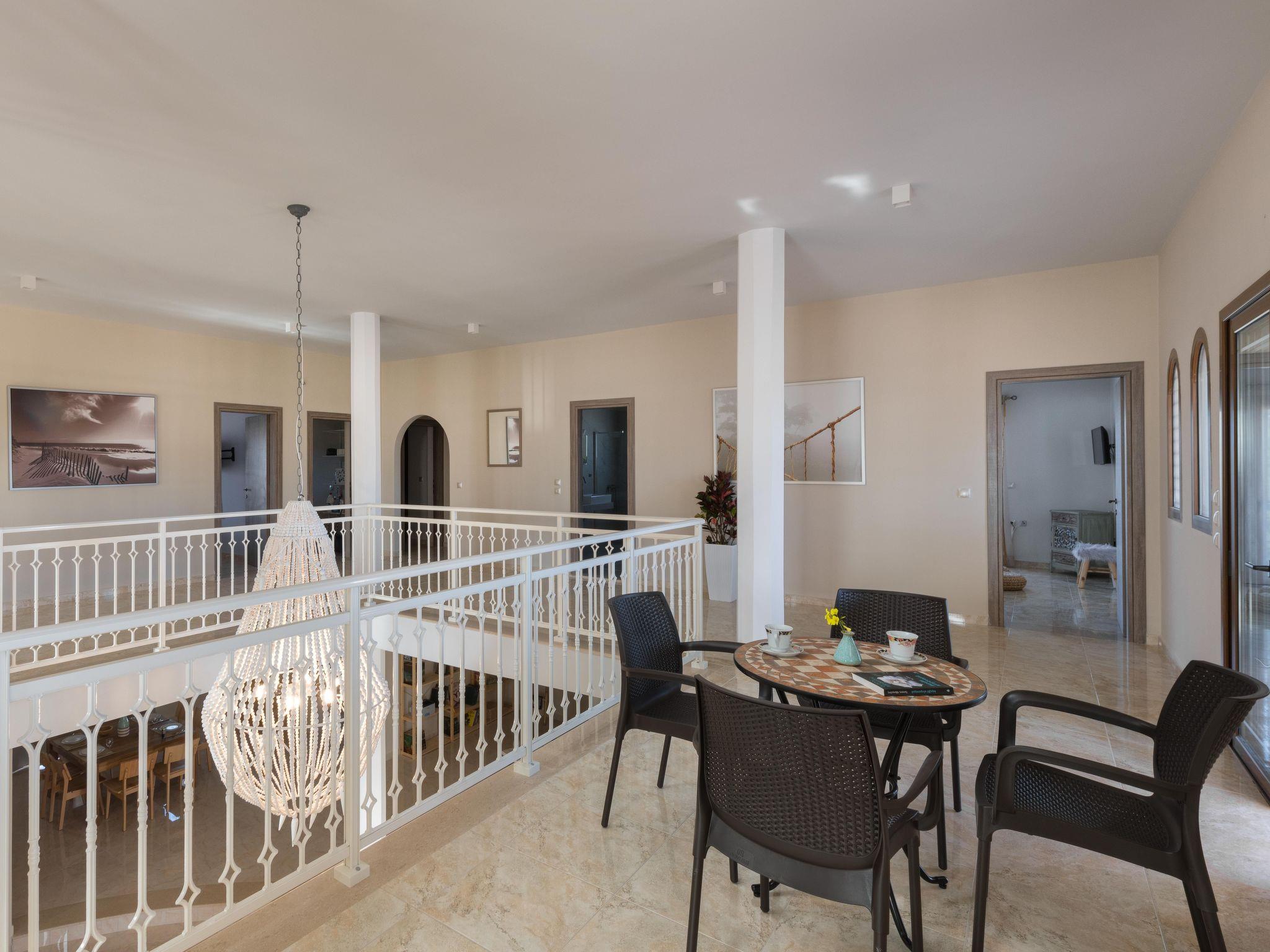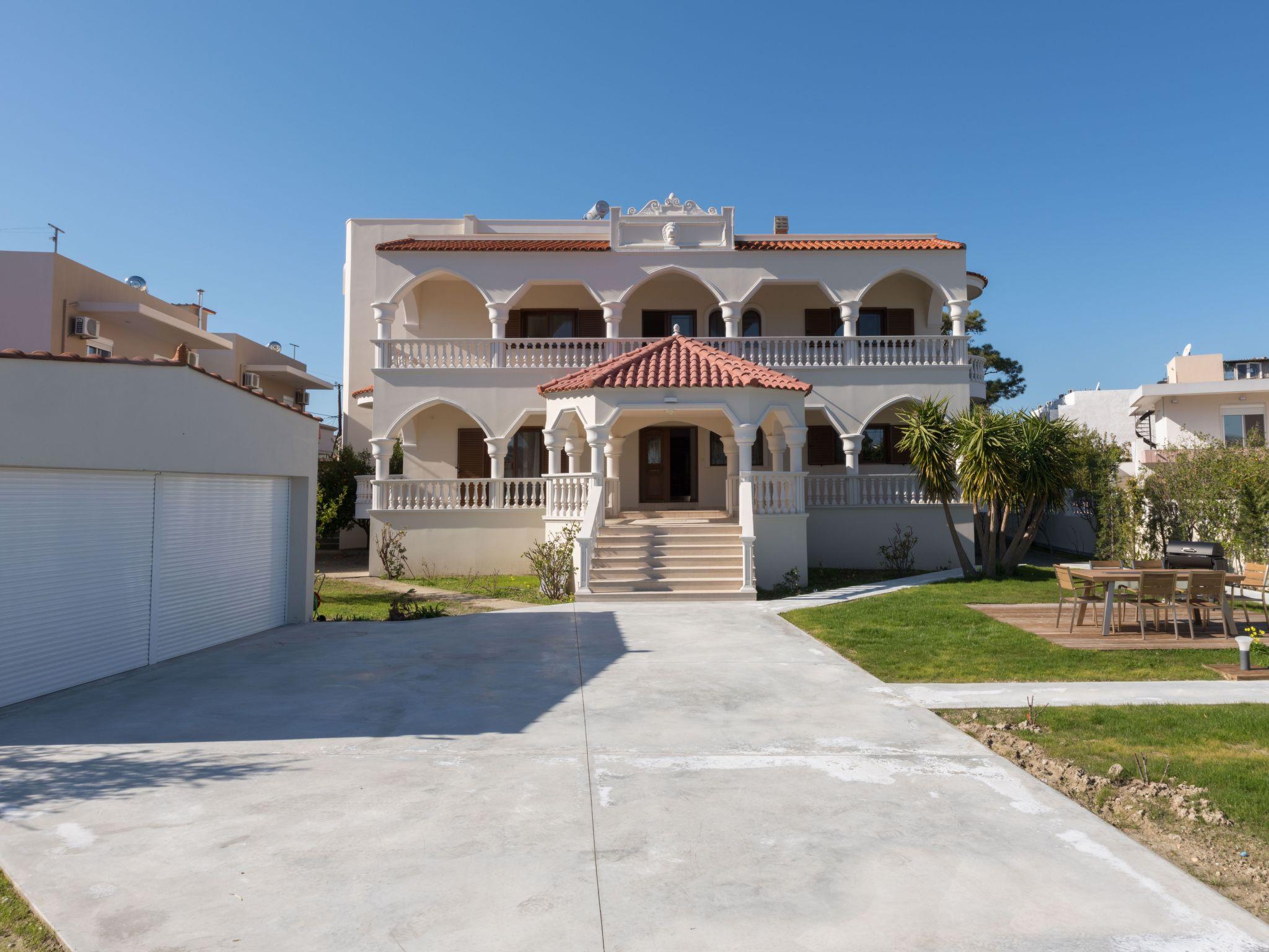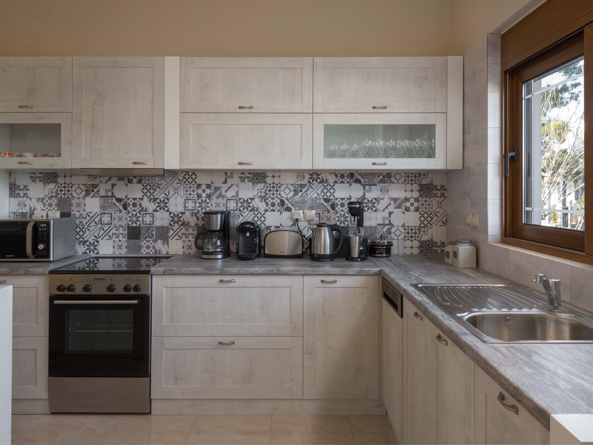 The villa offers 6 spacious bedrooms, four of them with a double bed, and two of them with 2 separate beds. All of the bedrooms are fully air-conditioned and offer a balcony. There’s a large living room with comfortable sitting areas along with a desk. In the basement, there’s an entertainment area with a flat screen TV and a game console as well as a projector and projection screen. Also, there’s a fully equipped modern kitchen for any meal preparation. Evelyn Villa has 3 bathrooms, one of them with a bathtub and the other one with a shower. The house also offers a range of amenities that guests will find useful during their stay such as free Wi-Fi access. Outdoors, Evelyn Villa is equally impressive and offers a large well-tended garden with a pool area, featuring a sun deck equipped with parasols and sun beds, creating the perfect setting for a relaxing time under the golden rays of the Greek sun. In addition, there’s a ping pong table for extra fun moments. The house also has spacious verandas both on the ground and first floor with great views of the surrounding area. The villa also offers a fully equipped BBQ with a sitting area in the garden where guests can enjoy the ultimate outdoor dining experience.