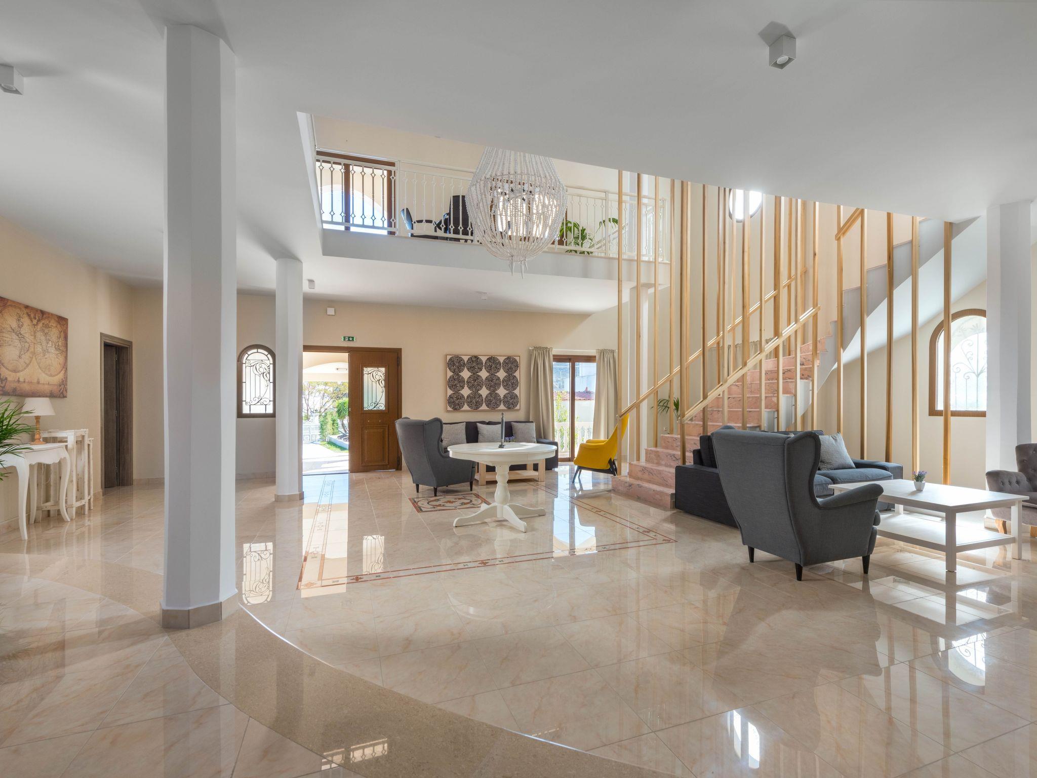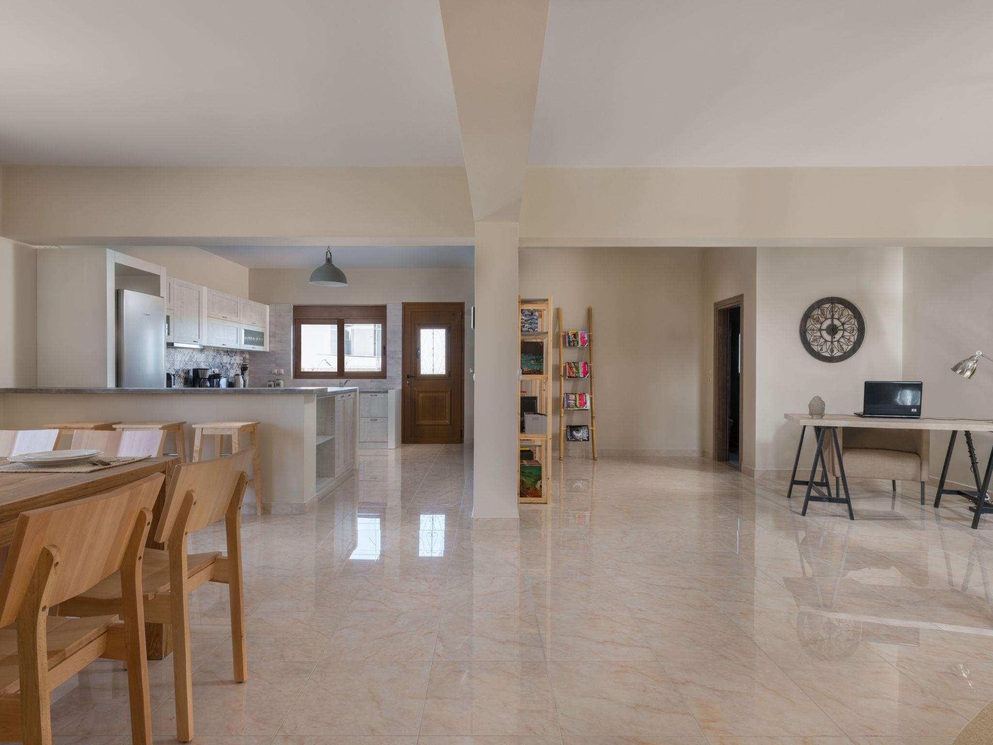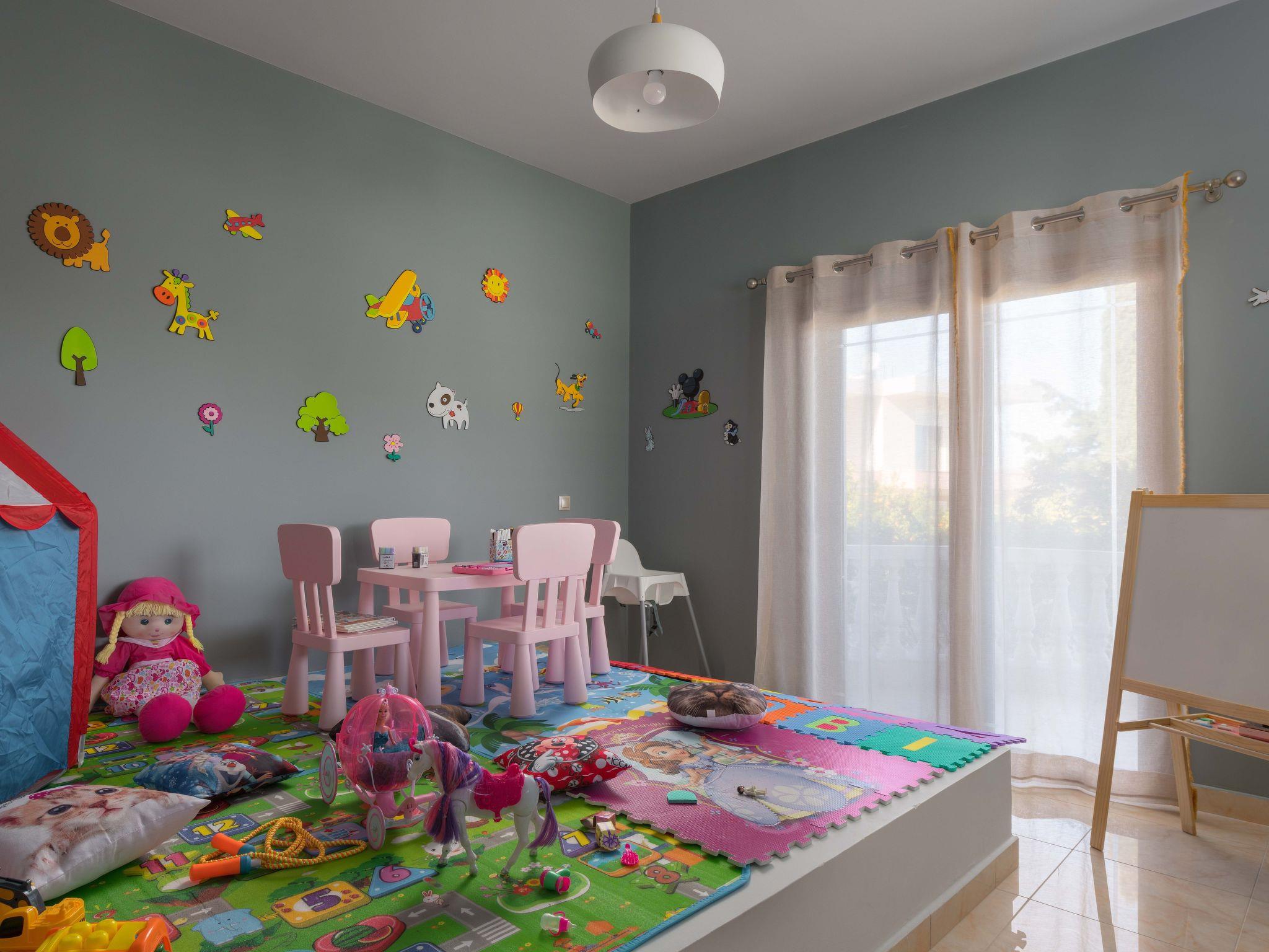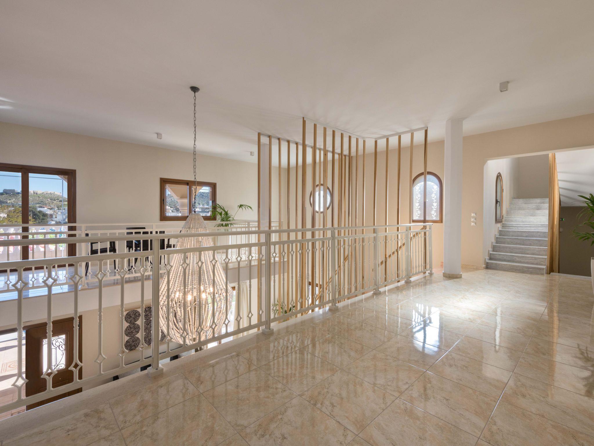 The villa offers 6 spacious bedrooms, four of them with a double bed, and two of them with 2 separate beds. All of the bedrooms are fully air-conditioned and offer a balcony. There’s a large living room with comfortable sitting areas along with a desk. In the basement, there’s an entertainment area with a flat screen TV and a game console as well as a projector and projection screen. Also, there’s a fully equipped modern kitchen for any meal preparation. Evelyn Villa has 3 bathrooms, one of them with a bathtub and the other one with a shower. The house also offers a range of amenities that guests will find useful during their stay such as free Wi-Fi access. Outdoors, Evelyn Villa is equally impressive and offers a large well-tended garden with a pool area, featuring a sun deck equipped with parasols and sun beds, creating the perfect setting for a relaxing time under the golden rays of the Greek sun. In addition, there’s a ping pong table for extra fun moments. The house also has spacious verandas both on the ground and first floor with great views of the surrounding area. The villa also offers a fully equipped BBQ with a sitting area in the garden where guests can enjoy the ultimate outdoor dining experience.