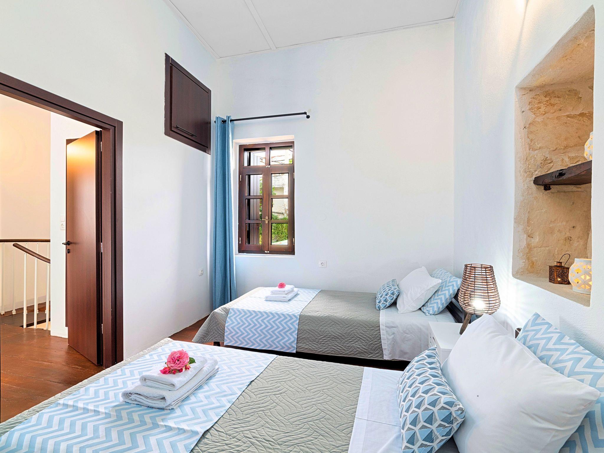 At the Upper Floor* Two bedrooms, One with a queen size double bed and another one with two single beds.* A WC* A large veranda with sitting area.At the Ground Floor* A huge living-dining room that can accommodate four guests (two in a sofa who convert to bunk bed and another two in folding sofa beds, a large fireplace, a TV, direct access to the terrace, the garden and the pool and jacuzzi area.* Next to the living room is a Kitchen with an oven, a dishwasher, a fridge, an espresso coffee maker, tea facilities, a juicer, a toaster and a dish set.* A large bathroom with shower* Air-condition in all areas* Free WiFi internet access* An outdoor dining area next to the pool * Washing machine* An iron and an ironing board* Safe deposit box* Hair dryer* Fine linens and towels* Toiletries* Swimming pool towels* Baby cot* High chair* Towels / bed linen, Cleaning- Every 3 or 4 days