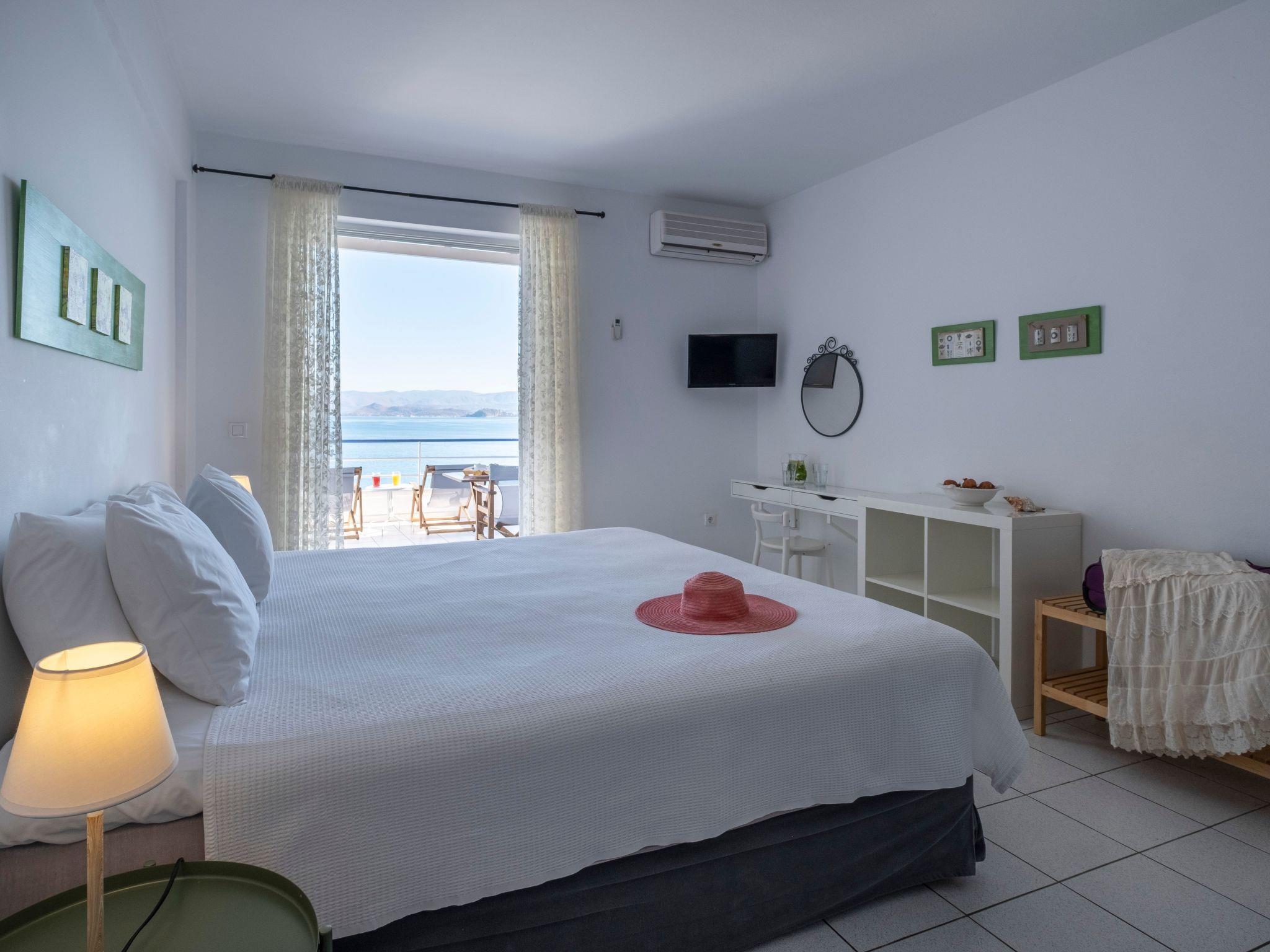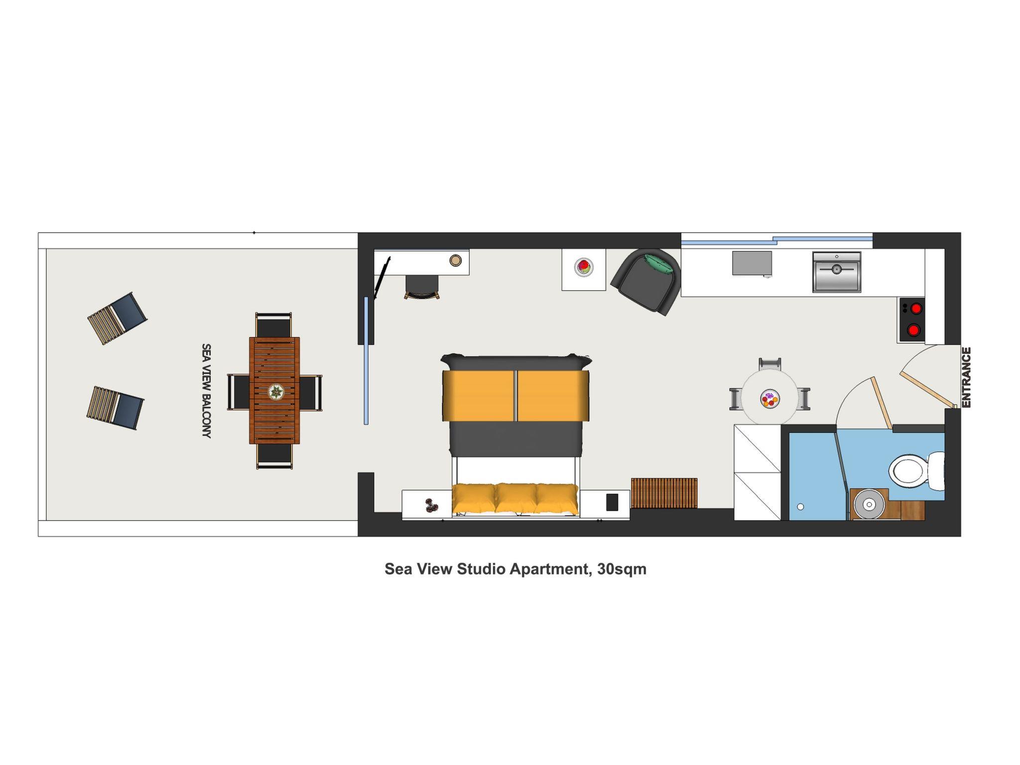 Studio apartment is 30sqm. There are a double bed 1.80x2.00m, air- condition, free internet connection (wifi and Ethernet), kitchen with all utilities, microwave, kettle, two ring kitchen, small oven, coffee maker and kitchen all utilities. Also there is a bathroom with shower. Apartment has a big sea view balcony with dining table and sun beds.