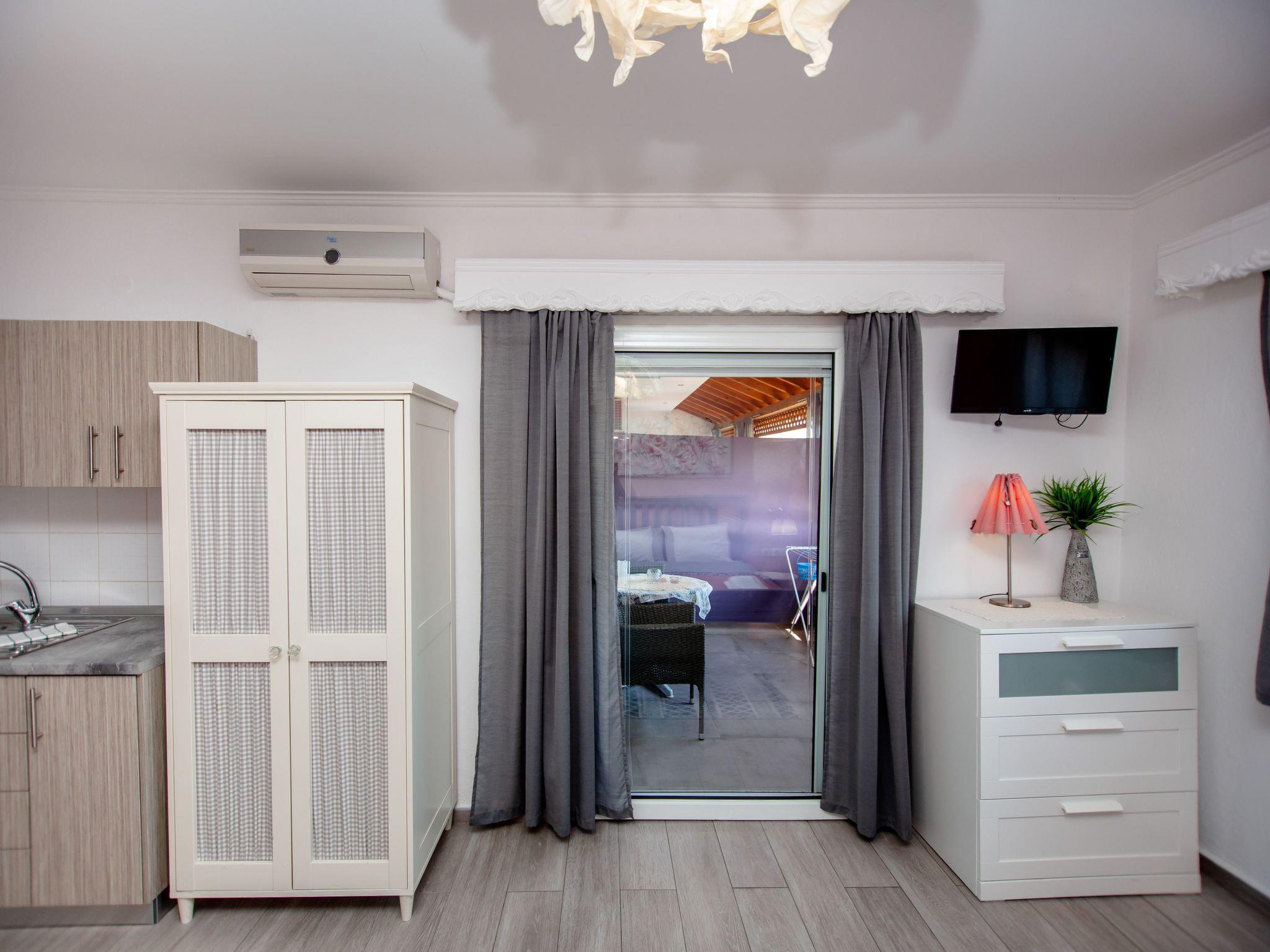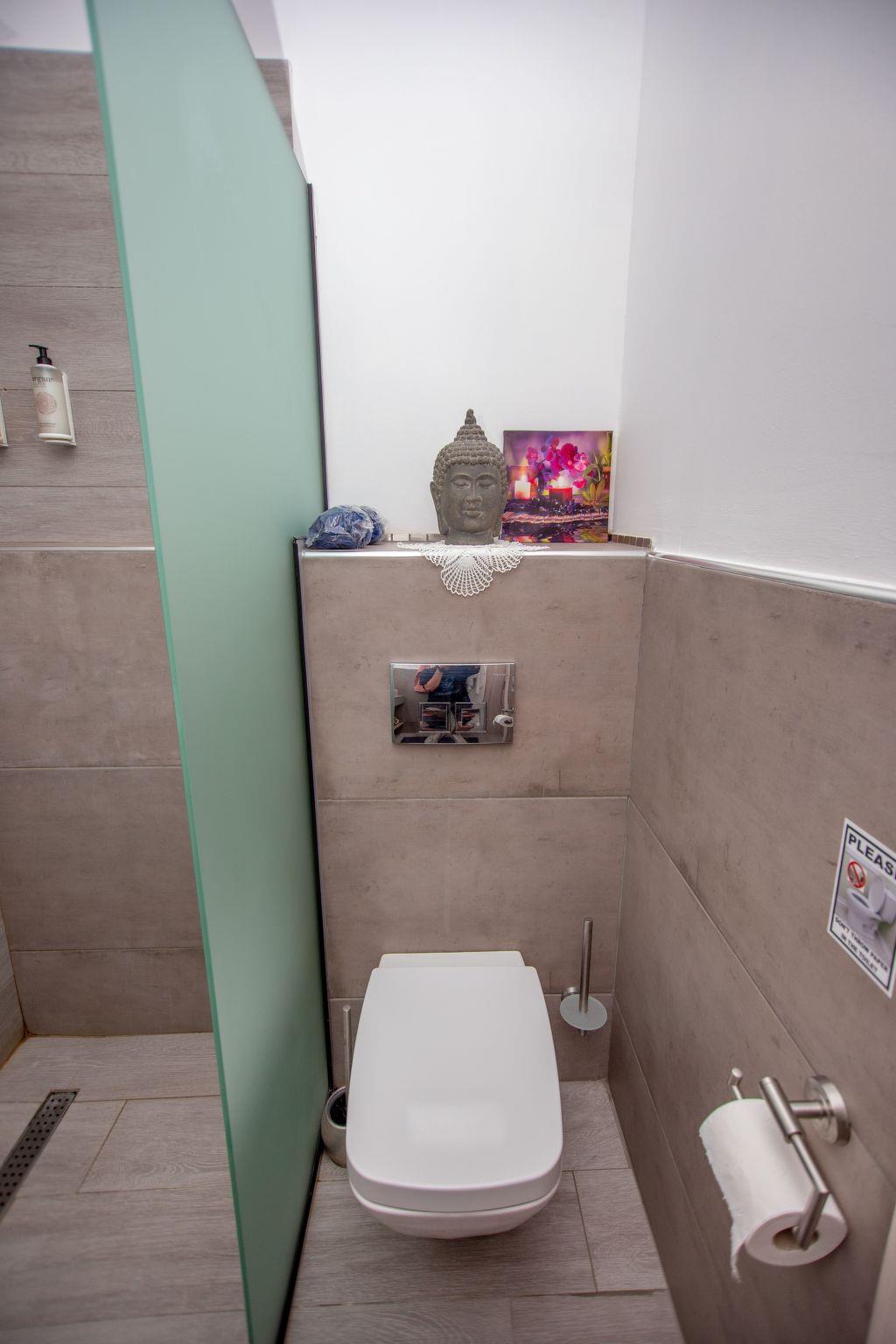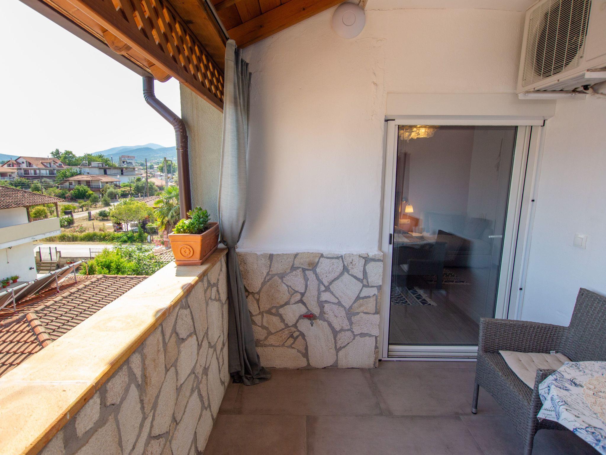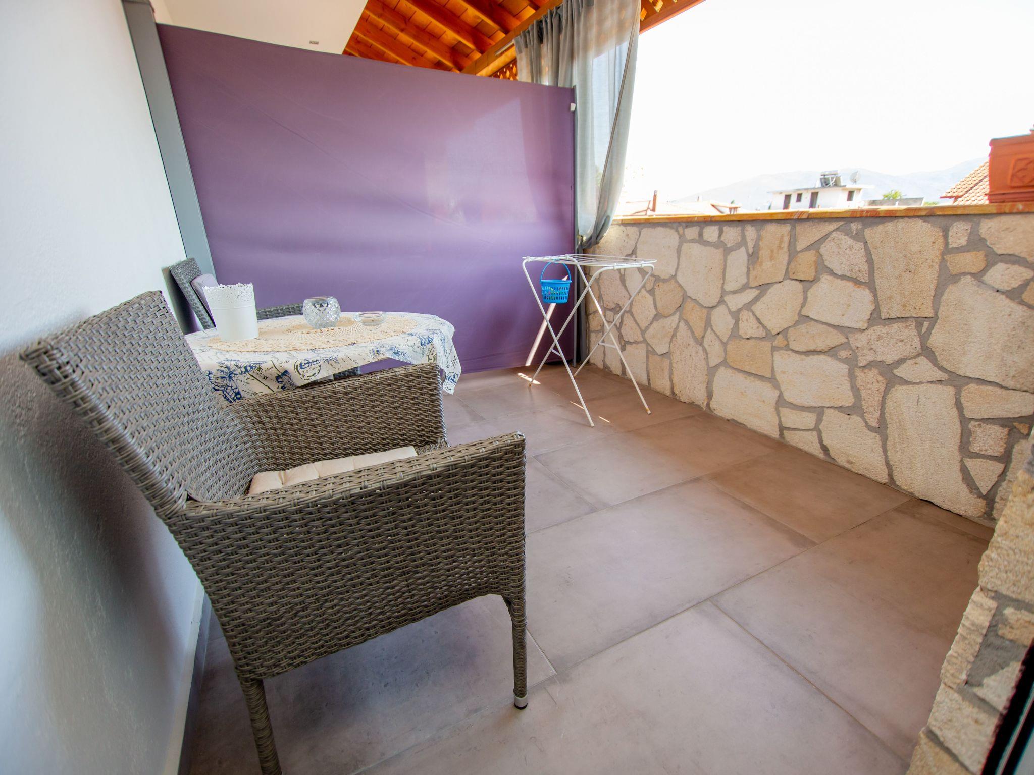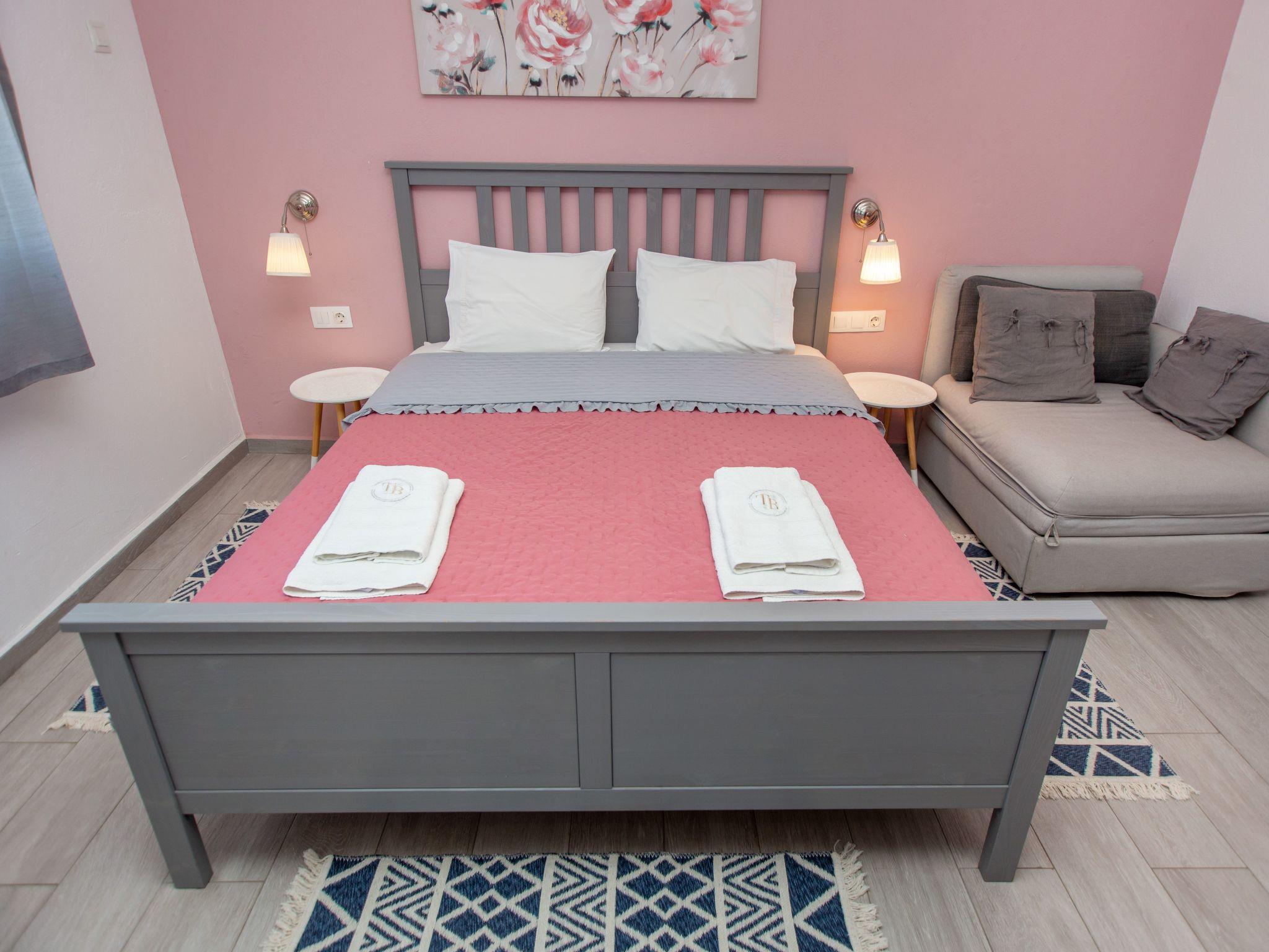 The triple room studio/apartment is approx. 27 square metres in size and is located on the first floor of the house. It has a room with a double bed (160 x 200), a sofa bed for one person and a ground-floor shower/WC. The adjoining kitchenette with fridge and induction hob is equipped with various crockery. A beautiful, large balcony with a view of the inner courtyard is also part of this cosy studio.
