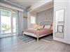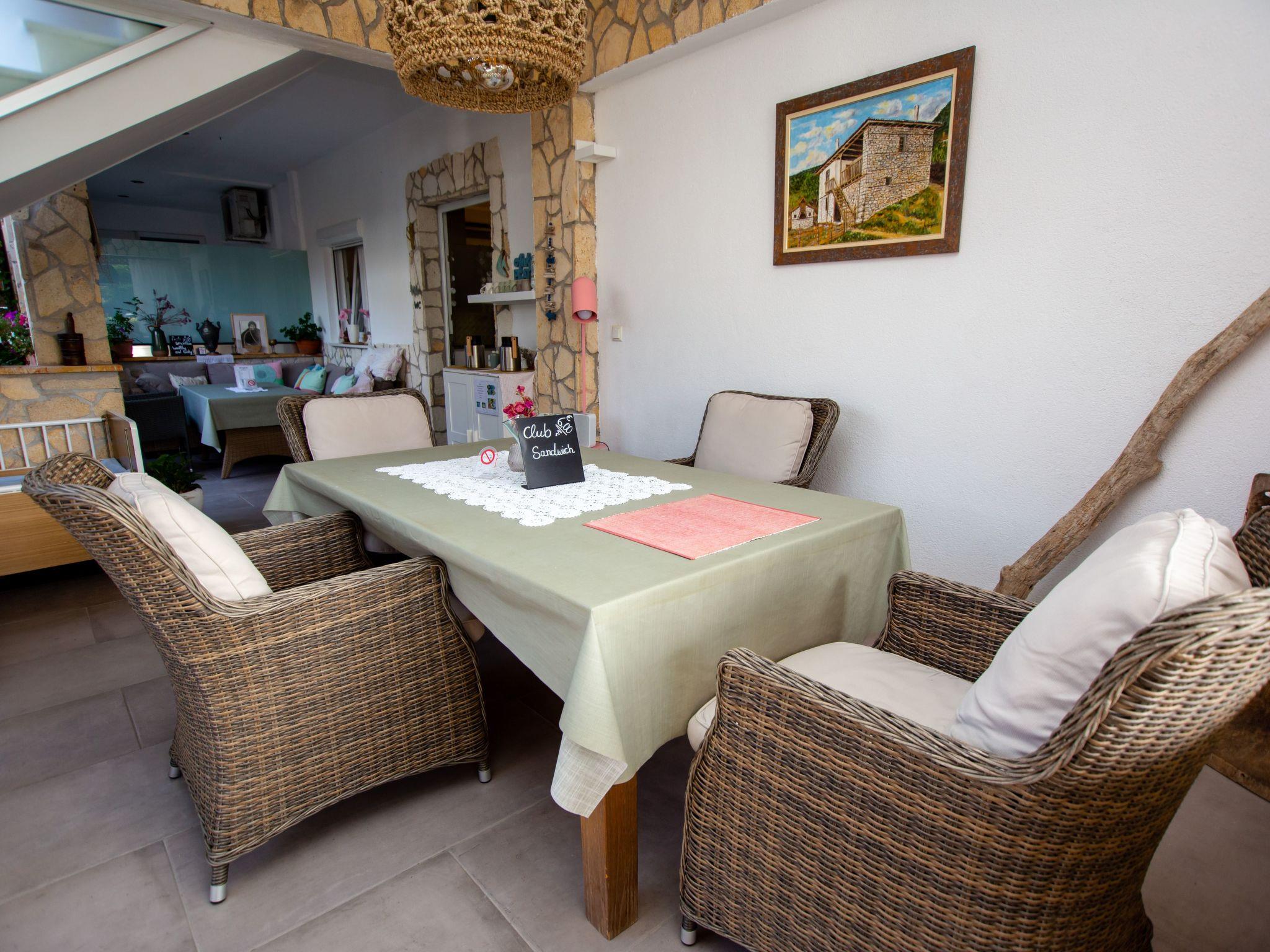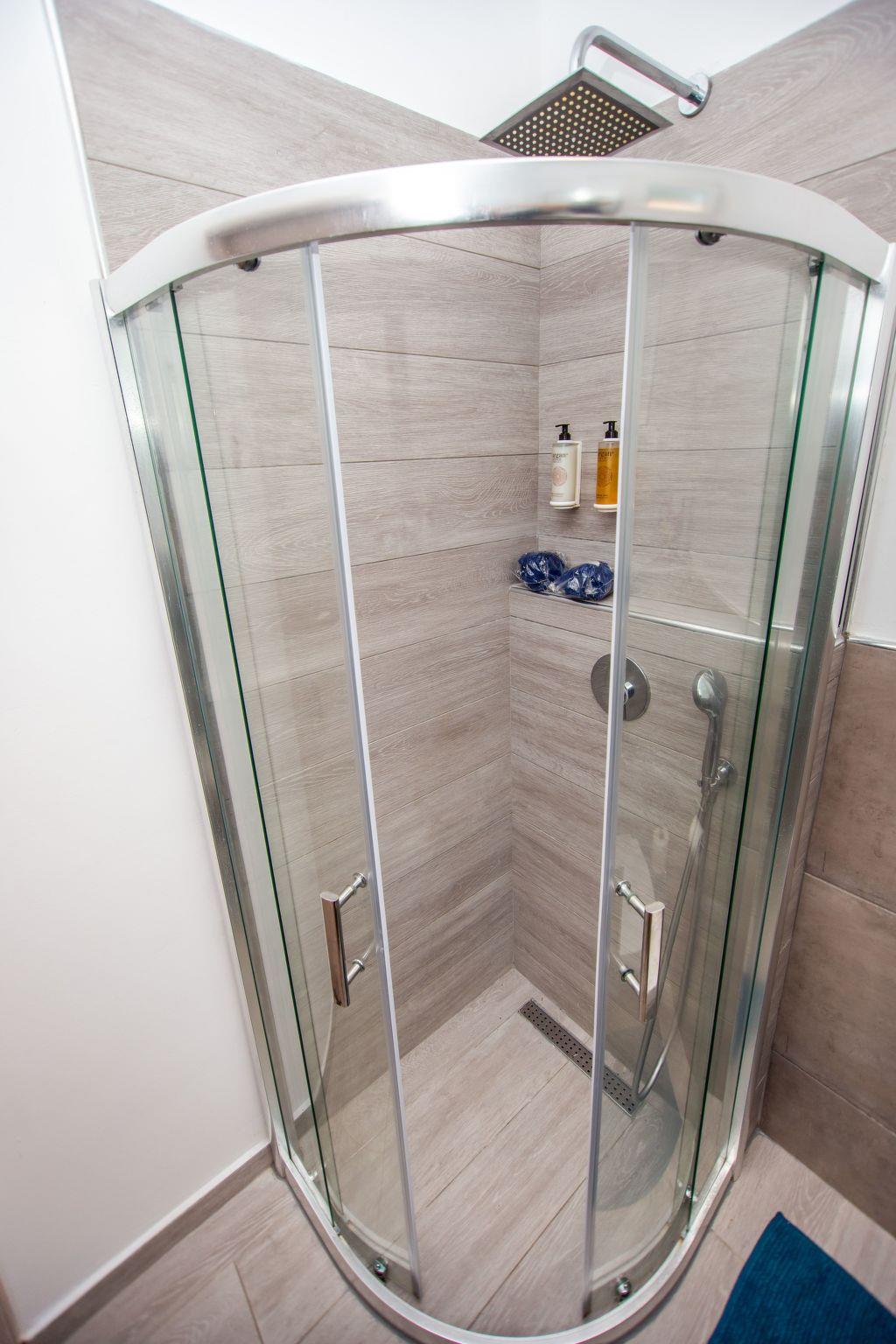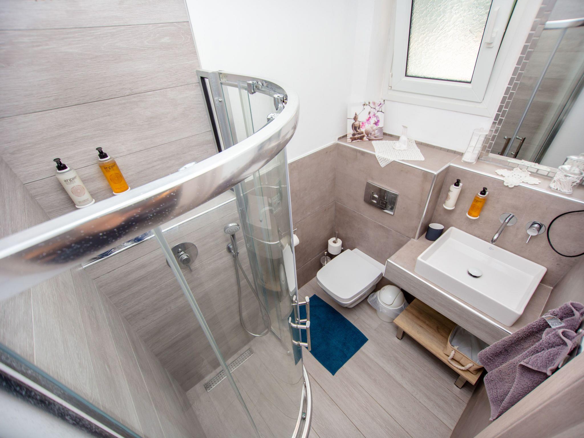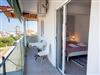 The double room/studio is approx. 27 square metres in size and is located on the first floor of the house. It has a room with a double bed (160 x 200) and a ground-floor shower/WC with window. The kitchenette with fridge and induction hob is equipped with a coffee machine, toaster, kettle and various crockery. A beautiful, very large balcony with a view of the village and the sea is also part of this cosy studio.