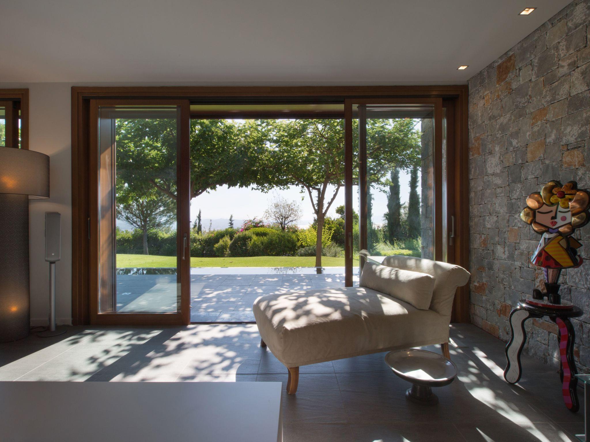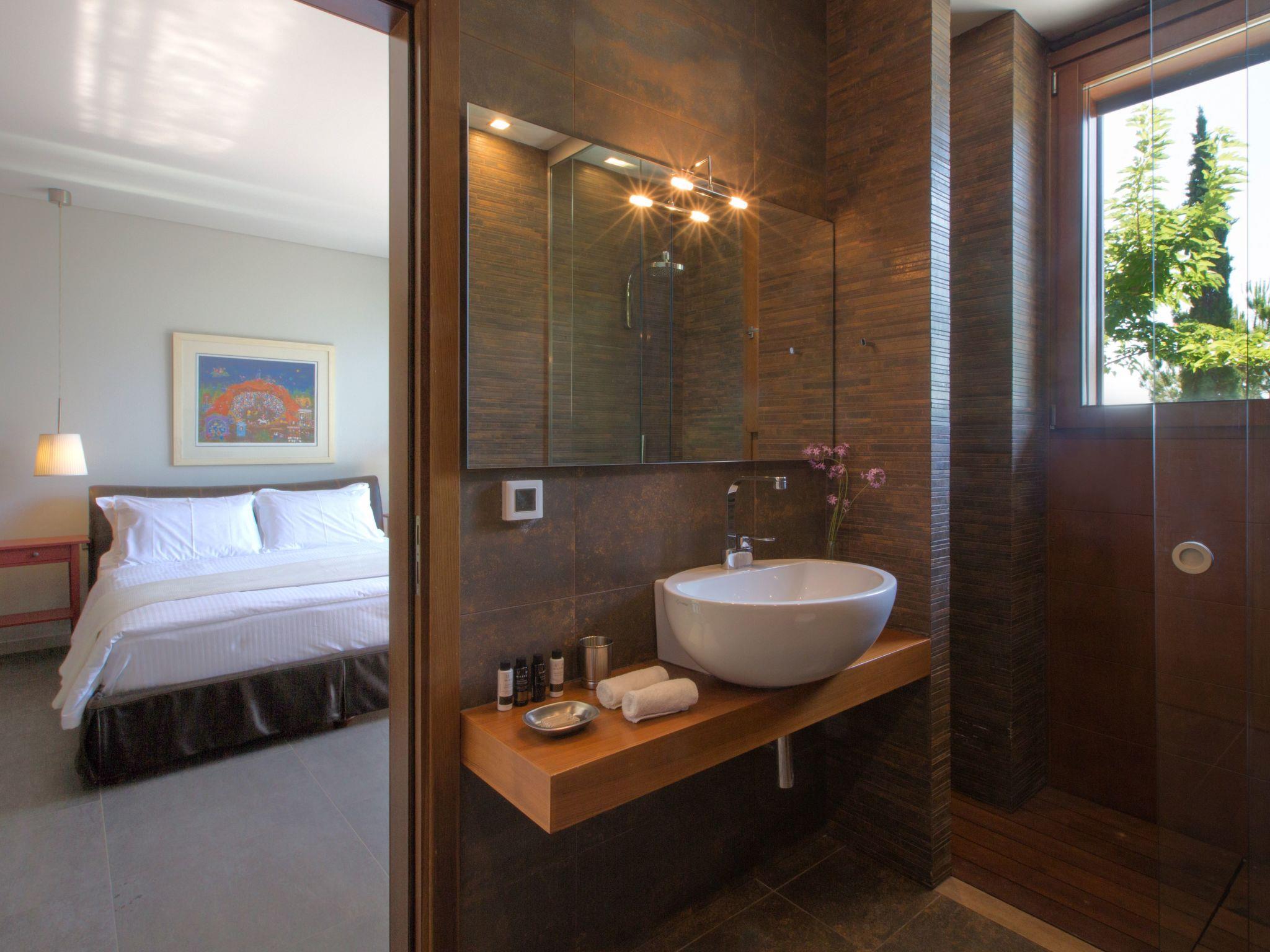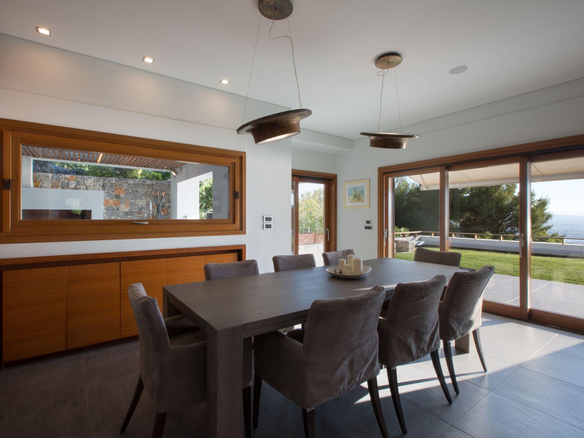 On the ground floor level there is a small, separate small studio consisting of a sleeping area with a queen size bed, an en-suite bathroom and a private living room with direct access to the swimming pool area. It can accommodate two more people if necessary with the use of a big convertible couch. Two separate living areas, the dining and the kitchen area are on this level too.