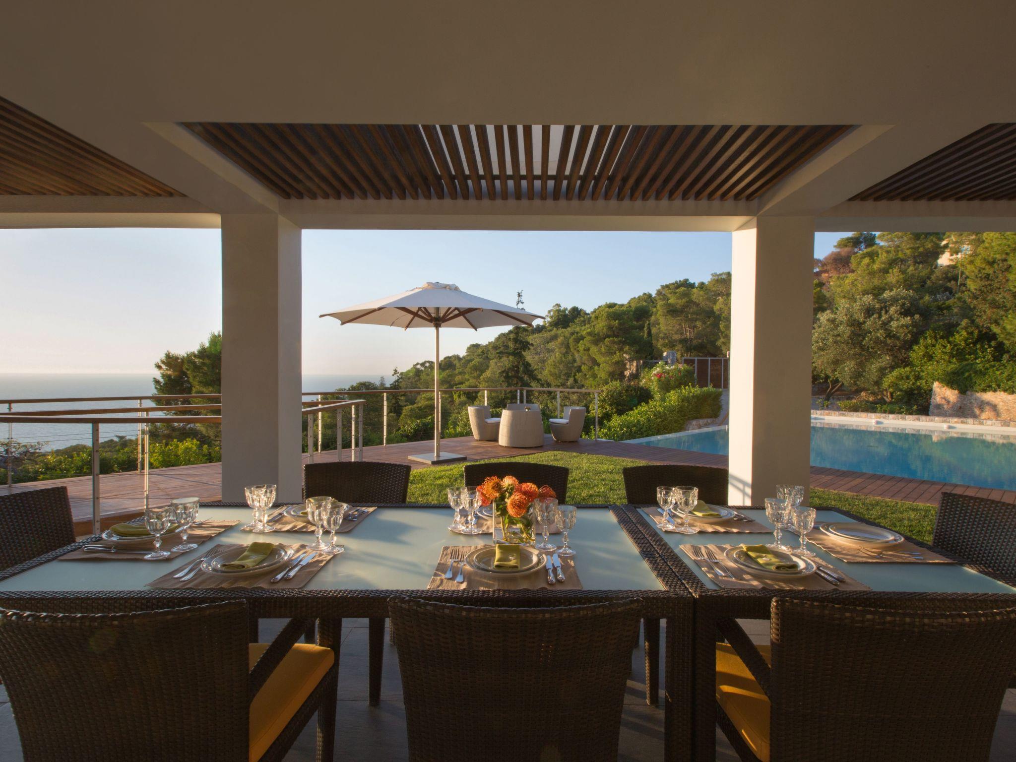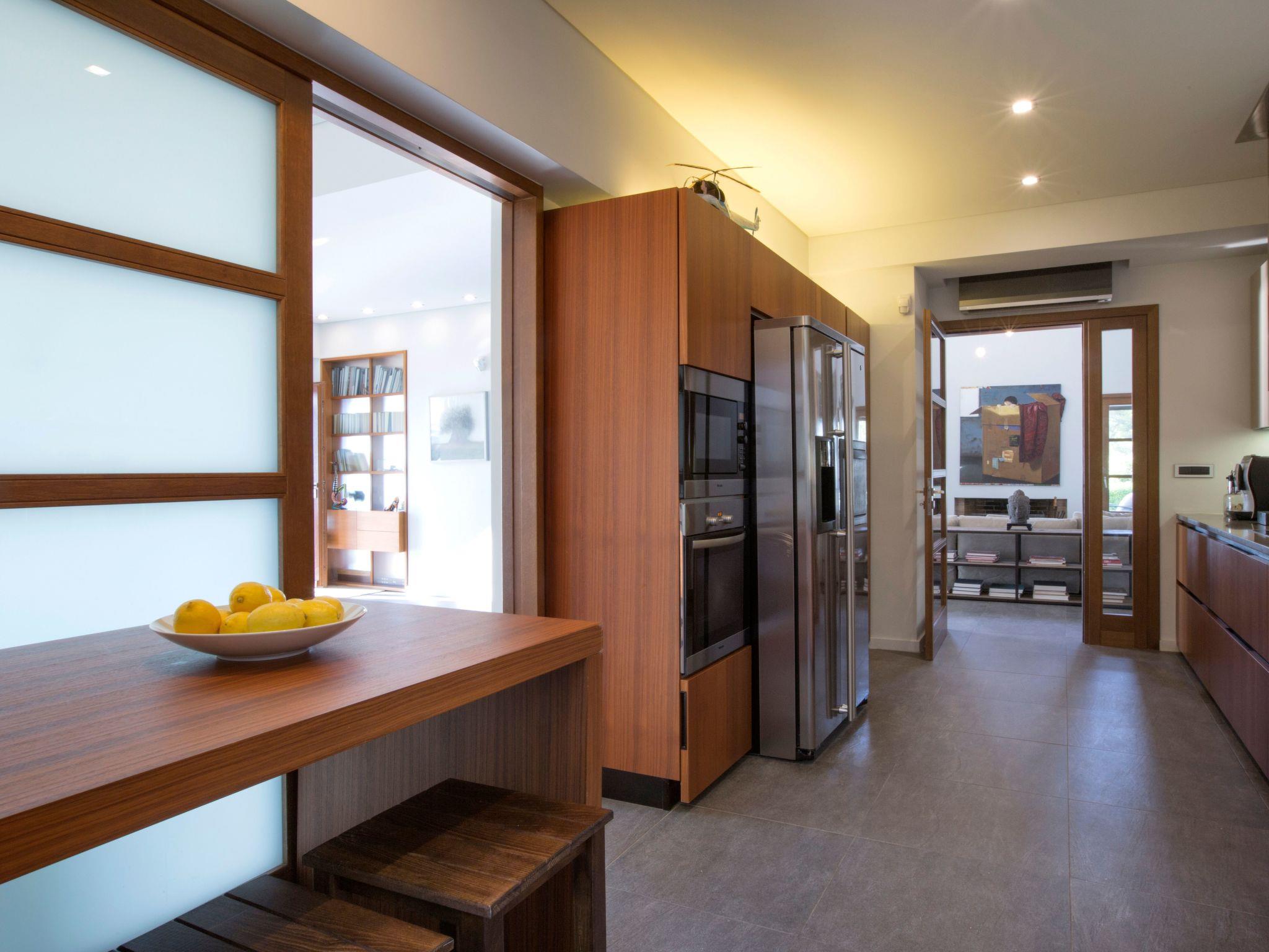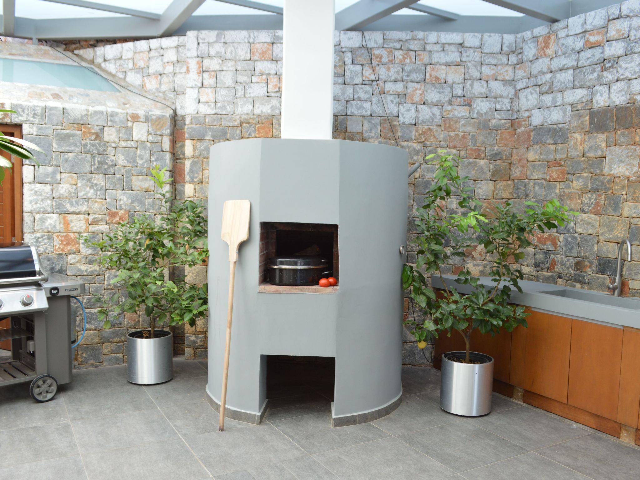 On the ground floor level there is a small, separate small studio consisting of a sleeping area with a queen size bed, an en-suite bathroom and a private living room with direct access to the swimming pool area. It can accommodate two more people if necessary with the use of a big convertible couch. Two separate living areas, the dining and the kitchen area are on this level too.