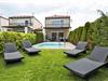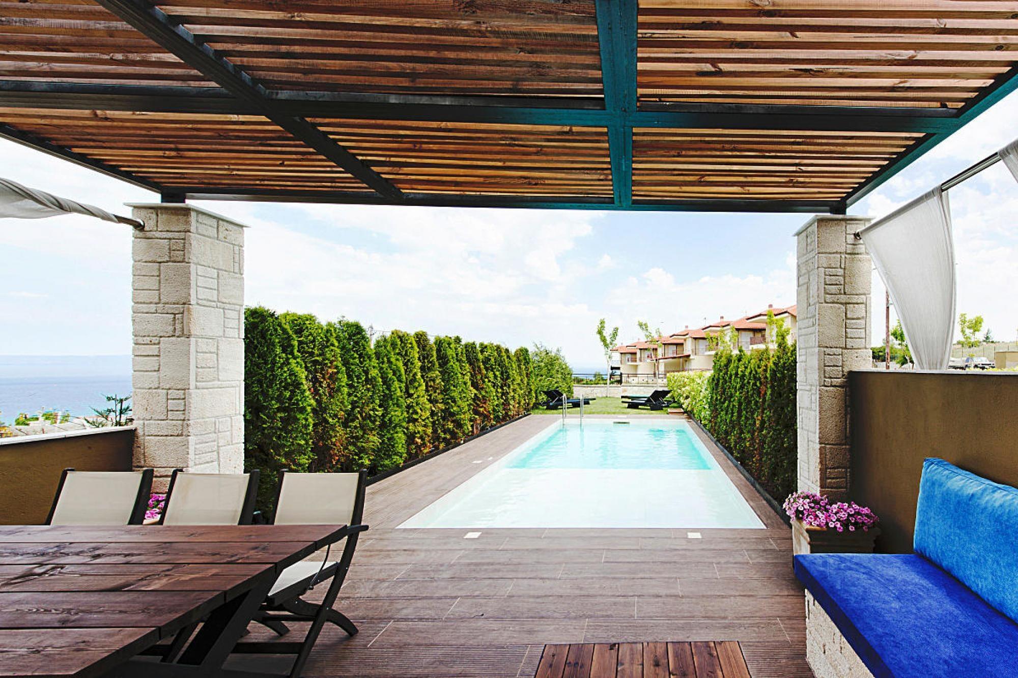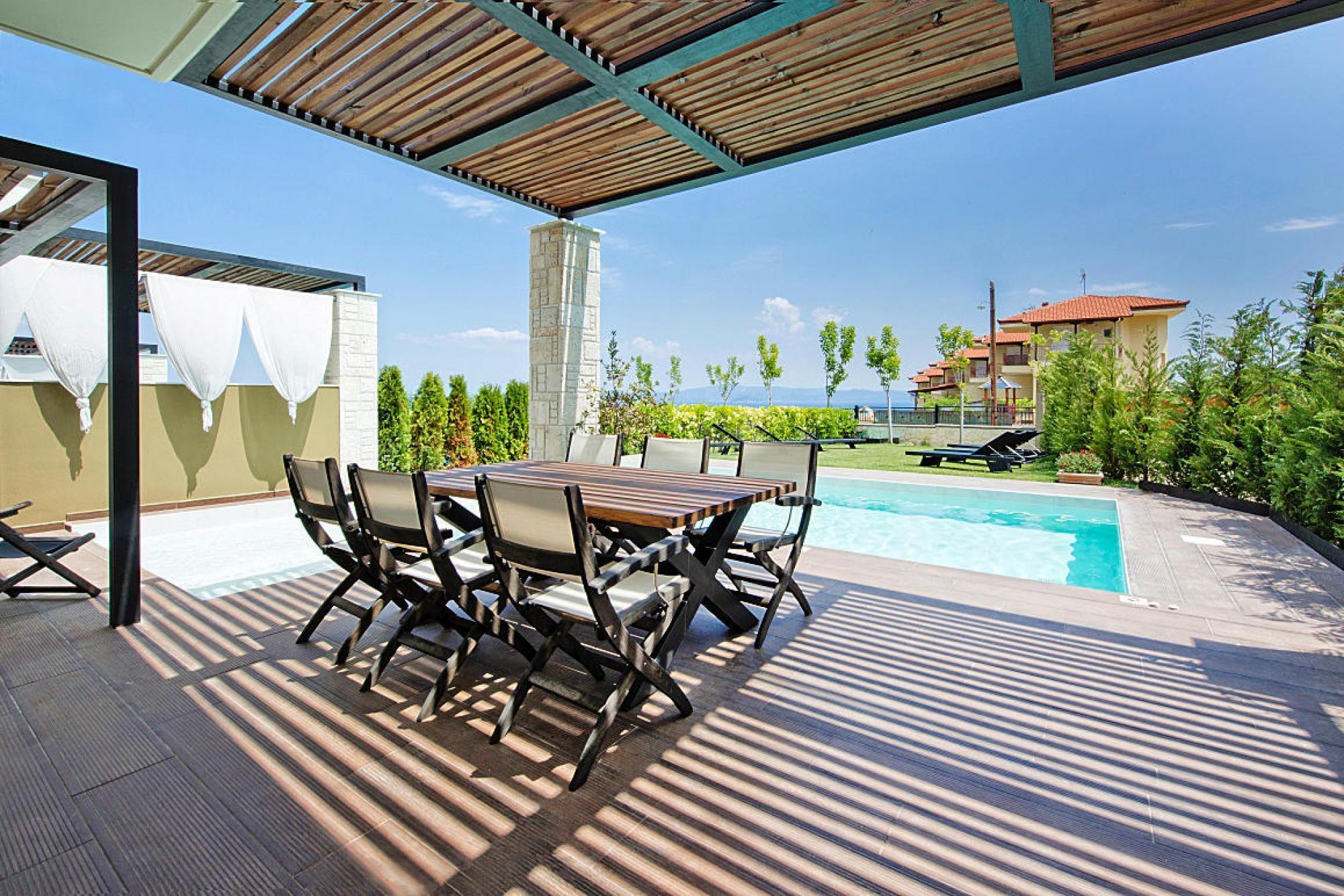 Luksuriøst villakompleks på en imponerende bjergskråning over Chanioti med en vidunderlig udsigt over det blå hav og den modsatte halvø Sithonia. De otte smagfuldt og komfortabelt indrettede feriehuse (bygget i 2014) har hver en velholdt have med en møbleret terrasse og en privat swimmingpool med hydromassage. Her kan du slappe af med en kølig drink og nyde fantastiske solopgange. Et resorts egen SPA med indendørs pool, sauna og fitnessrum er gratis til rådighed for dig. Forskellige wellness-behandlinger kan benyttes mod betaling. Den livlige turistby Chanioti med sin lange sandstrand og smukke promenade ligger omkring 1 km væk. Her finder du et godt udvalg af taverner, caféer, barer og butikker. opvarmet pool for 50 euro om dagen. Tjenester inkluderet: velkomstpakke TRÅDLØS INTERNETADGANG Regelmæssig shuttlebus til stranden og byens centrum Energiomkostninger, sengelinned, håndklæder, slutrengøring Mobilitet: Ikke egnet til personer med nedsat mobilitet