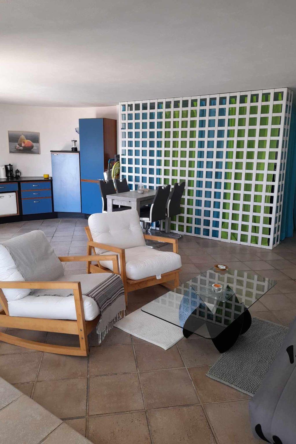 Open-plan kitchen with washing machine and dishwasher, living room with convertible sofa, dining room. The double bed is behind a beautifully decorated screen. In the bedroom with 2 single 115cm beds, a folding bed can be added if guests do not wish to use the convertible sofa for a possible 5th person. The bathroom is small but well designed with a walk-in shower. Fully air-conditioned. Bed linen and towels changed once every 7 nights. If you wish to stay more often, it is possible to rent