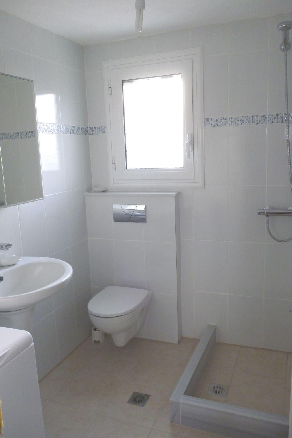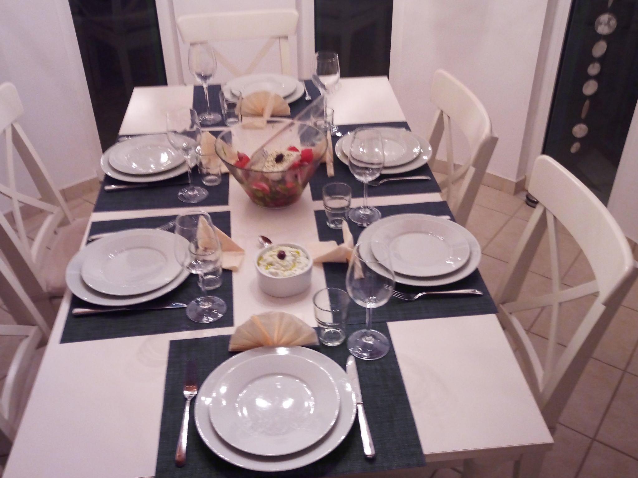 Folding loungers are available for sunbathing on the 50 square metre terrace, an awning as sun protection and a large table with six chairs for outside and just as many for the dining area inside invite you to linger. All windows are fitted with insect screens. The outdoor shower with hot water is a hit, while flowering bougainvilleas and oleanders next to the natural stone steps provide privacy. In front of the kitchen, a seating area with table and chairs between the olive tree and oleander invites you to enjoy the Mediterranean flora.