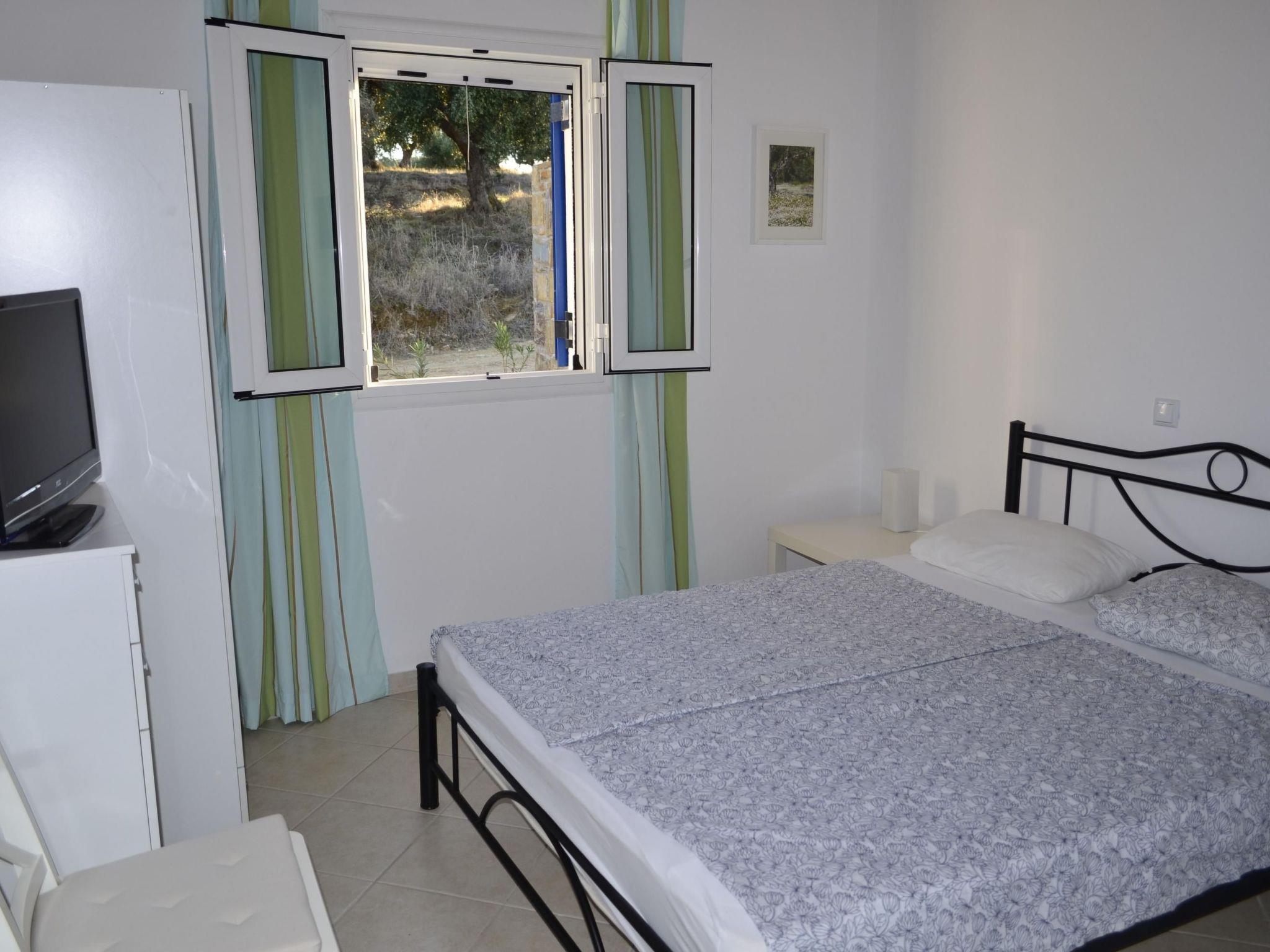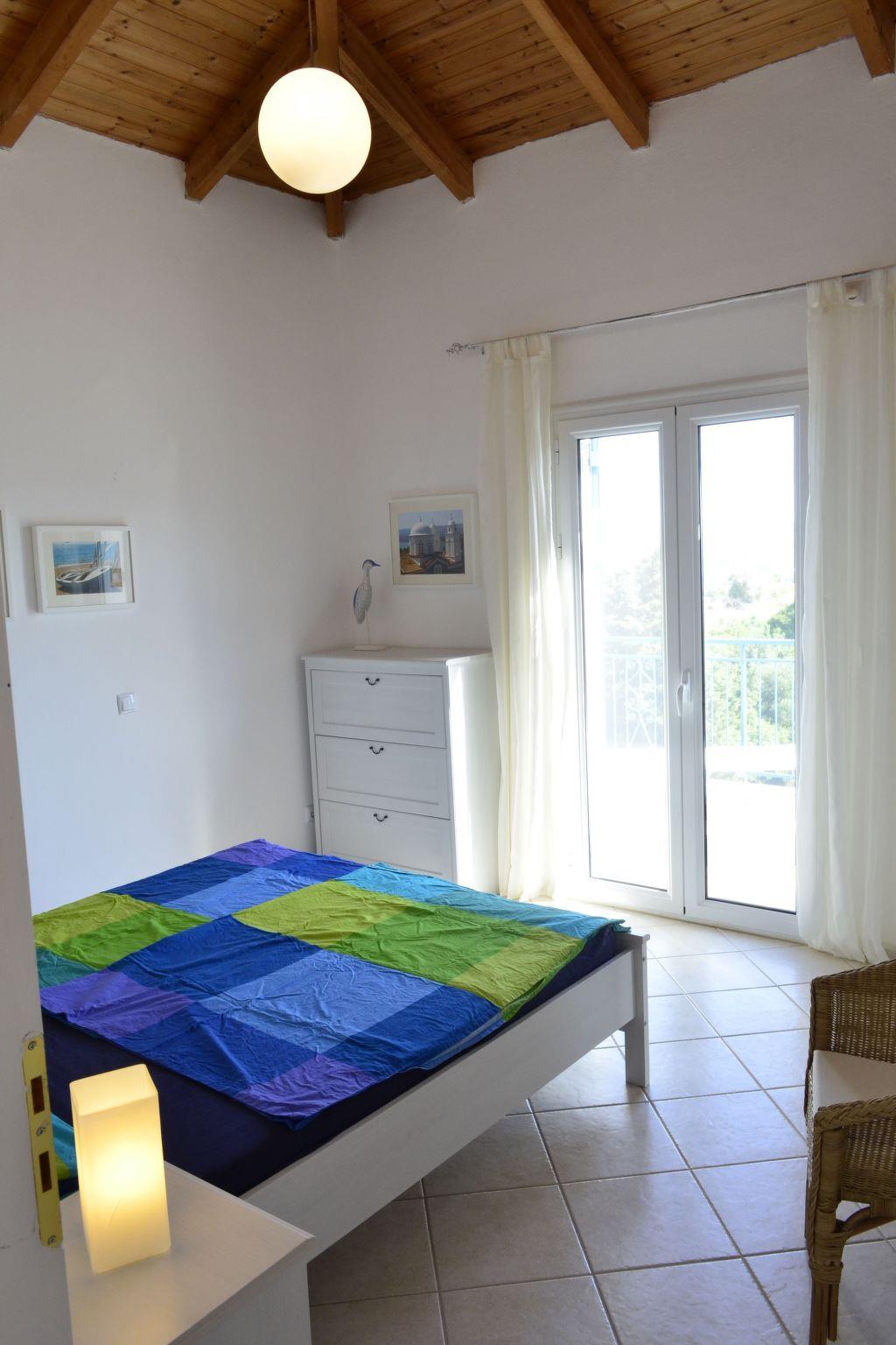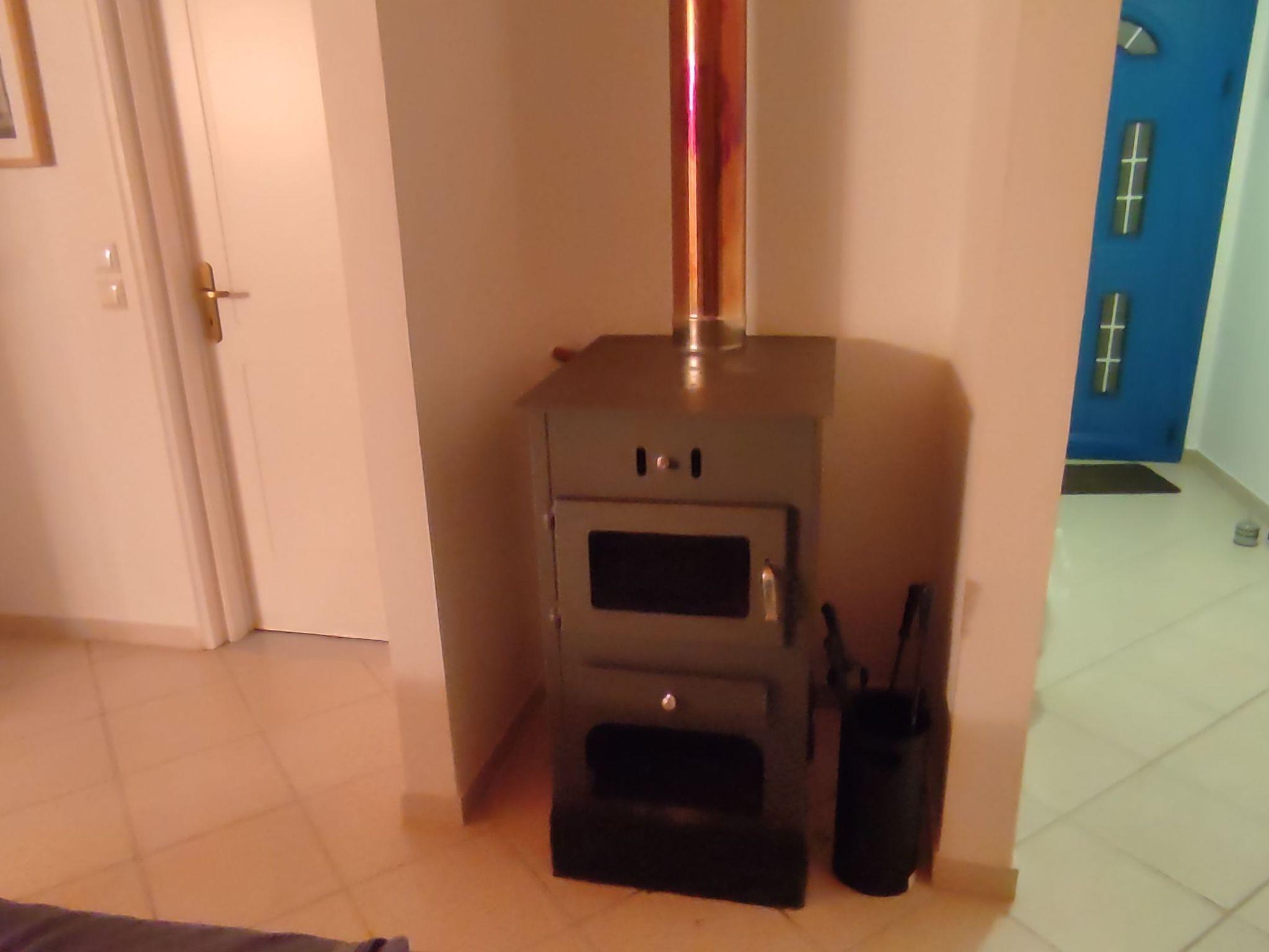 If you ever need heating at Villa Pilias, you have a few options: Firstly via the air conditioning in the 3 bedrooms or via fan heaters. Then via the underfloor heating, which is heated by the electric boiler in the cellar or the stove (with glass pane) in the living room. You then heat the underfloor heating with effective and inexpensive olive wood. In addition to a 42-inch TV panel with SAT reception in HD and a Blu-Ray player, you will also find a receiver with docking station for I-pad, I-phone etc. or USB stick. In one bedroom there is another HD flat screen TV and Internet access is available via a powerful mobile WLAN router with prepaid card, which can be topped up by the carer couple for a fee on request. There is a double bed in each of the three bedrooms. There is an L-shaped couch in the living room, which can easily be converted into a full sofa bed. In the master bedroom you may be woken up in the morning by a crowing cock and the Greek sun shining right into the double bed, you open your eyes and look out over the sea from your bed - or not, if you have closed the thick aluminium shutters and the double-glazed door - Villa Pilias is located in the countryside. Of course, you can also cook for yourself in the fully equipped kitchen, for example with recipes from a Greek cookery book, which can be found in the well-stocked bookcase. In addition to a dishwasher, toaster, kettle, fridge, 3 coffee machines and 2 electric grills, there is of course plenty of crockery available. In the villa, four people shower at the same time with 130 litres of water heated up to 70 degrees from the solar collector or from the electric boiler. The main bathroom has a double shower and two washbasins. There is also a washing machine in the second bathroom with shower and WC.