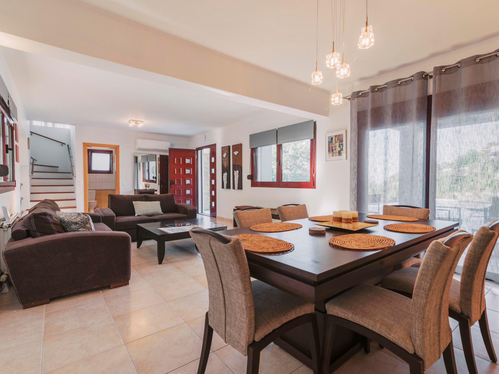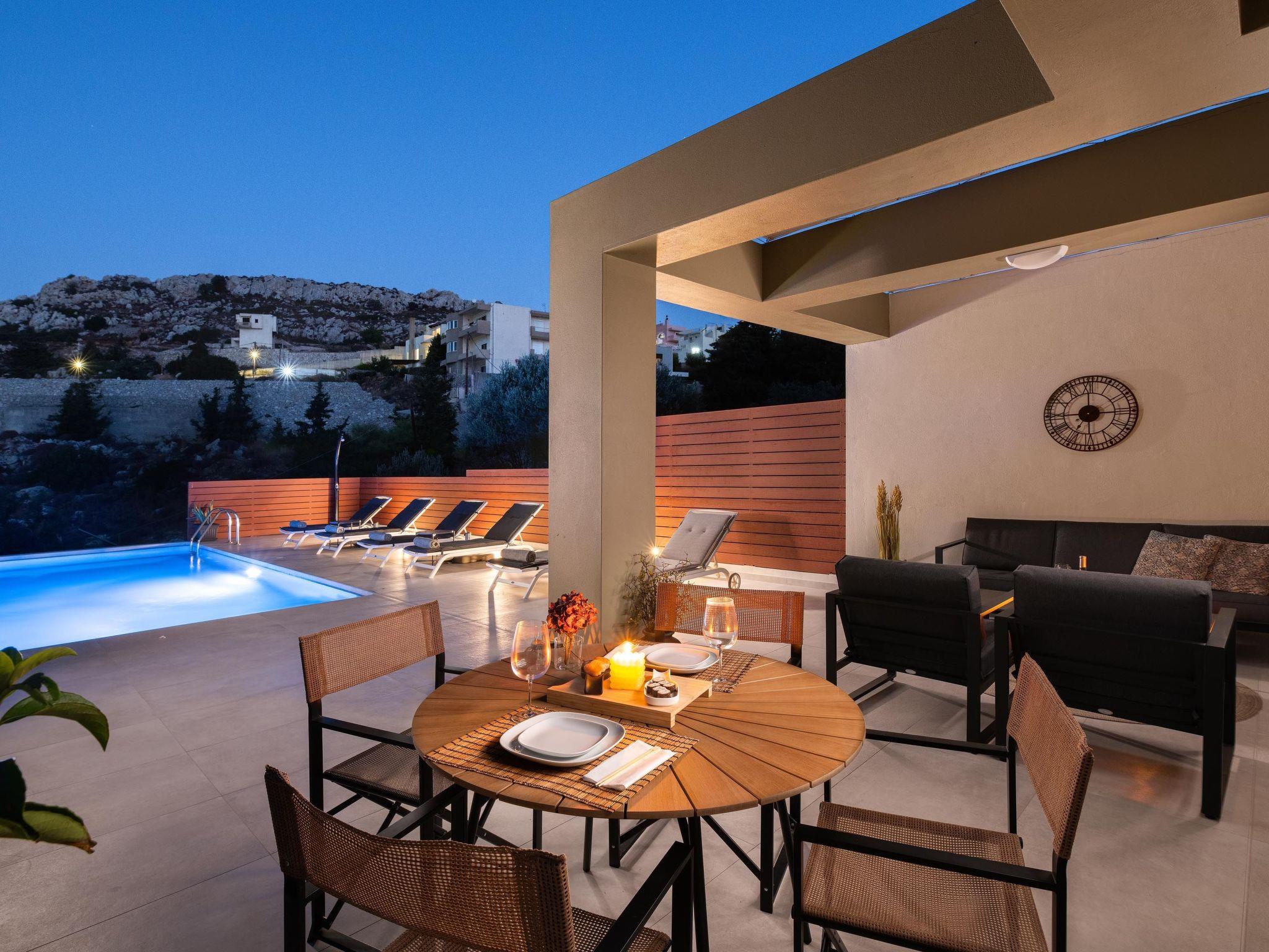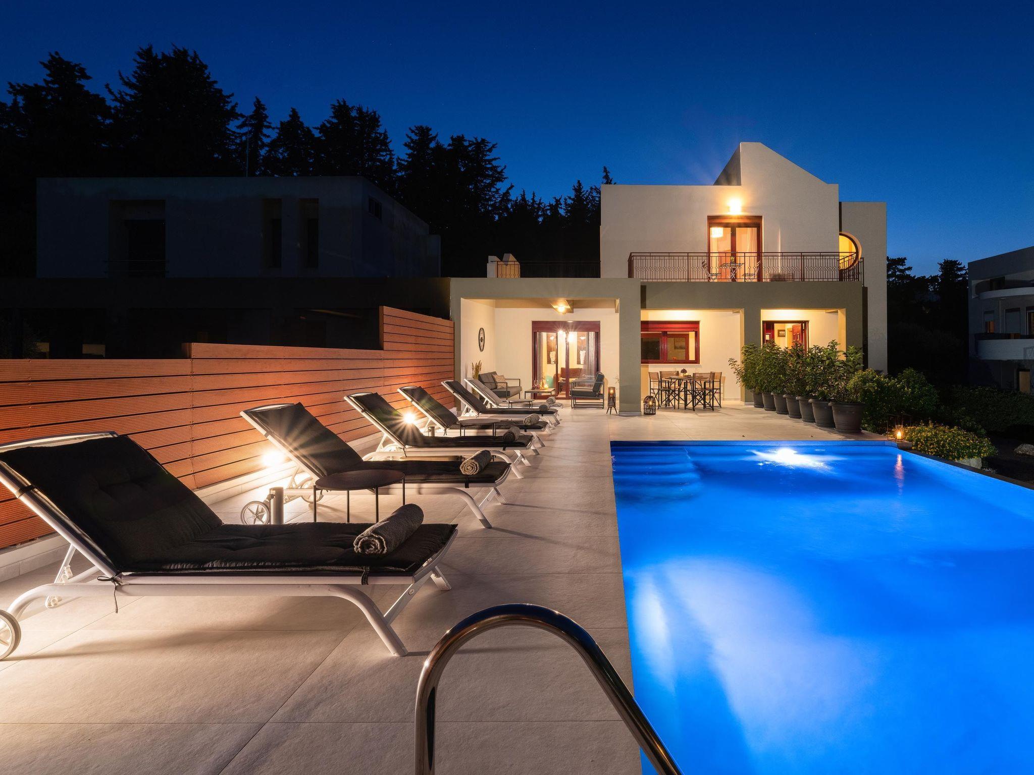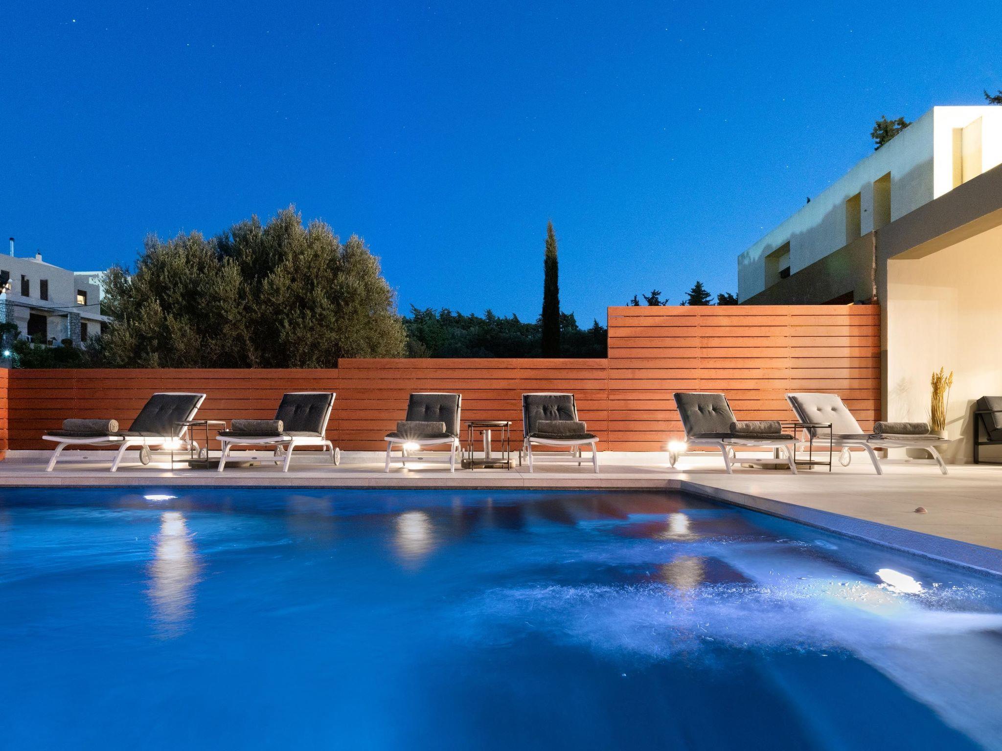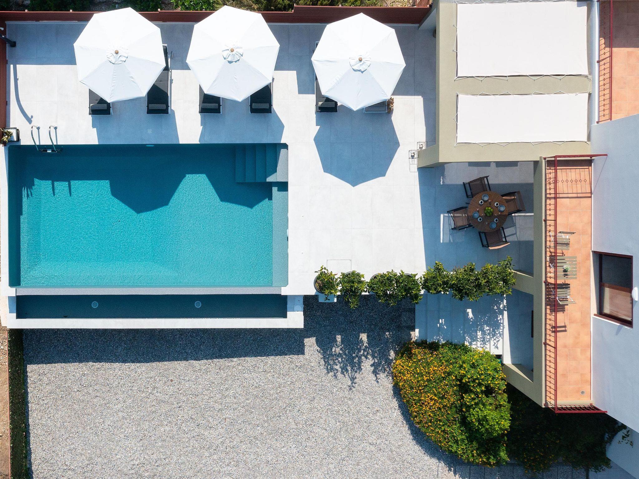 Step outside, and the villa continues to impress. The expansive outdoor area boasts a magnificent private pool surrounded by lush greenery, complete with sun loungers and parasols — an idyllic spot to soak up the golden Greek sun.