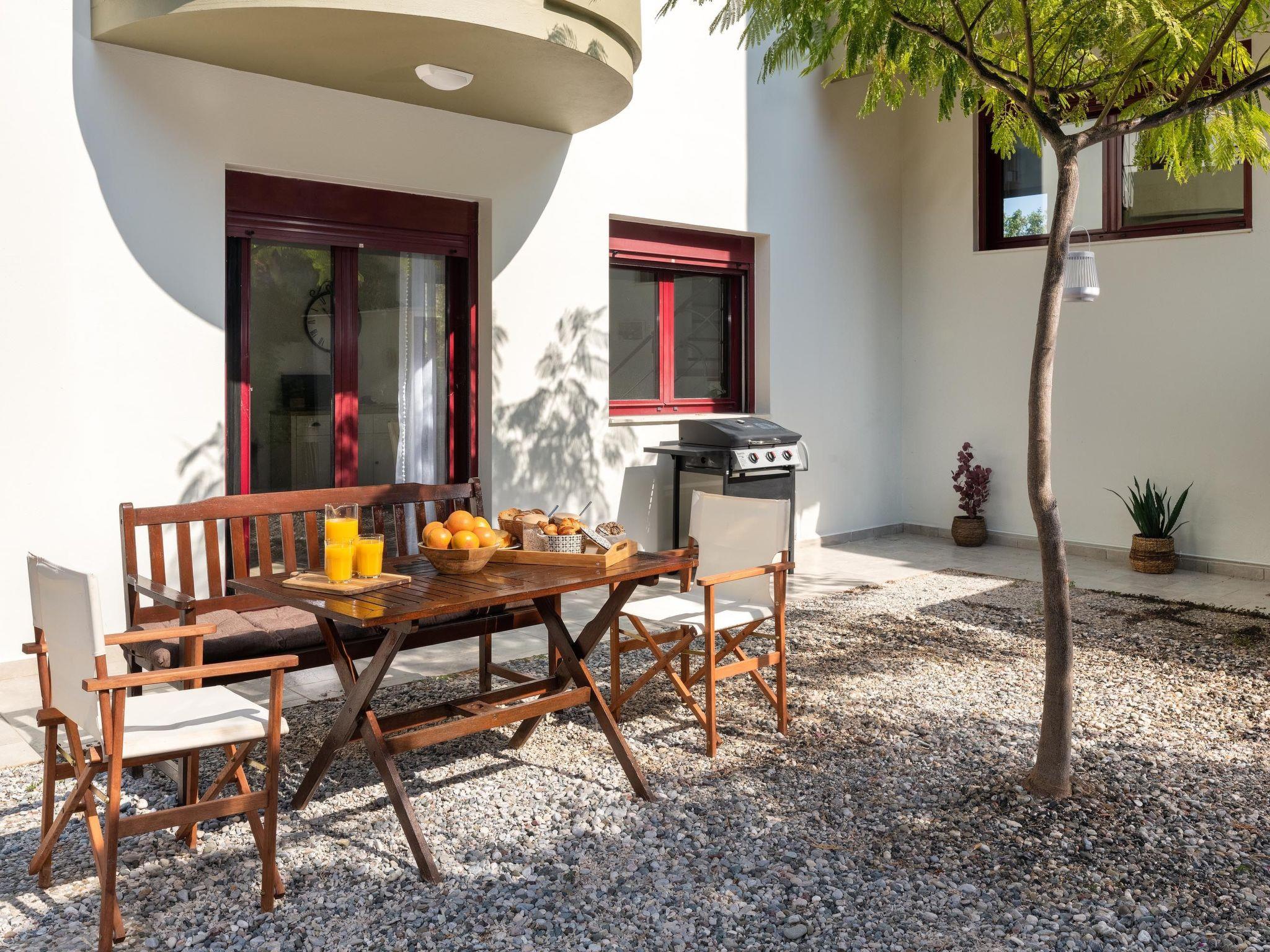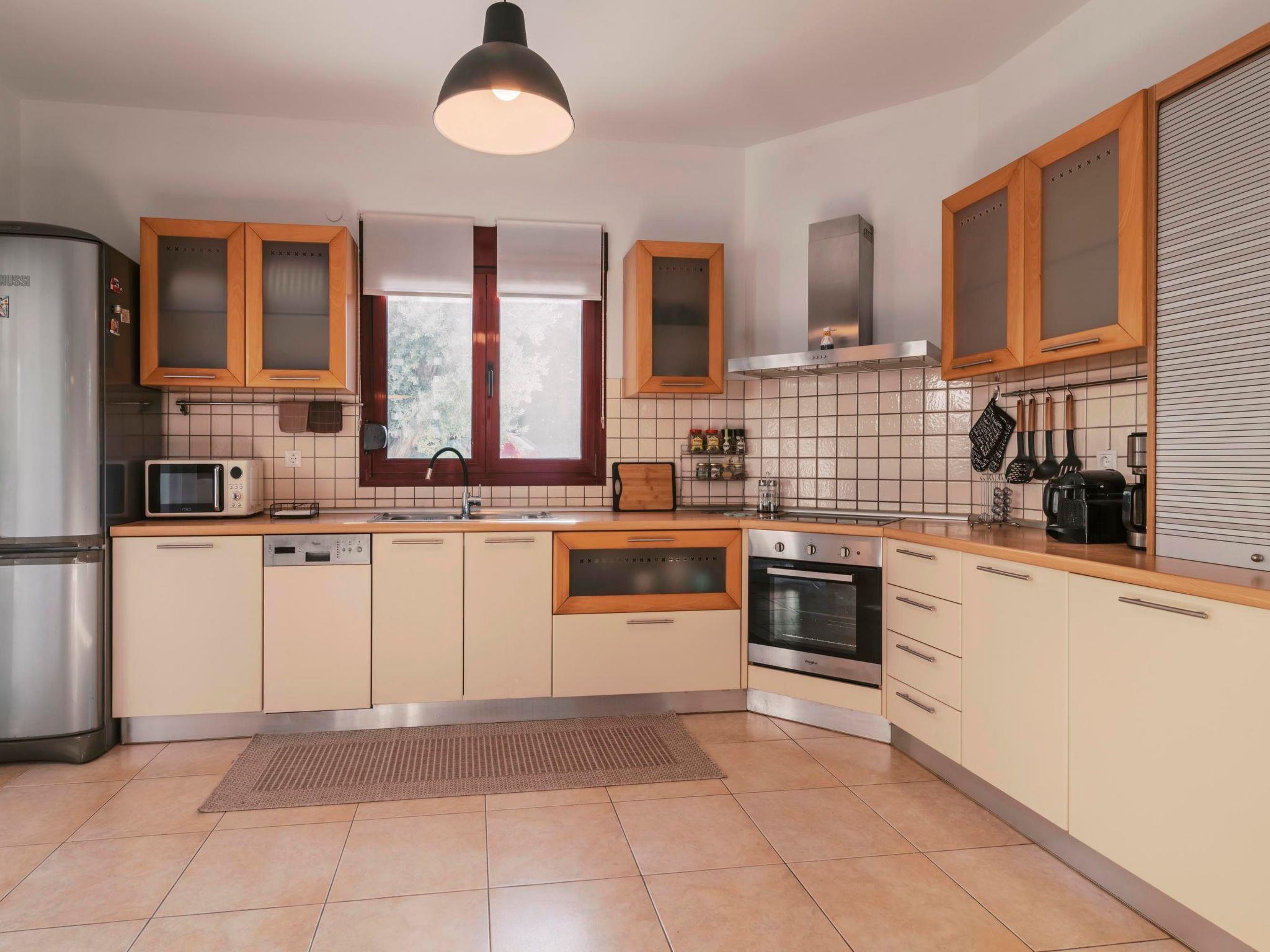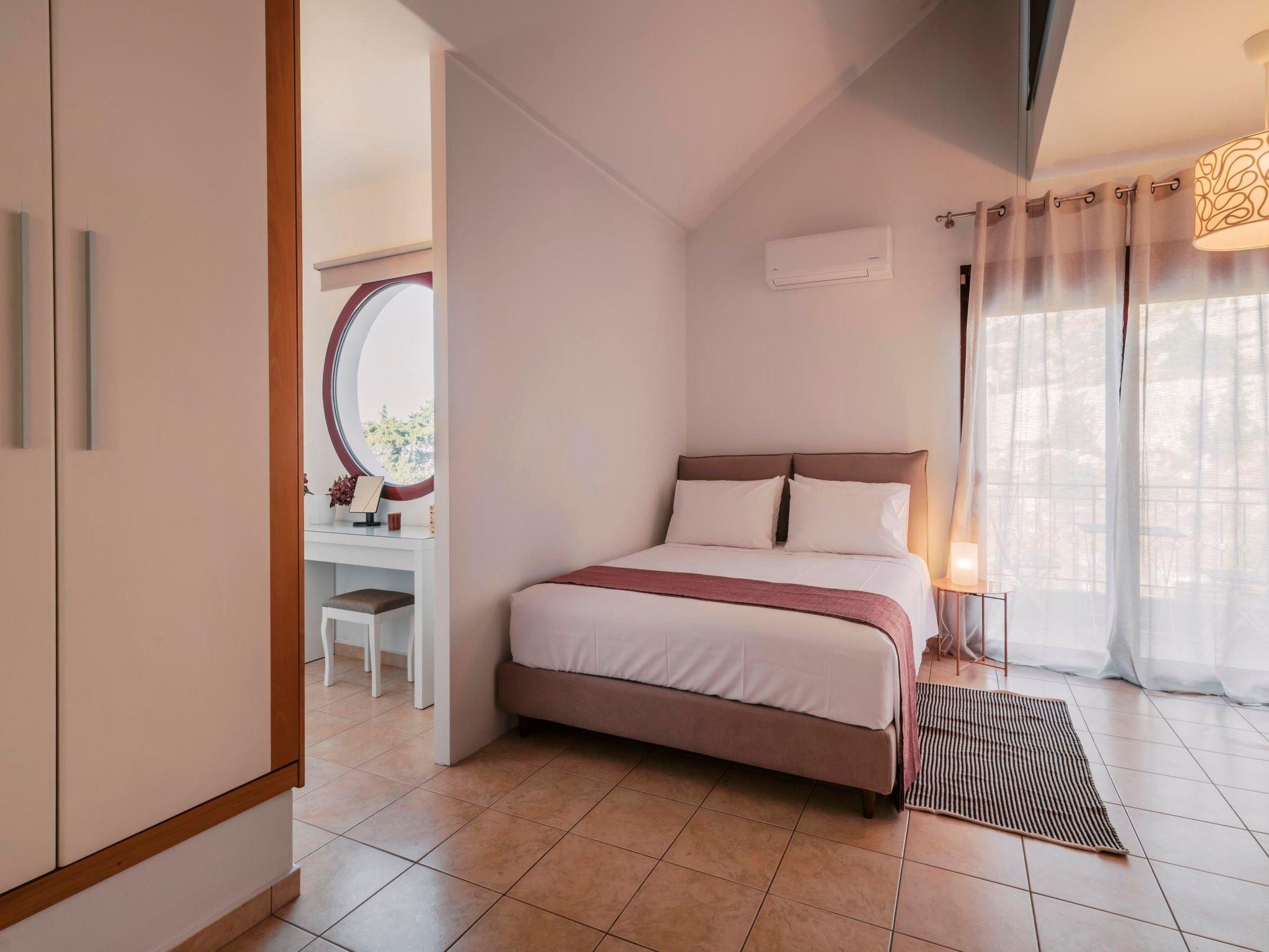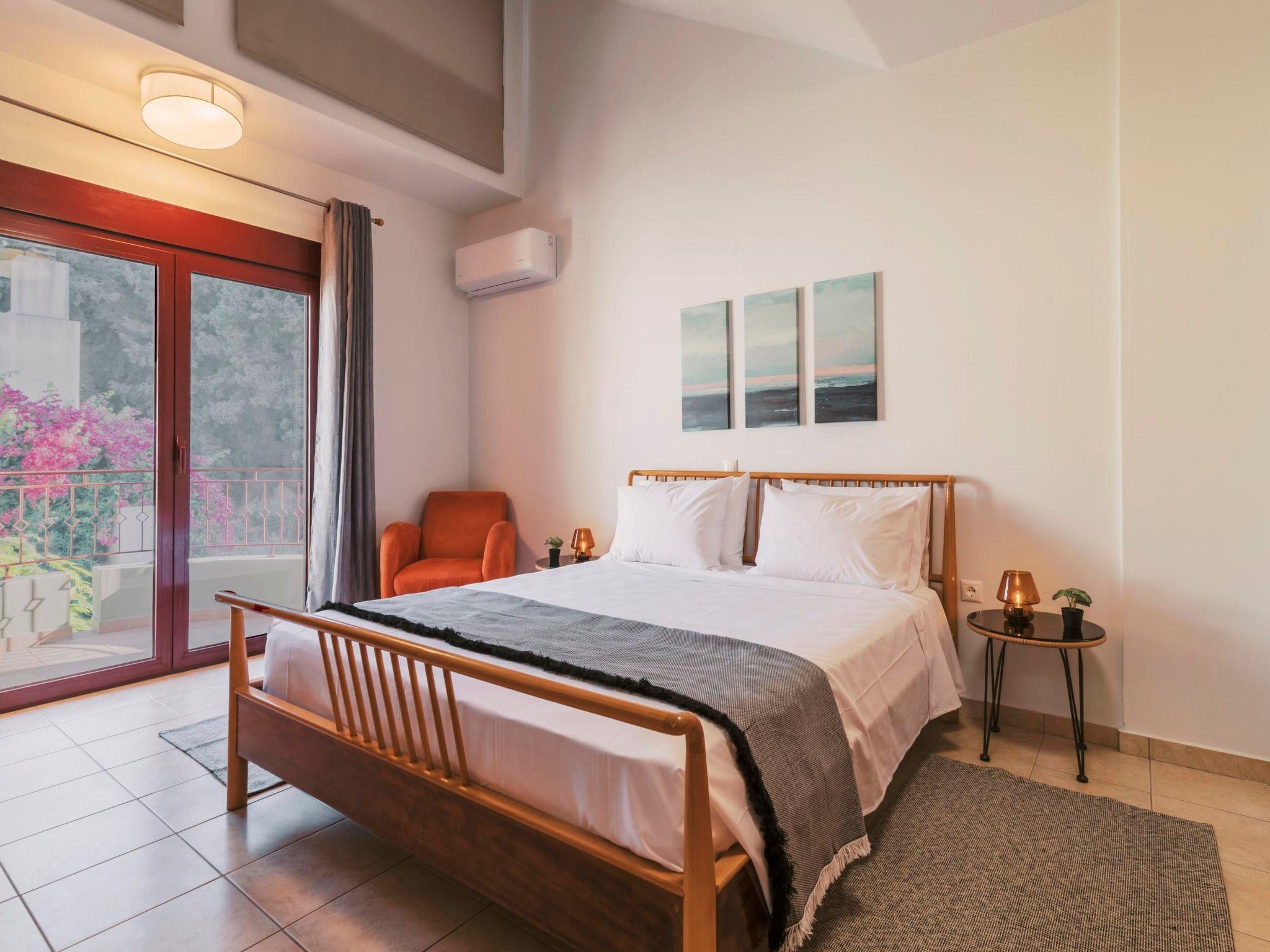 The open-plan kitchen is fully equipped and thoughtfully designed in warm hues, ideal for preparing meals of any kind. Adjacent to the kitchen is a welcoming sitting area, perfect for relaxing or entertaining. The spacious living room, decorated in soothing natural tones, invites guests to unwind in a calm and peaceful environment. Complimentary Wi-Fi is available throughout the property.