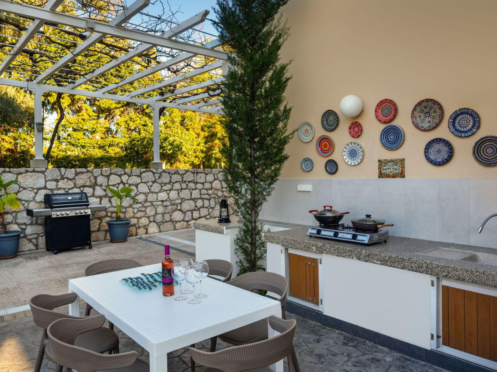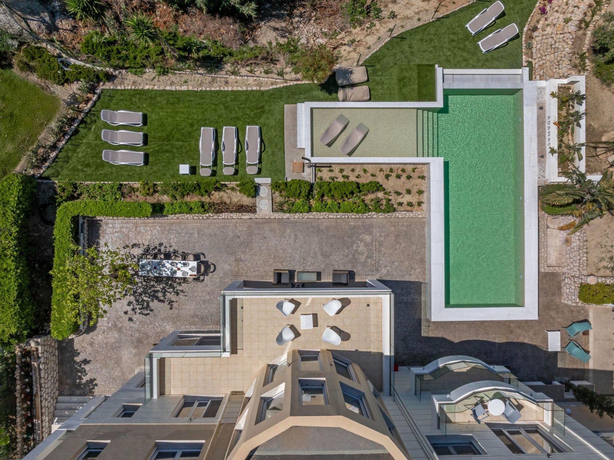 The villa’s outdoor area is just as impressive, featuring a large swimming pool for adults and a smaller pool for children, surrounded by comfortable sunbeds and elegant outdoor furniture. A shaded pergola offers a serene spot for lounging or dining al fresco, and the gas BBQ enhances the outdoor living experience.