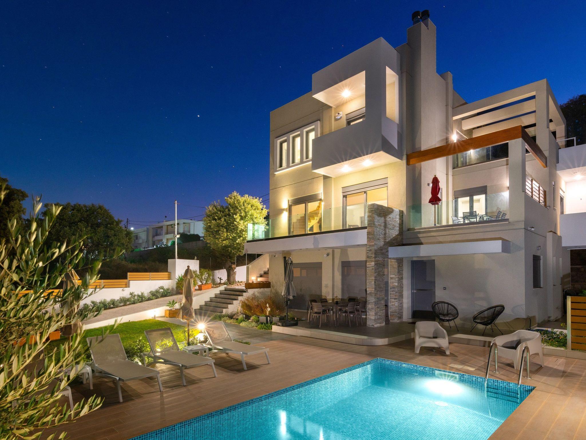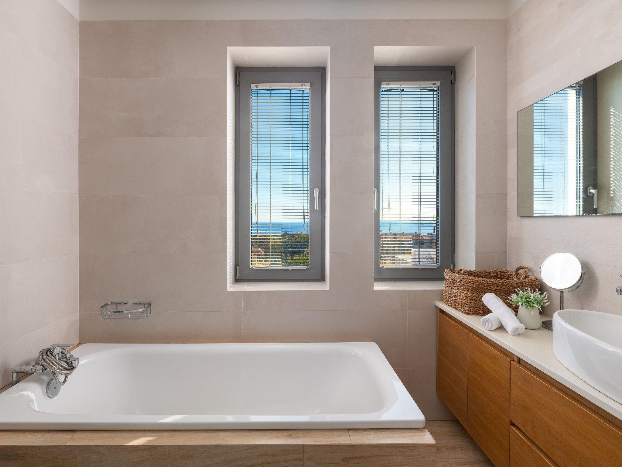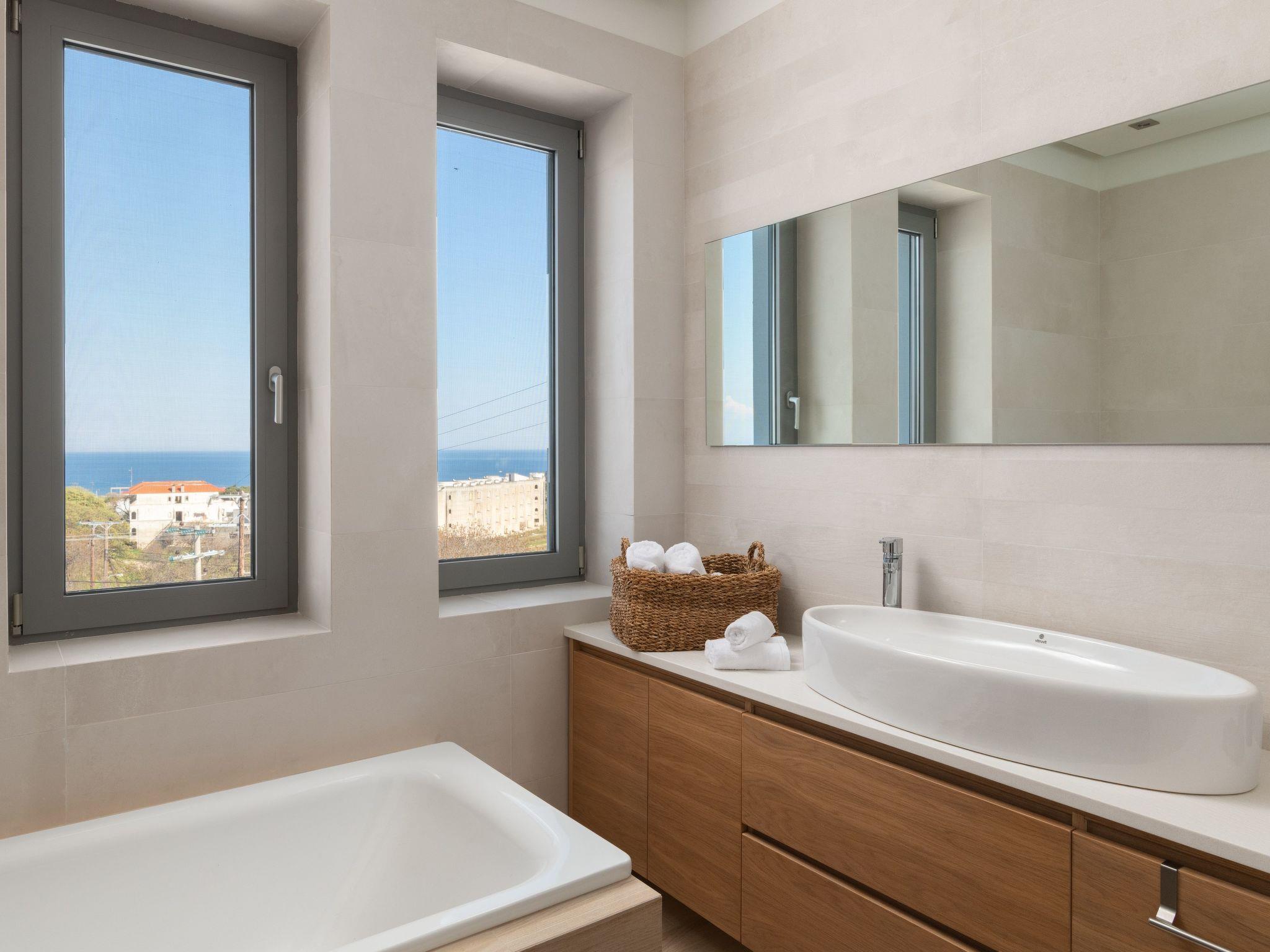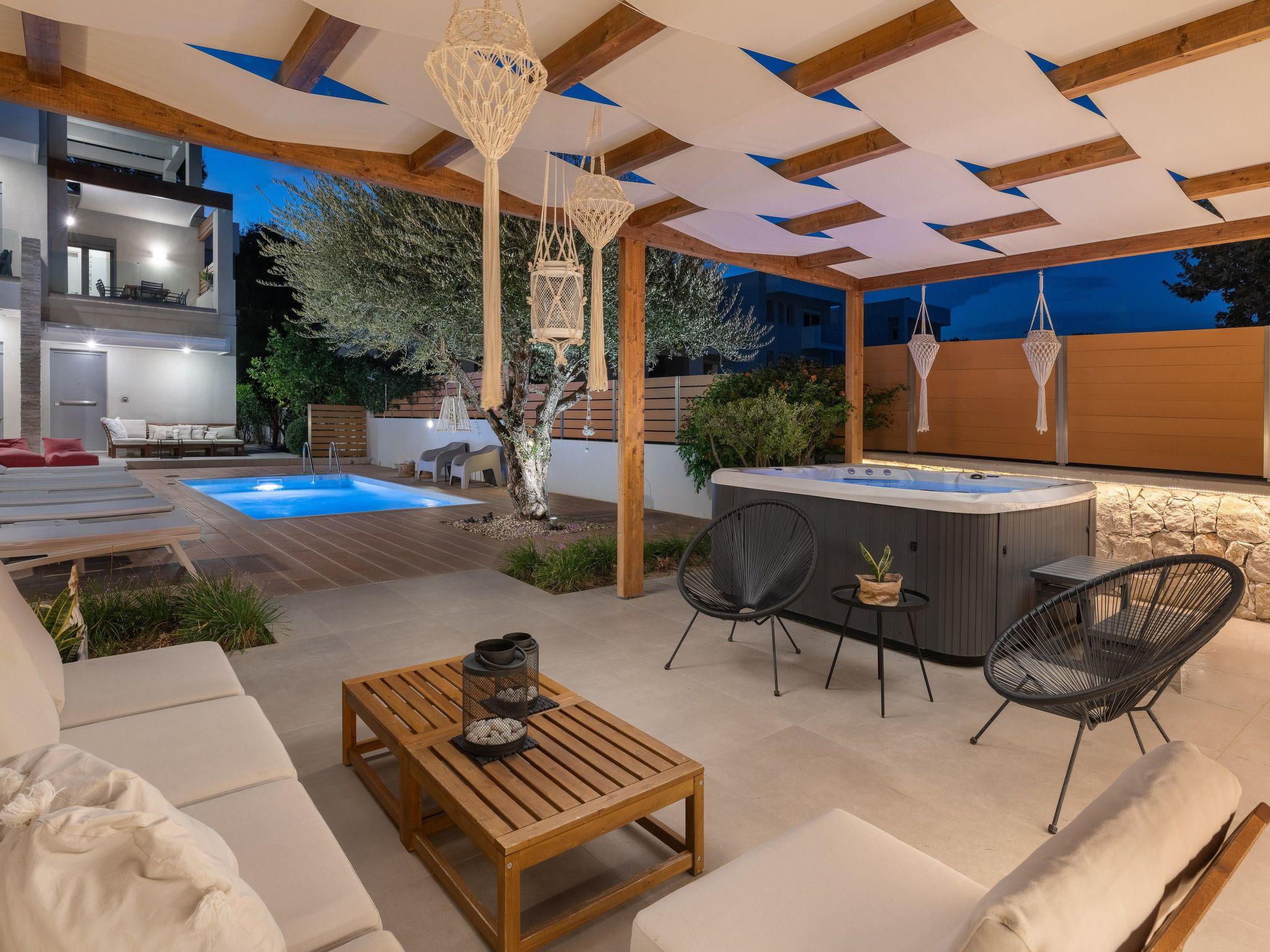 The four-bedroom villa provides 3 modern rooms with a double bed, and 1 room with two single beds. The main bedroom includes an ensuite bathroom with a stylish shower. Each bedroom has a beautiful balcony and a flat screen. The villa’s living space with a minimal decoration is comprised of an open plan modern kitchen and a comfy living room with a flat screen with cable channels. High quality furniture will help you relax and enjoy in-house leisure time, while the fully equipped kitchen is standing by for any meal preparation along with the cozy dining area. Also, there are 2 bathrooms, one of them with a bathtub and the other one with a shower. Guests can have free Wi-Fi access throughout the property. The outdoor spaces of the villa offer a magnificent swimming pool & heated jacuzzi, equipped with sunbeds and parasols so you can enjoy the island’s soothing sun and work on your tan. The kitchen is complimented by the BBQ installation surrounded by the beautiful garden, along with all the necessary utensils and outdoor furniture. Also, the villa offers a ping pong for fun moments with your loved ones.