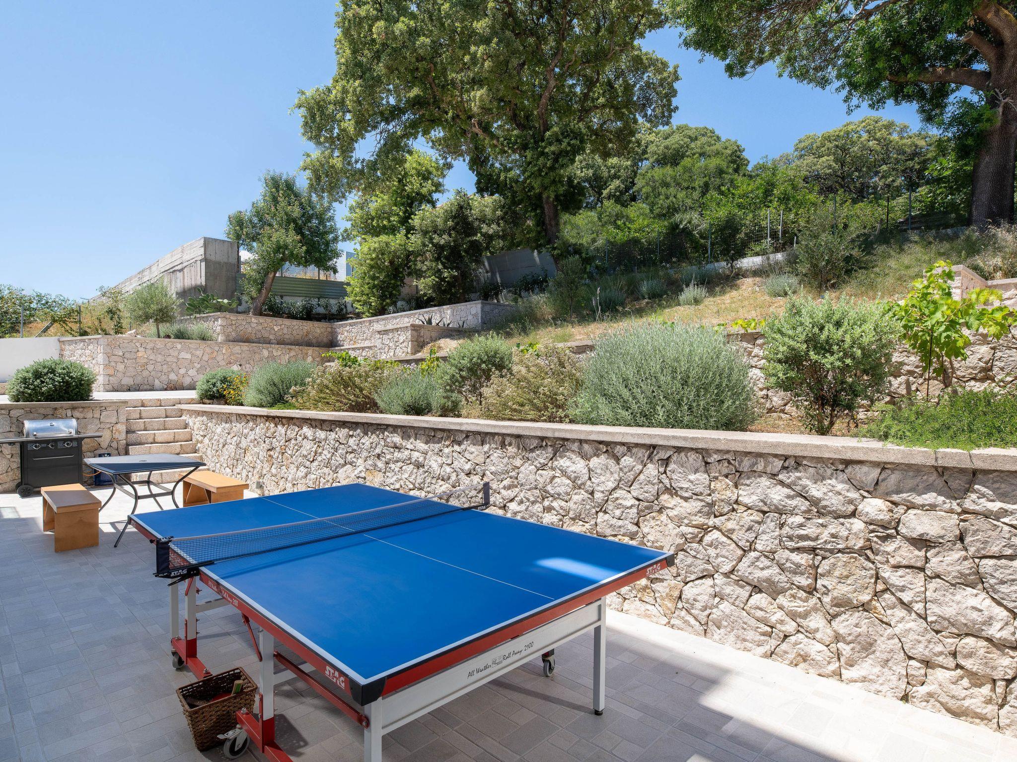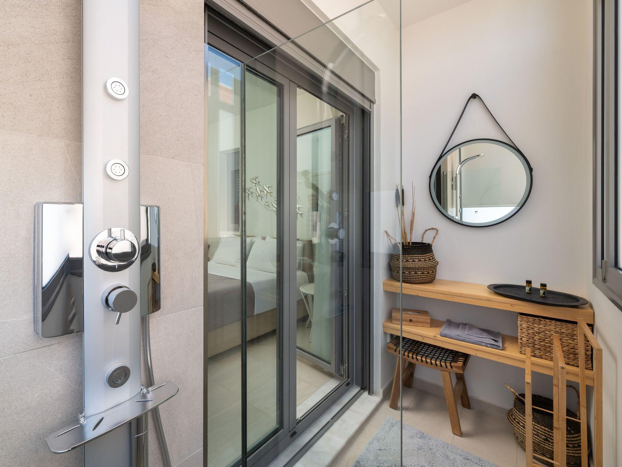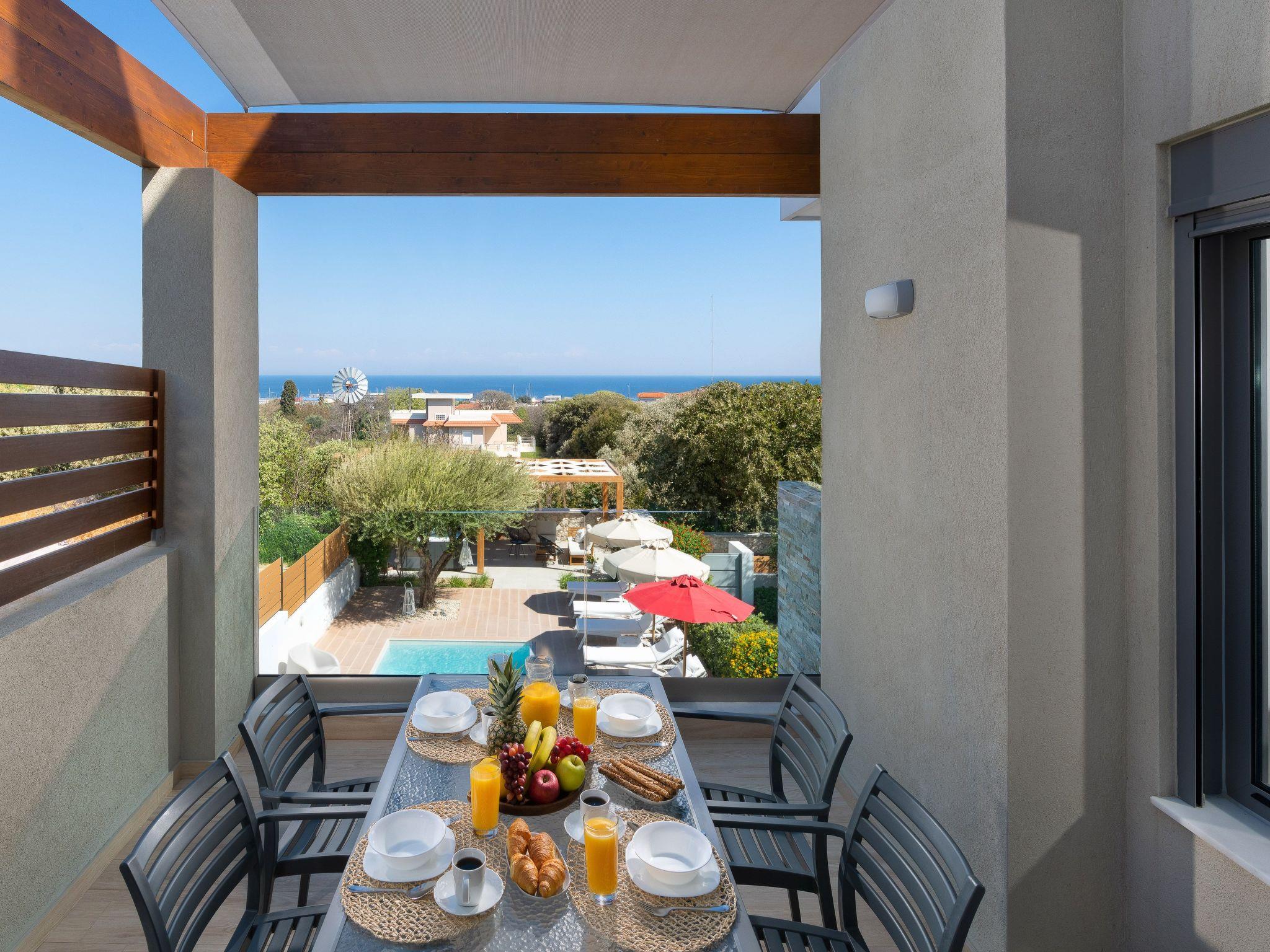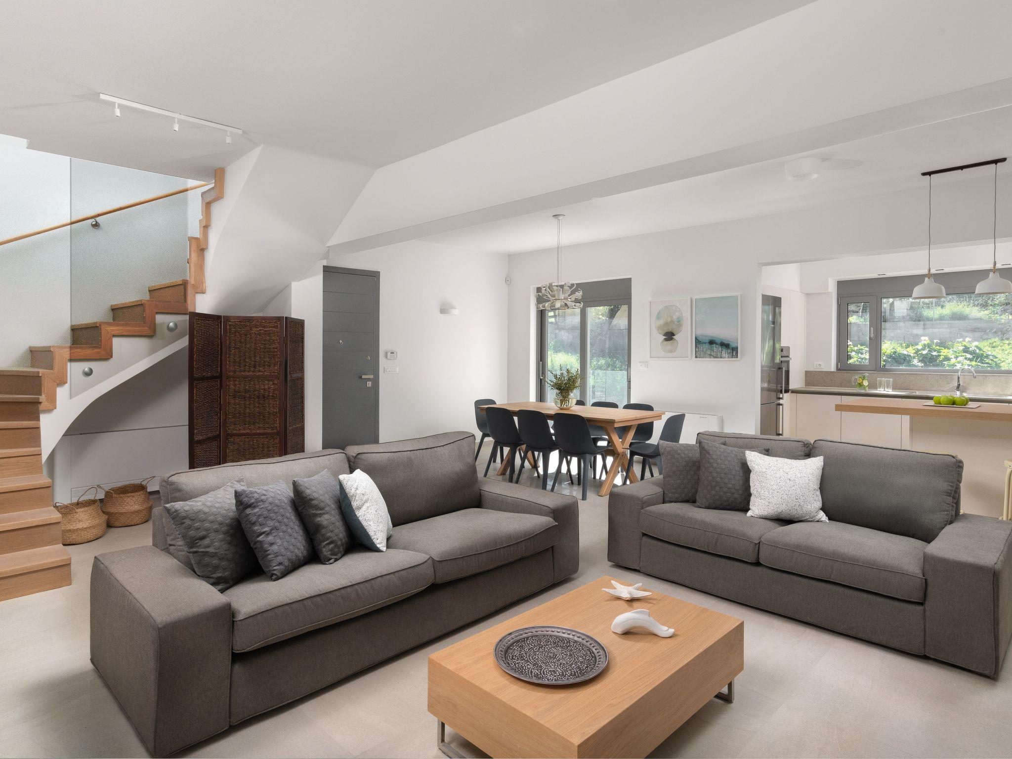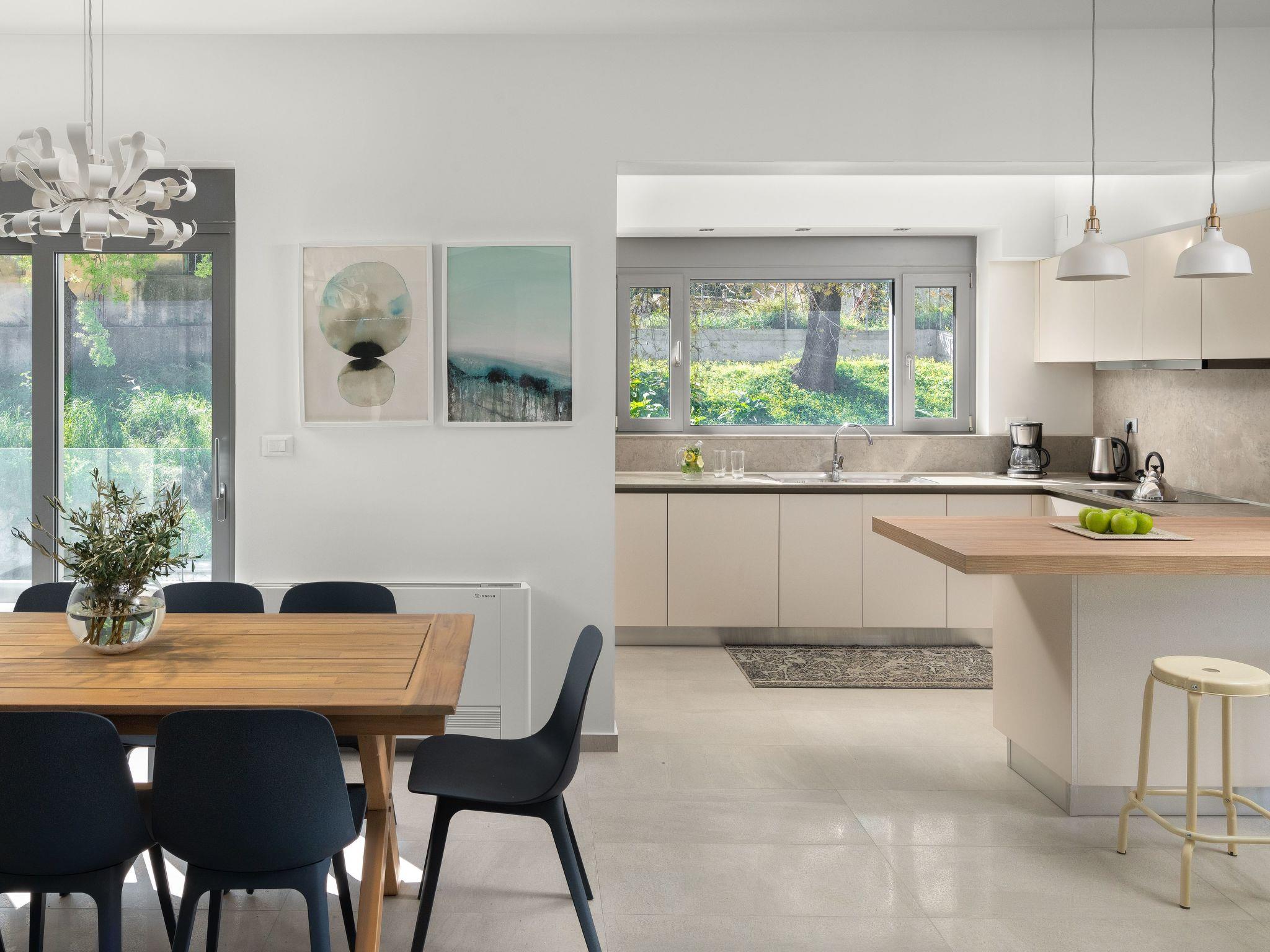 The four-bedroom villa provides 3 modern rooms with a double bed, and 1 room with two single beds. The main bedroom includes an ensuite bathroom with a stylish shower. Each bedroom has a beautiful balcony and a flat screen. The villa’s living space with a minimal decoration is comprised of an open plan modern kitchen and a comfy living room with a flat screen with cable channels. High quality furniture will help you relax and enjoy in-house leisure time, while the fully equipped kitchen is standing by for any meal preparation along with the cozy dining area. Also, there are 2 bathrooms, one of them with a bathtub and the other one with a shower. Guests can have free Wi-Fi access throughout the property. The outdoor spaces of the villa offer a magnificent swimming pool & heated jacuzzi, equipped with sunbeds and parasols so you can enjoy the island’s soothing sun and work on your tan. The kitchen is complimented by the BBQ installation surrounded by the beautiful garden, along with all the necessary utensils and outdoor furniture. Also, the villa offers a ping pong for fun moments with your loved ones.