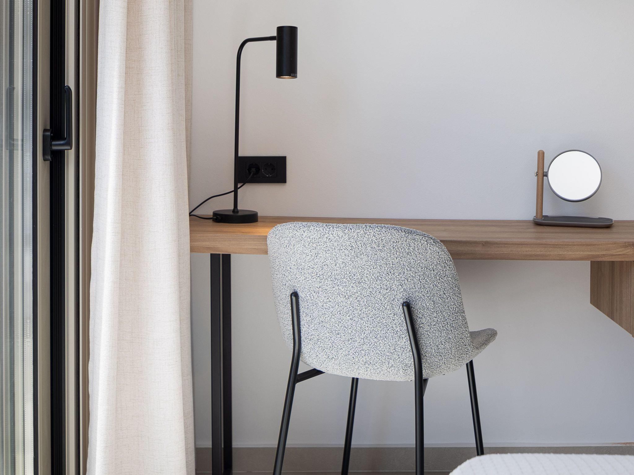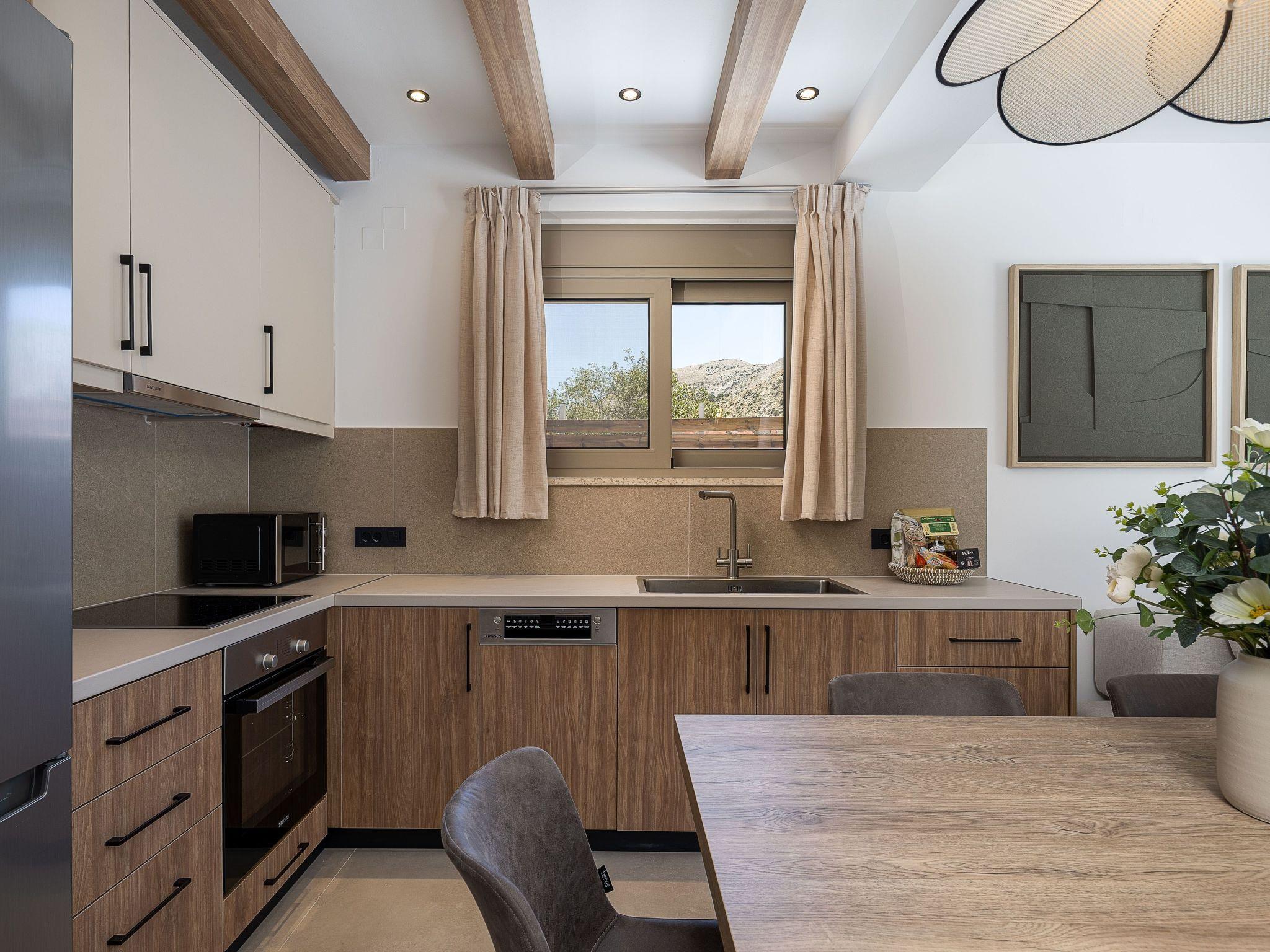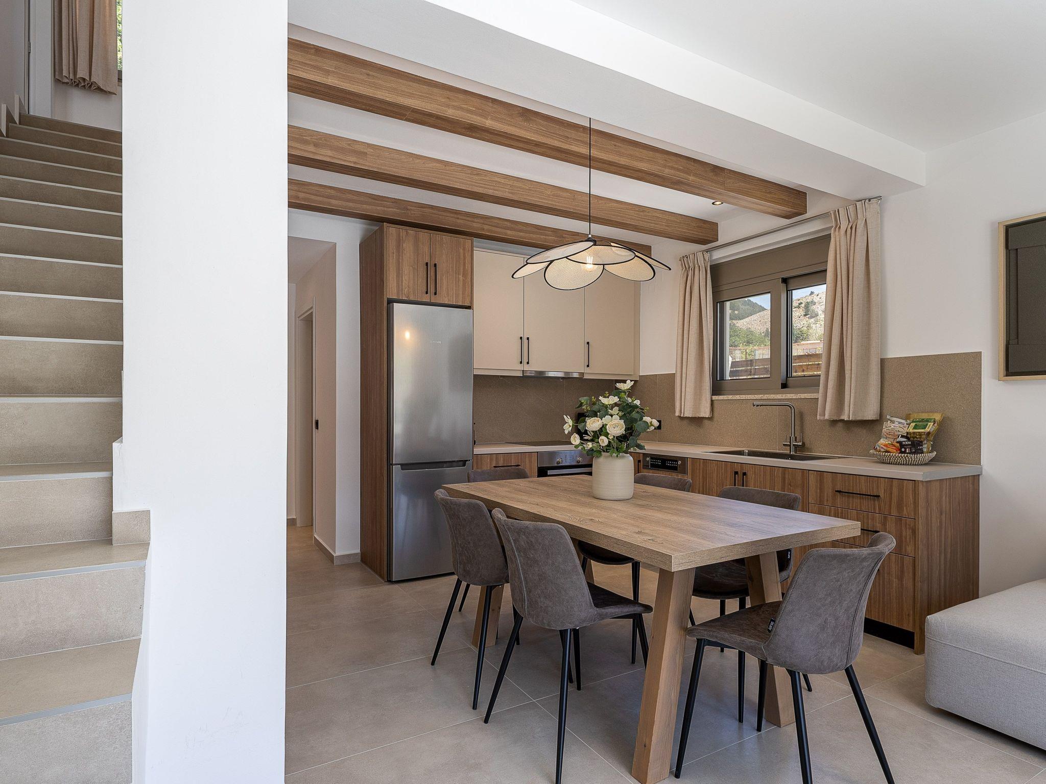 The villa spans approximately 86 sqm of indoor living space and 124sqm of outdoor area, making it ideal for groups or families. The villas feature a spacious open-plan living area, where guests can relax on a comfortable sofa while enjoying modern amenities such as a 50’’ Smart TV with satellite channels. Large sliding doors provide access to private terraces or the pool area, creating an easy flow between the indoor and outdoor spaces. The villa has a fully functional kitchen, allowing guests to prepare meals with ease, and the dining area offers a welcoming space for shared meals.