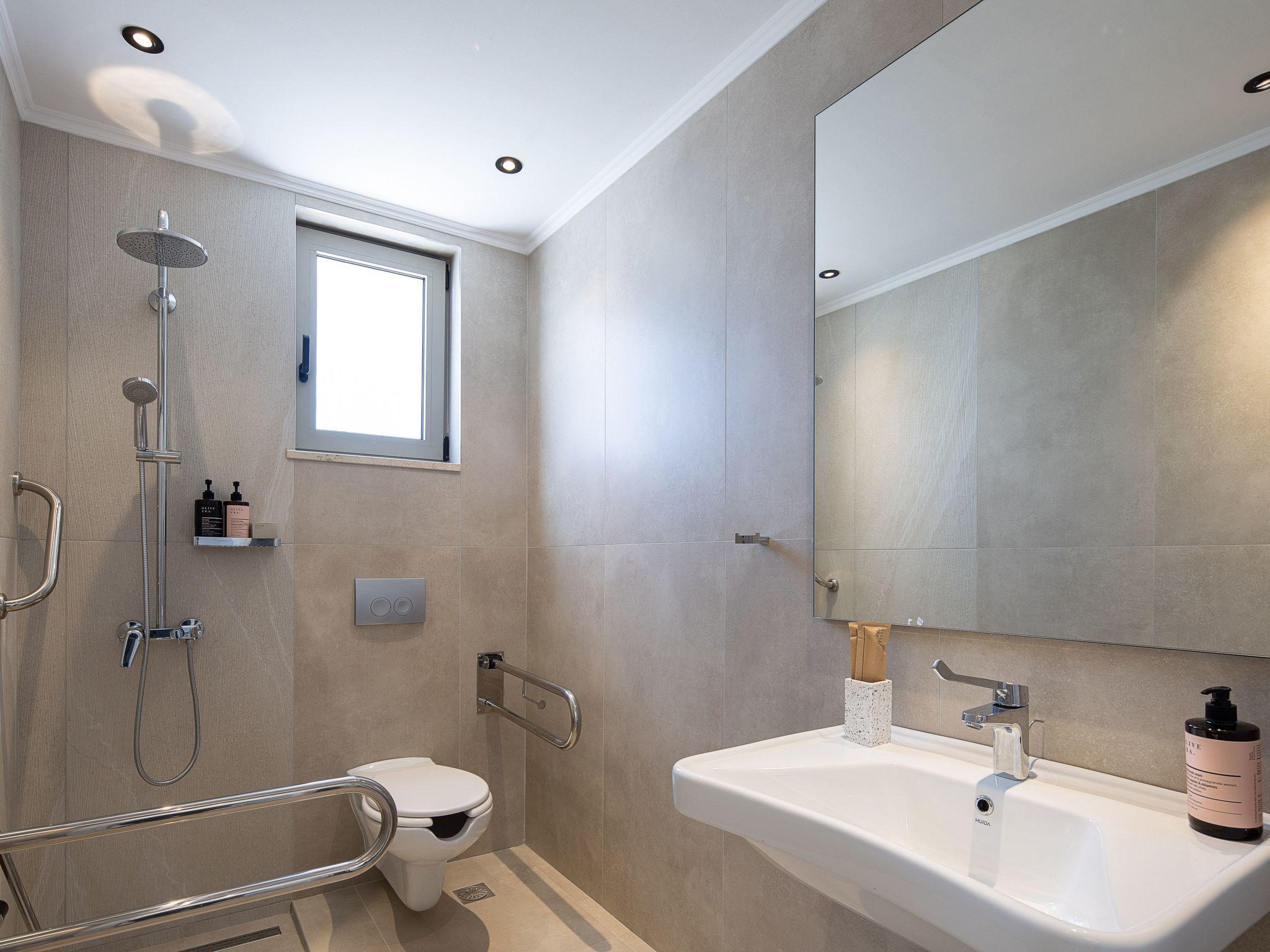 The ground level of the villa includes one beautifully designed bedroom, featuring a king-size bed, air conditioning, and direct access to the yard. This bedroom offers a private ensuite bathroom, complete with a shower. A communal bathroom with a shower is also available on this level.