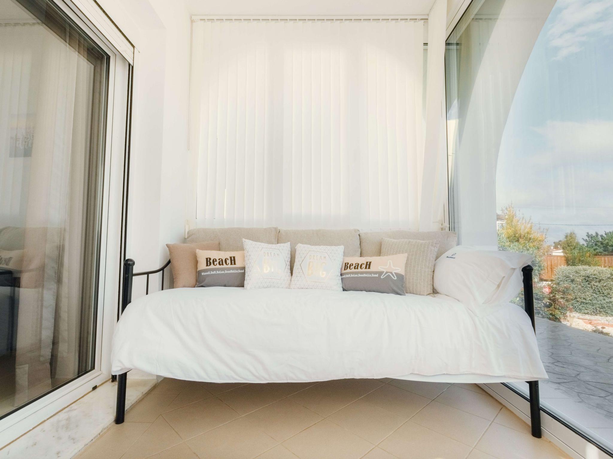 Our beautifully designed Villa is fully furnished and equipped. The sleeping quarters are on the upper floor, with two bedrooms and private large balconies. There is a fully equipped kitchen, a living room with a fireplace and a flat-screen TV, a dining area and a sun room.