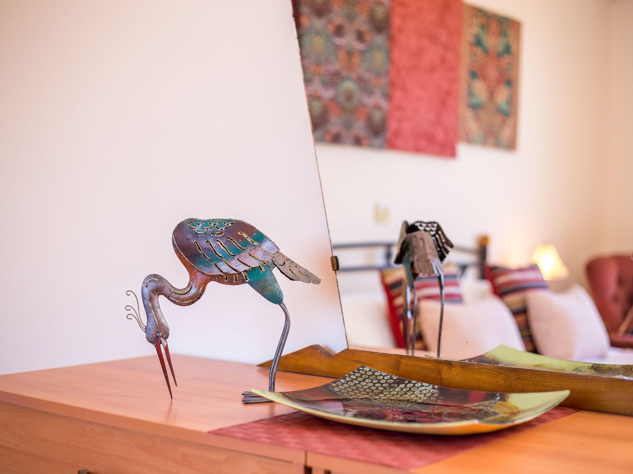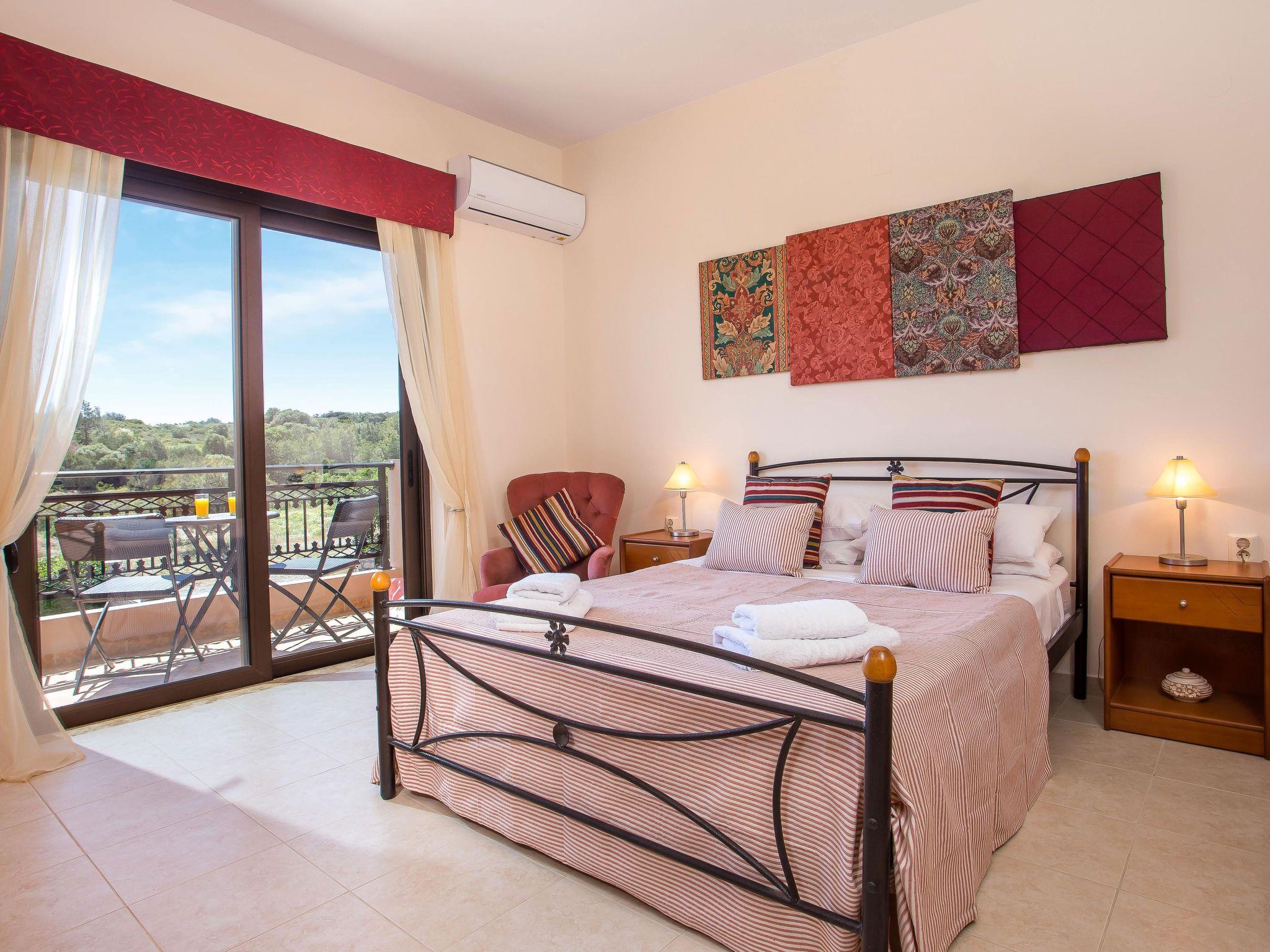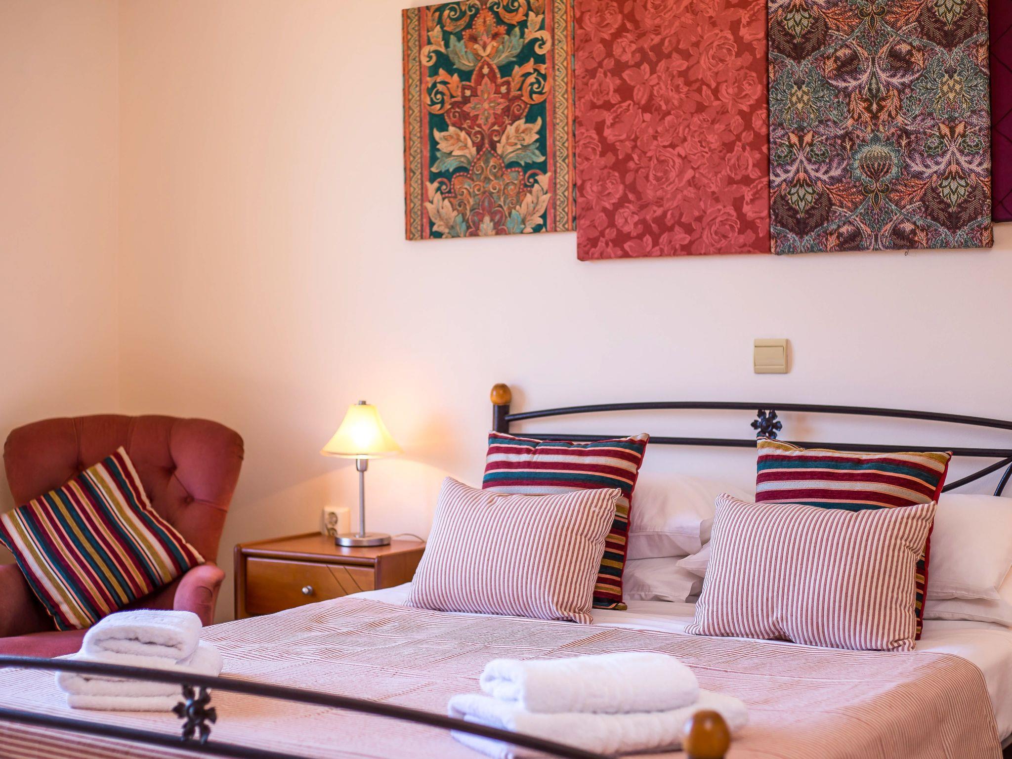 The villa features three bedrooms and can accommodate six persons. Two bedrooms have a 200 x 200 cm double bed, the third bedroom has two 90 x 200 cm single beds (can be pushed together to make a double). There is a comfortable living area with a fireplace, a fully equipped kitchen with a dining area and two bathrooms: one with a bath tub and one with a shower. Free wifi, fully air conditioned.