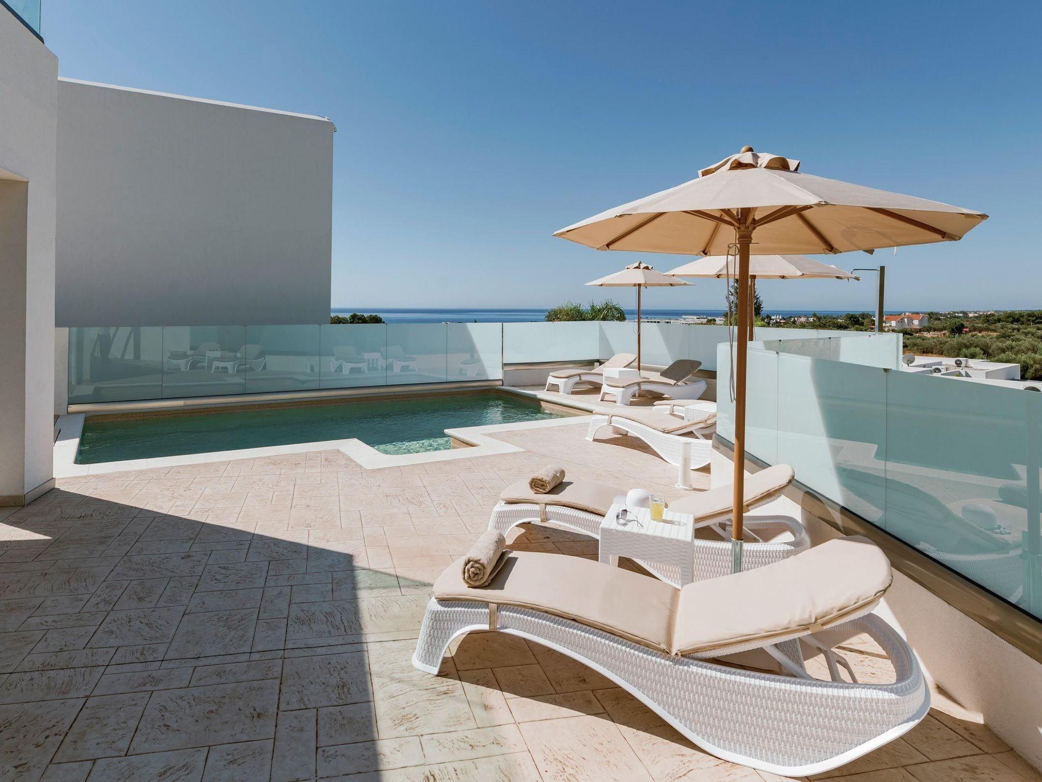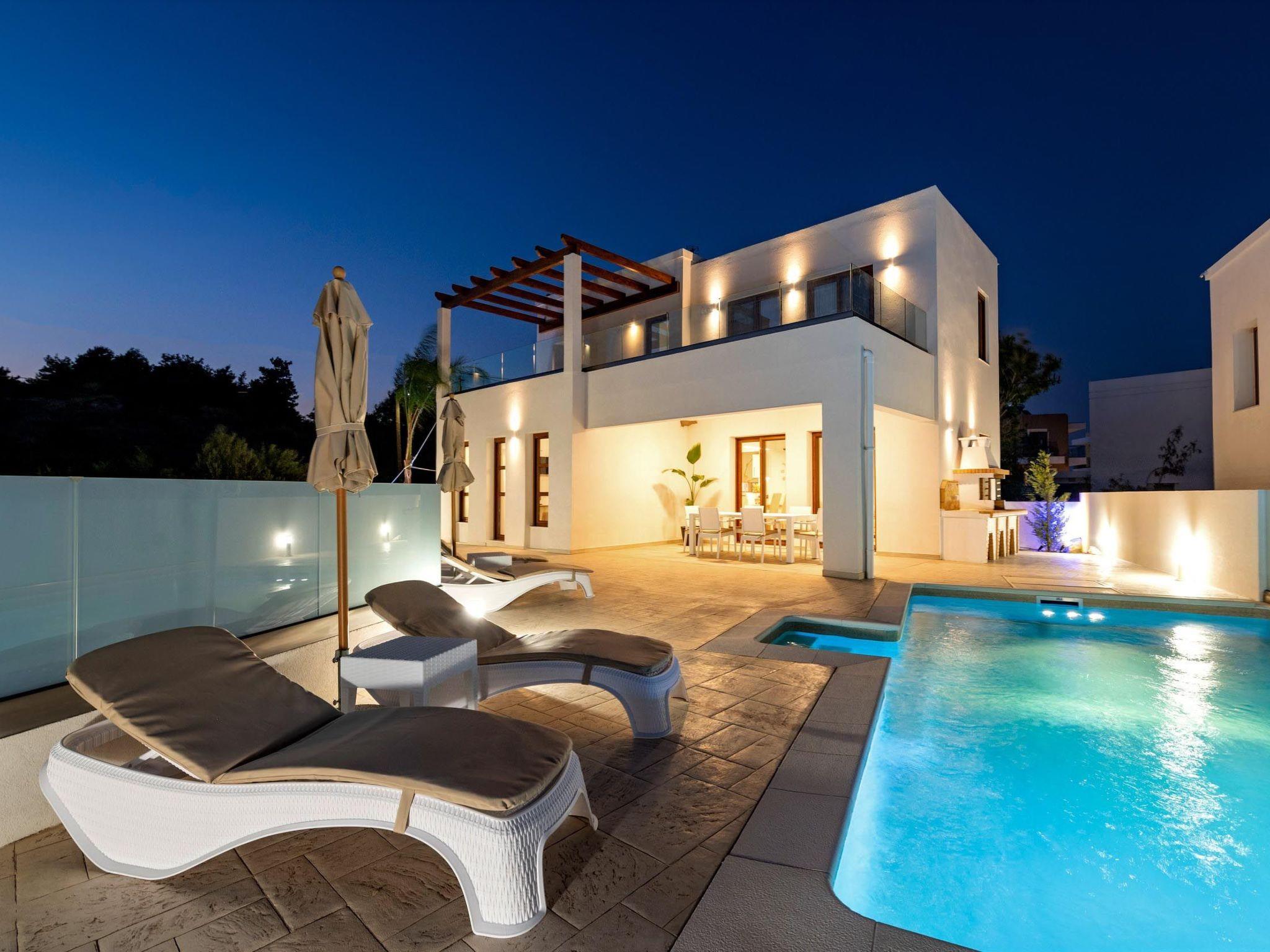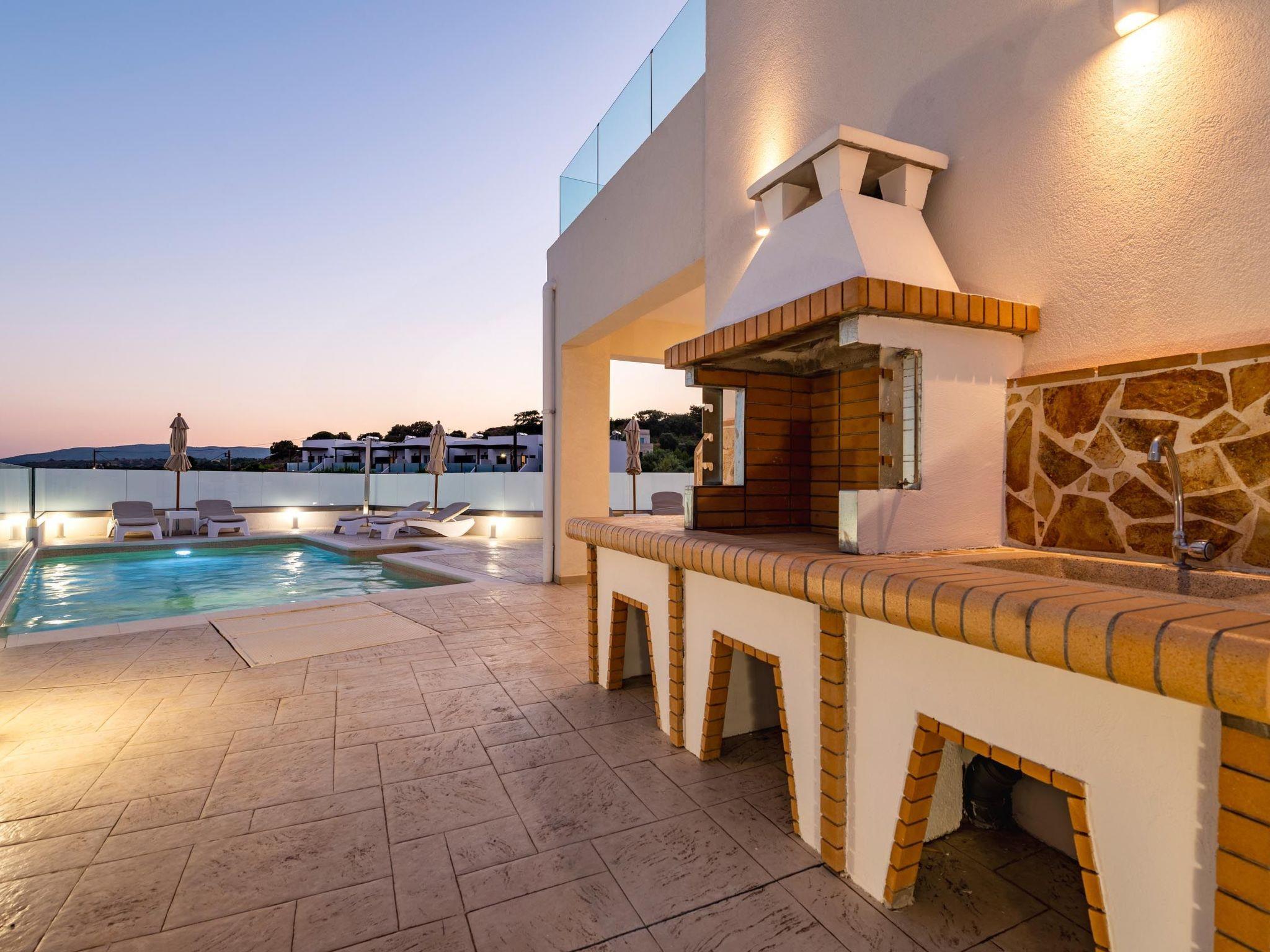 Eventide villa has 3 bedrooms, each of the modern bedrooms have a double bed. There are two bathrooms with shower; one of them is included to a bedroom. There’s an open plan kitchen, fully equipped with everything is needed for a meal preparation along with a sitting area. The living area is quite inviting with its warm colors and convenient furniture, along with its screen TV. Guests can enjoy free Wi-Fi access throughout the property. Outdoors, there’s the wonderful private swimming pool with its stylish sunbeds. There are BBQ facilities with a sitting area allowing you to enjoy a gathering with your loved ones.