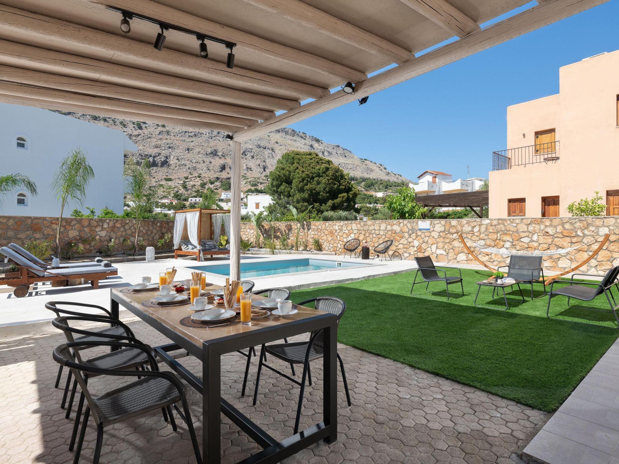 Avia Villa is located in the beautiful area of Pefkous, on the island of Rhodes, Greece. The villa is set in a quiet and peaceful spot, just a short distance from the beach, restaurants, and local shops. It’s the perfect place for guests who want to relax and enjoy the sun, sea, and nature. The popular village of Lindos is only a 10-minute drive away, where you can explore traditional streets, enjoy amazing views, and visit the famous Acropolis of Lindos. Rhodes Town and the airport are about an hour’s drive from the villa.