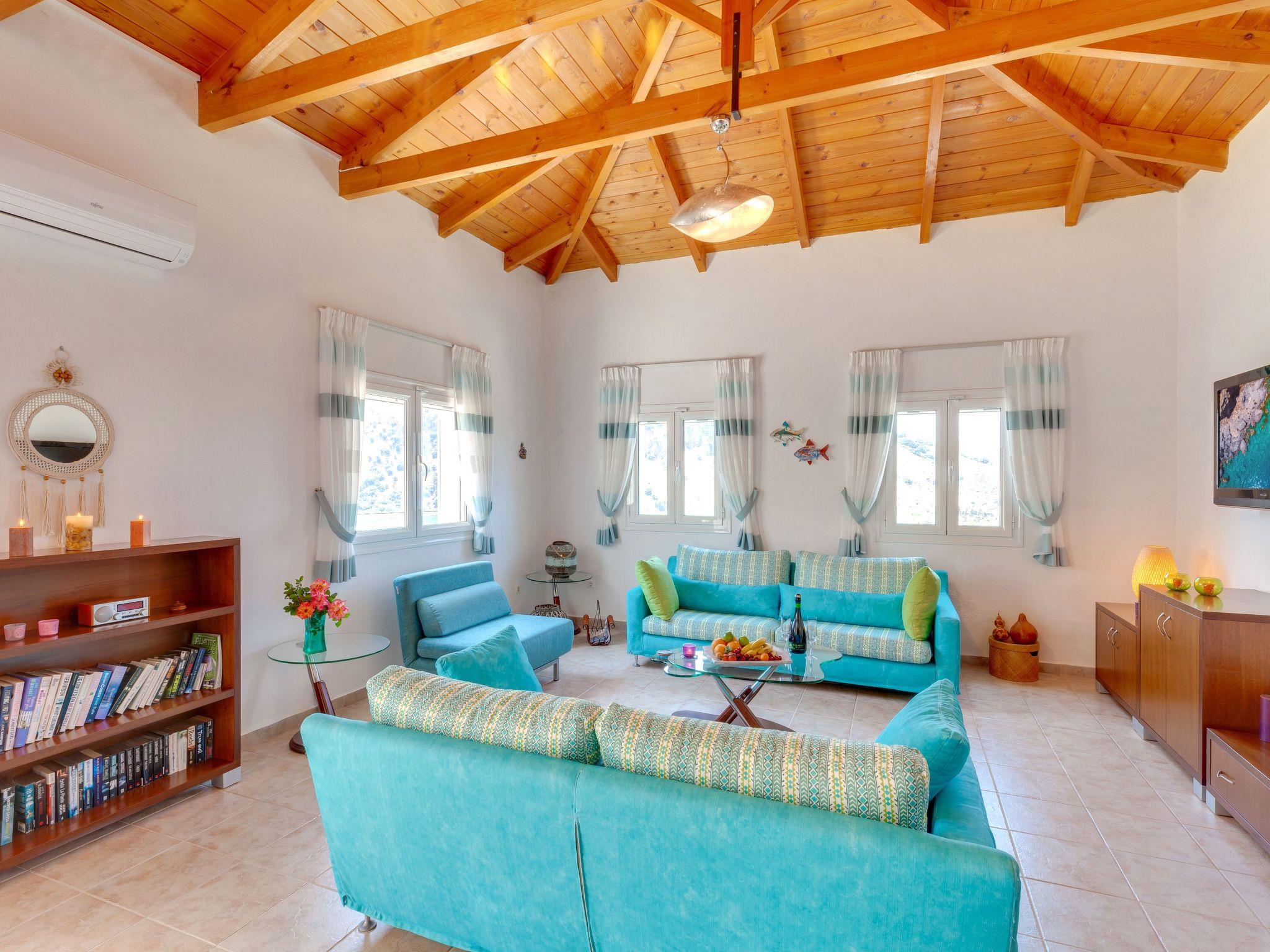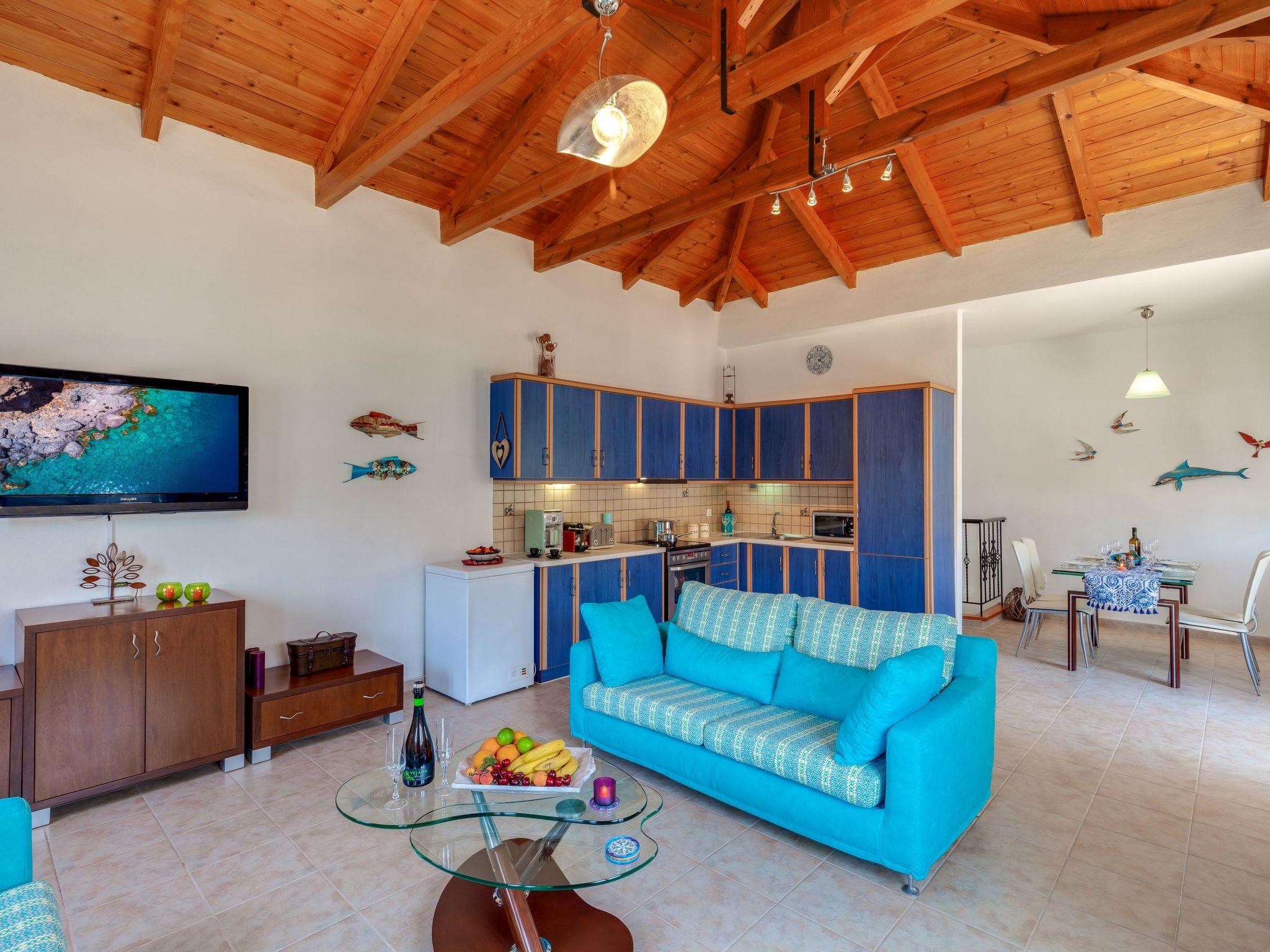 Inside, Villa Kallisti-Artemis offers a seamless blend of modern luxury and traditional elements, with décor and colors that pay homage to the Minoan period, ensuring a stay that’s both luxurious and comfortable. It boasts two cozy bedrooms on the ground floor, each equipped with spacious wardrobes, air conditioning, and smart TVs, alongside a well-appointed bathroom with a bath, washing machine, and hairdryer. The upper floor features a spacious living/dining area and a fully equipped kitchen, highlighting the villa's commitment to absolute relaxation and quality living.