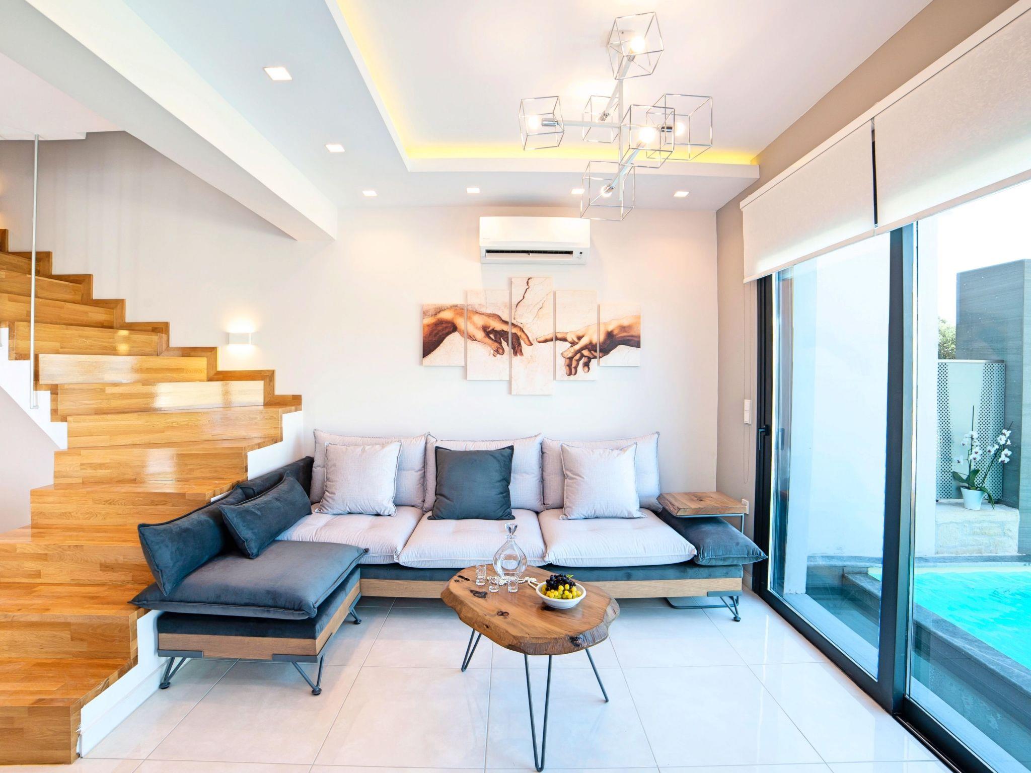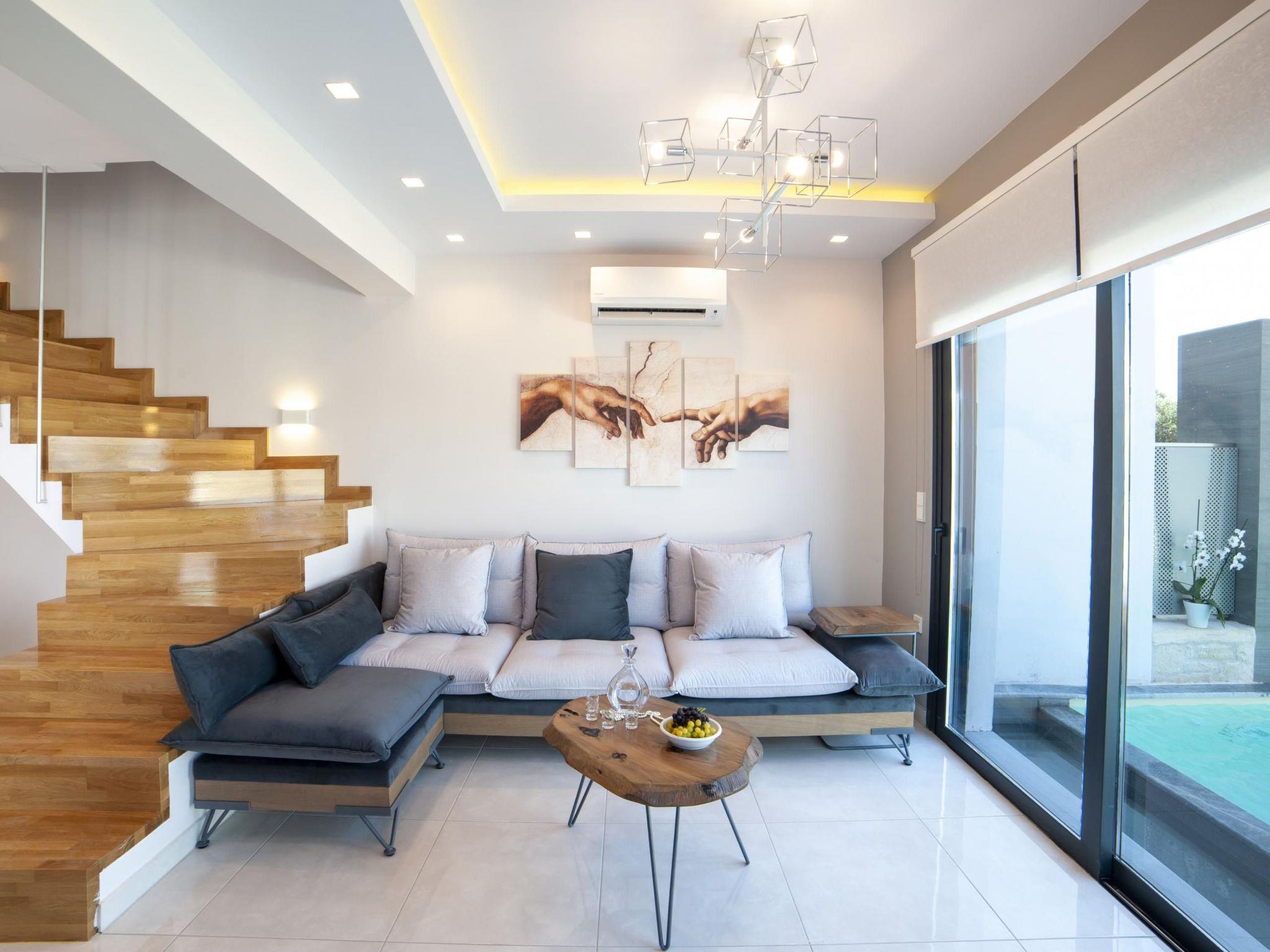 Perla Villas, a poem to Crete’s soul! Sculptured into the green Kournas cliffs, Perla Villas, a complex of Luxury Villas, overlooks the turquoise expanse of the Kournas Lake and the blue of the Mediterranean Sea encircling the island of Crete. A favored destination for romantic escapes or relaxing vacations, Perla villas emanates a carefree spirit, imparting a soothing, exclusive feeling, so particular to the spectacular location. Perla Villas is blessed with a privileged location in a unique natural landscape; the view is dramatic over the lake, continued with an unforgettable panoramic view of the serene scenery of the Cretan sea; and all that precious setting lies just 150 steps leading up, from the famous Cretan Traditional Tavernas next to the Lake shore. The Perla Bianca Villa, with its external Jacuzzi and private pool, is distinguished by its ample space and its graceful ambience. It offers a stylishly designed master bedroom with a comfortable queen-size bed, a comfy second bedroom with twin push-together beds and an elegantly adorned bathroom with a rejuvenating shower. This chic Villa features a living room area with corner sofa, a separate cozy dining room with a fine bathroom with shower and a fully equipped kitchen. Outdoors, a spacious terrace with BBQ and dining area overlooks the Jacuzzi, the private pool and the relaxing sun beds area. The Perla Nera Villa is the ultimate experience, bringing together authentic design and contemporary touches. Utmost privacy, enriched facilities and a waterfall private pool with Jacuzzi complete the most unforgettable getaway and offer an open plan living area with floating sun beds, BBQ and dining area. Indoors, the upper floor features two spacious bedrooms one with queen size -size beds plus a second bedroom with twin beds push together and a stylish bathroom with shower. A modern, fully equipped kitchen with dining area lies at the lower level, combined with a luxurious bathroom and an adjoining living room area with corner sofa and all that with direct access to the pool. Perla Villas are ideal for families, a group of families or a group of friends. Enjoy your vacations with your parents or with the rest of your family members while at the same time preserving your privacy just like at your own home. Our Villas are built one next to the other. Perla villas can accommodate up to 12 guests (6 guests at Perla Bianca Villa and 6 quests at Perla Nera Villa).