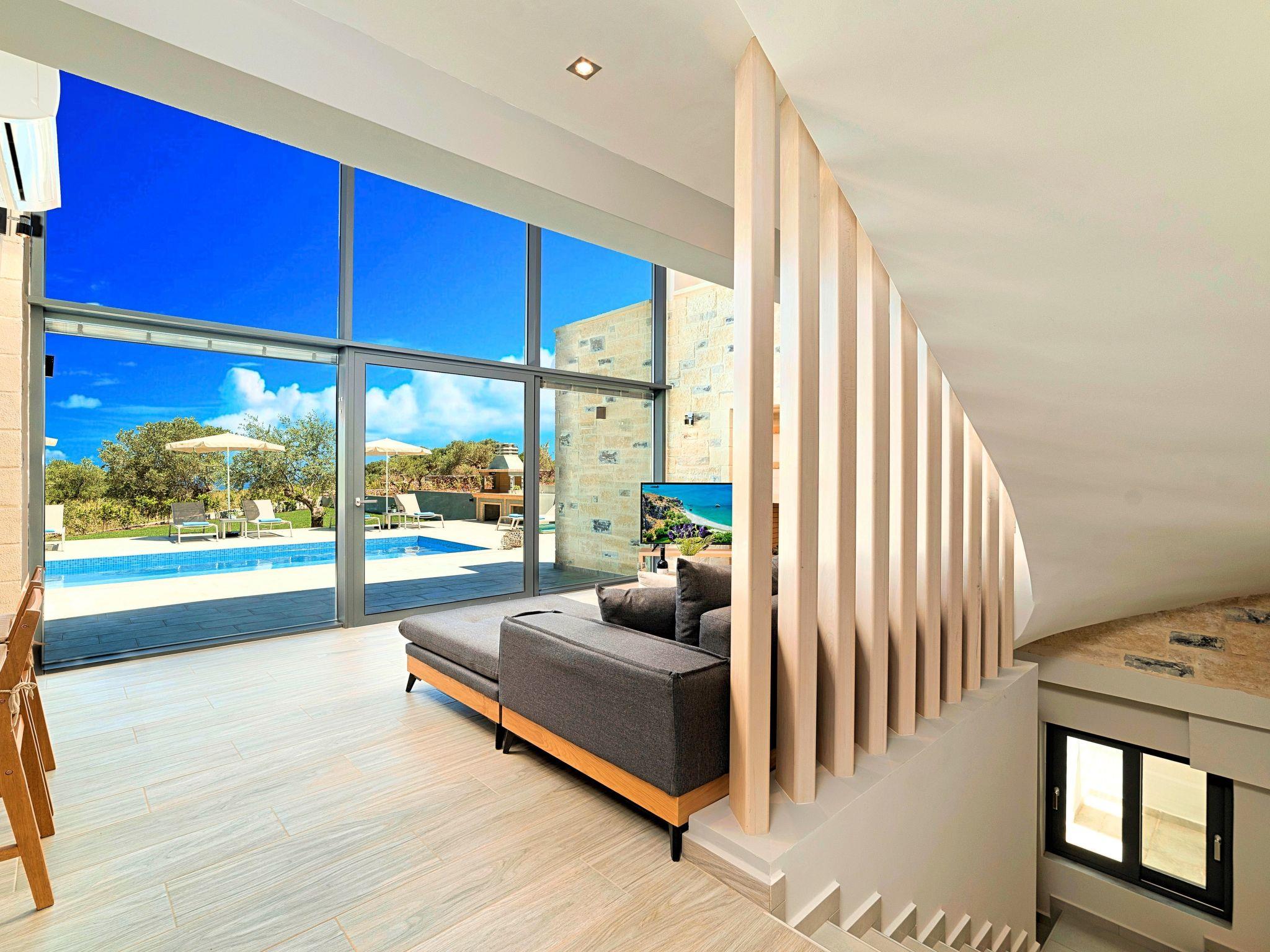 Nuzzled in an olive grove, above the sandy beach of Georgioupolis in Crete, Moon Light Villas captures the essence of relaxing and comfort living. Villa’s complex is built amphitheatrically with amazing sea views. These elegant Villas evokes the island’s Mediterranean spirit and cosmopolitan charm in its elegant environs while ensuring a holiday beyond comparison. Surrender to the temptations of refinement at one of the most enchanting Cretan Villas and take in the splendid panoramic views to the emerald Cretan Sea. Find your peace and quiet and unwind in a haven of bliss and tranquility.Hide away in the calm of summer and elevate your senses at one of the most remarkable Villas with private pool. Moonlight Maxima is a combination of 2 units next to each other. Each One of two Villas can accommodate up to 15 guests ( 10 in the bedrooms) and 5 more at the sofas in bedrooms or at the lower level living room. The max occupancy we can sleep is 30 people.