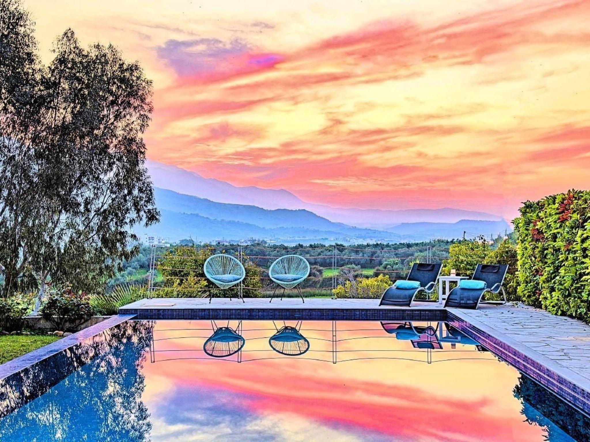 Cretan Mansion is a modern 5-bedroom villa.Located at the village Dramia, Apokoronas municipality, quite close to the tourist village of Kavros, just five hundred meters from the sandy beach of Georgioupolis – Episkopi, at the foot of the White Mountains at the northeastern corner of the prefecture of Chania.Built in 2006 with modern design, it affords guests with everything they need in order to enjoy a relaxing and enjoyable holiday.The rooms of the Mansion are functionally decorated.Its 5 bedrooms all fully equipped and spacious, all with private bathrooms.The lounges, dining rooms, kitchens are equipped with everything essential for a comfortable holiday.The gardens of the Mansion are surrounded by hand-made stone fences full of blossoming bushes, fruit trees and white oleanders.Swim in the private pool. Enjoy your coffee or drink at one of the terraces of our Mansion, looking out towards the White Mountains and the sandy beach of Georgioupolis.As you gaze at the valley surrounding the village, which is covered by a thick olive grove, you will relax immersed in aromas of rosemary, lavender and mint, engulfing you in a dream of the natural scent of the Cretan land.The outdoor pool is heated and can reach 6 to 8 degrees more that the air temperature with maximum value of 29°CShort descriptionOther : Non-smoking houseShort description 1Number of kitchens : 2SurroundingNearby sports facilities : FishingRental Facilities : Boat rental serviceGarden and outdoorGarden facilities : Garden furniture provided, GrillOn-site leisure facilities : Outdoor swimming pool exclusive use, Swimming pool