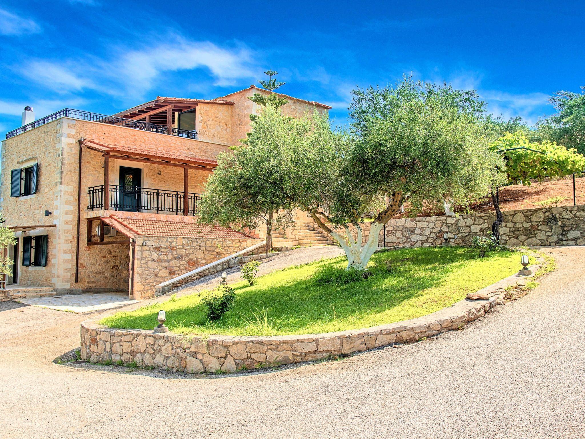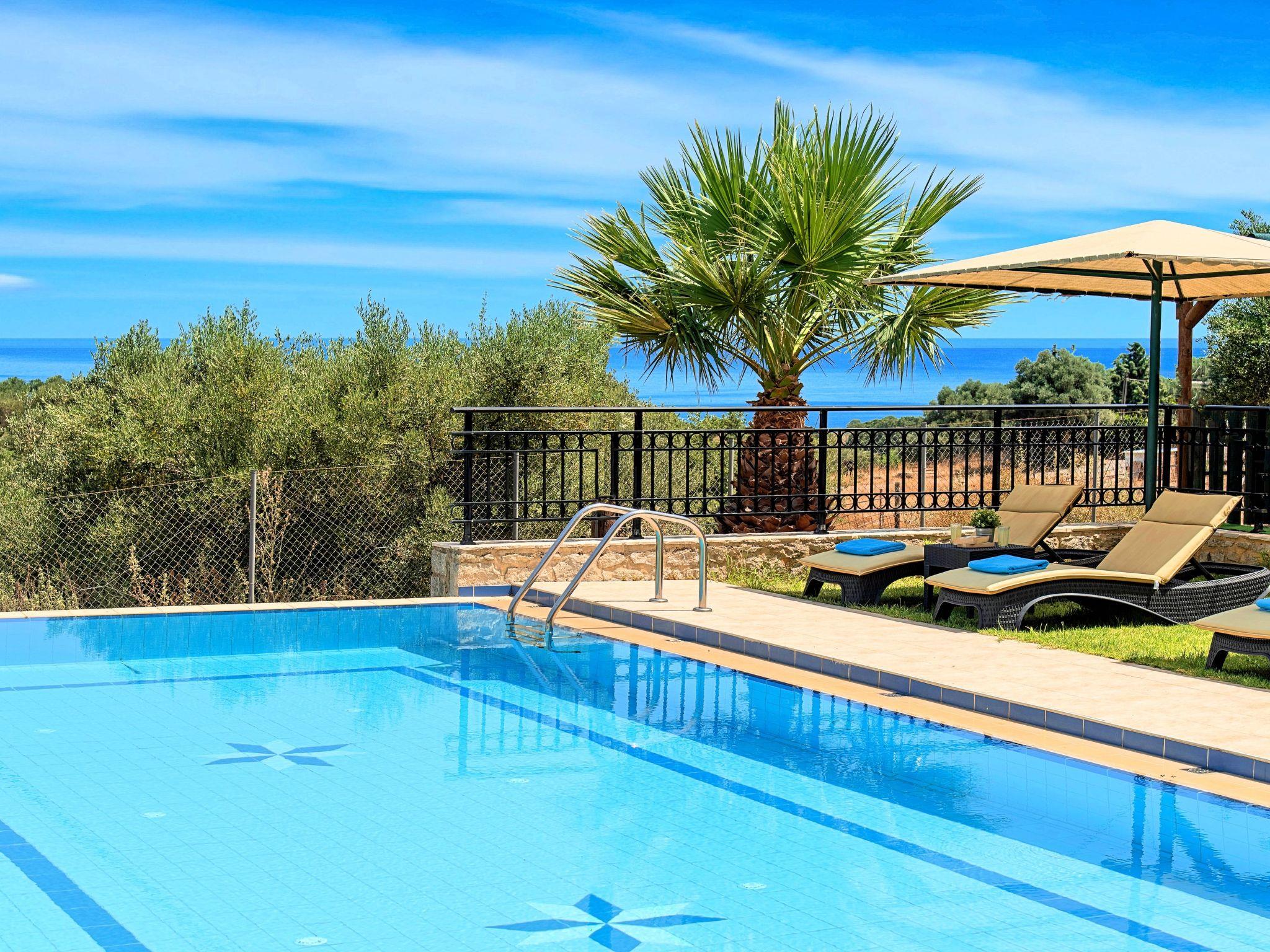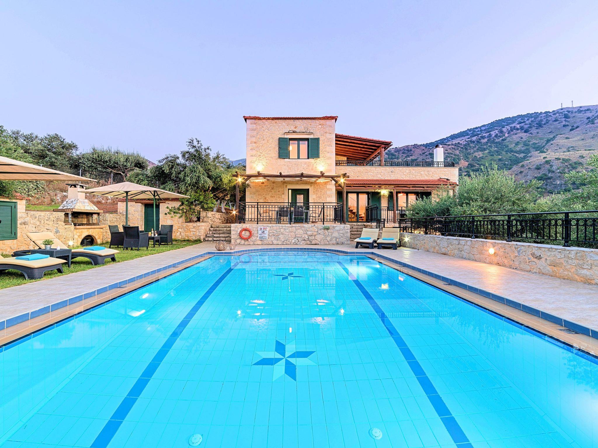 Villa Stelios is an exquisite and exceptionally well-built custom-made house able to accommodate every stage of life, all year round. The property is nestled over a hill before the village of Mathes overlooking Georgioupolis and the famous sandy beach (just 2km away).It forms a spectacular entertaining venue both inside and outside, with extended grounds featuring the Cretan landscaping with blooming bushes, olive groves and creeping plants. The interior is spacious and very bright while maintaining a cozy feel.Enjoy a magnificent pool area with splendid views of the Aegean Sea and the skyline of Crete.The villa affords privacy blended with sumptuous comfort set amidst a rural setting.Villa Stelios can accommodate up to 12 guests (10 in the bedrooms) and 2 more at the sofas in living room.The villa offers 5 Bedrooms, 3 Bathrooms, 220sqm Living Area, 6.000sqm plot surface, private pool 60sqm