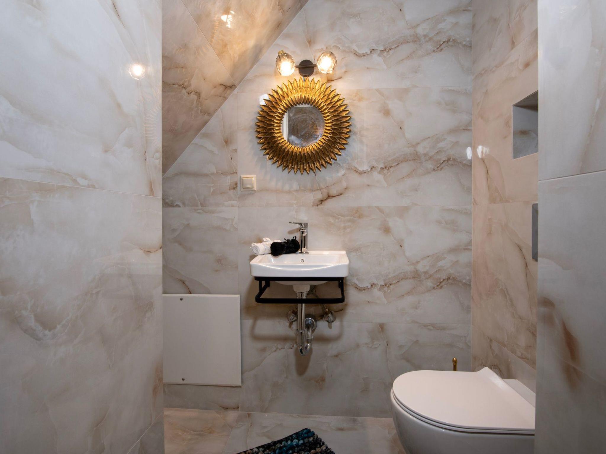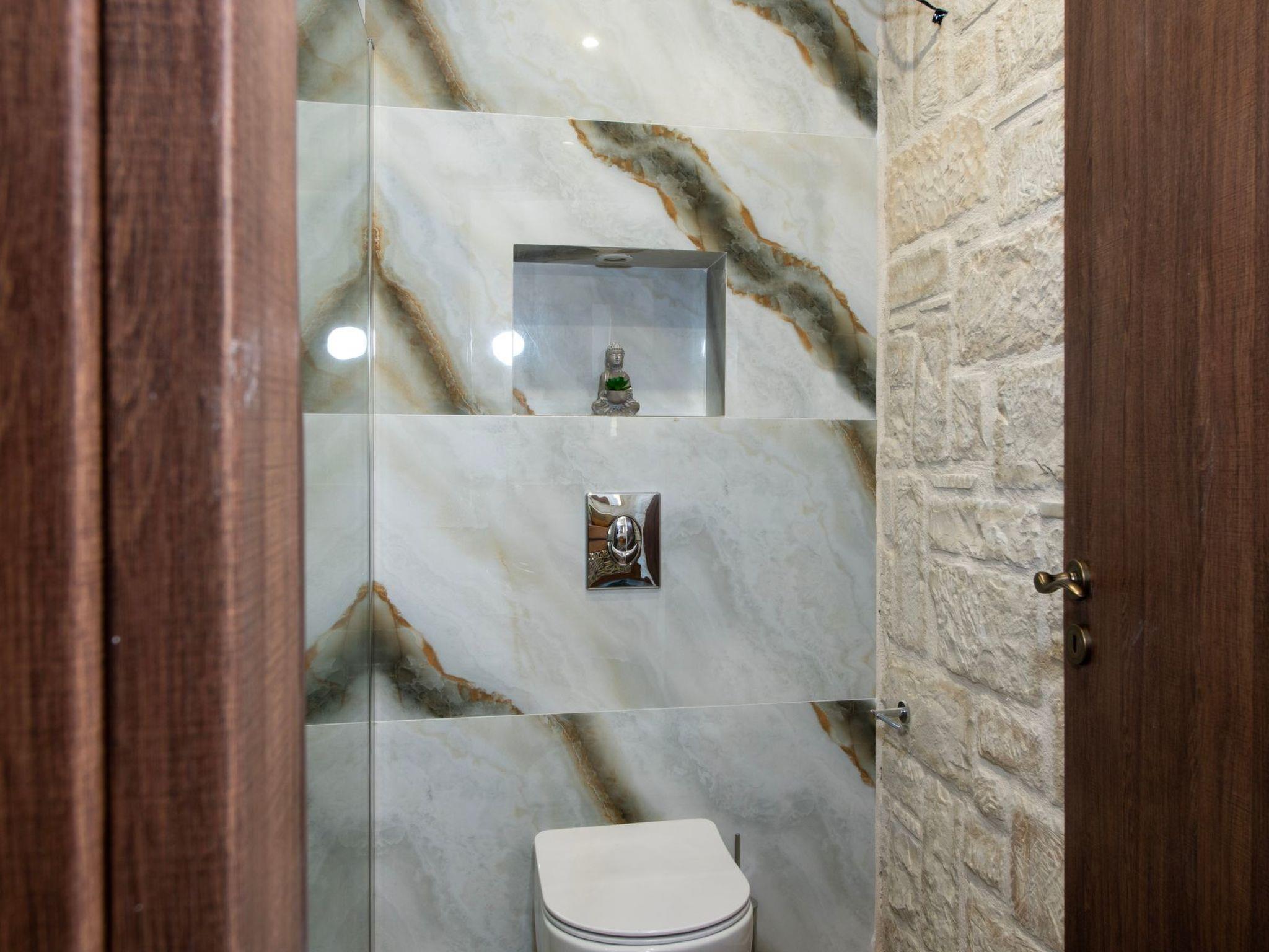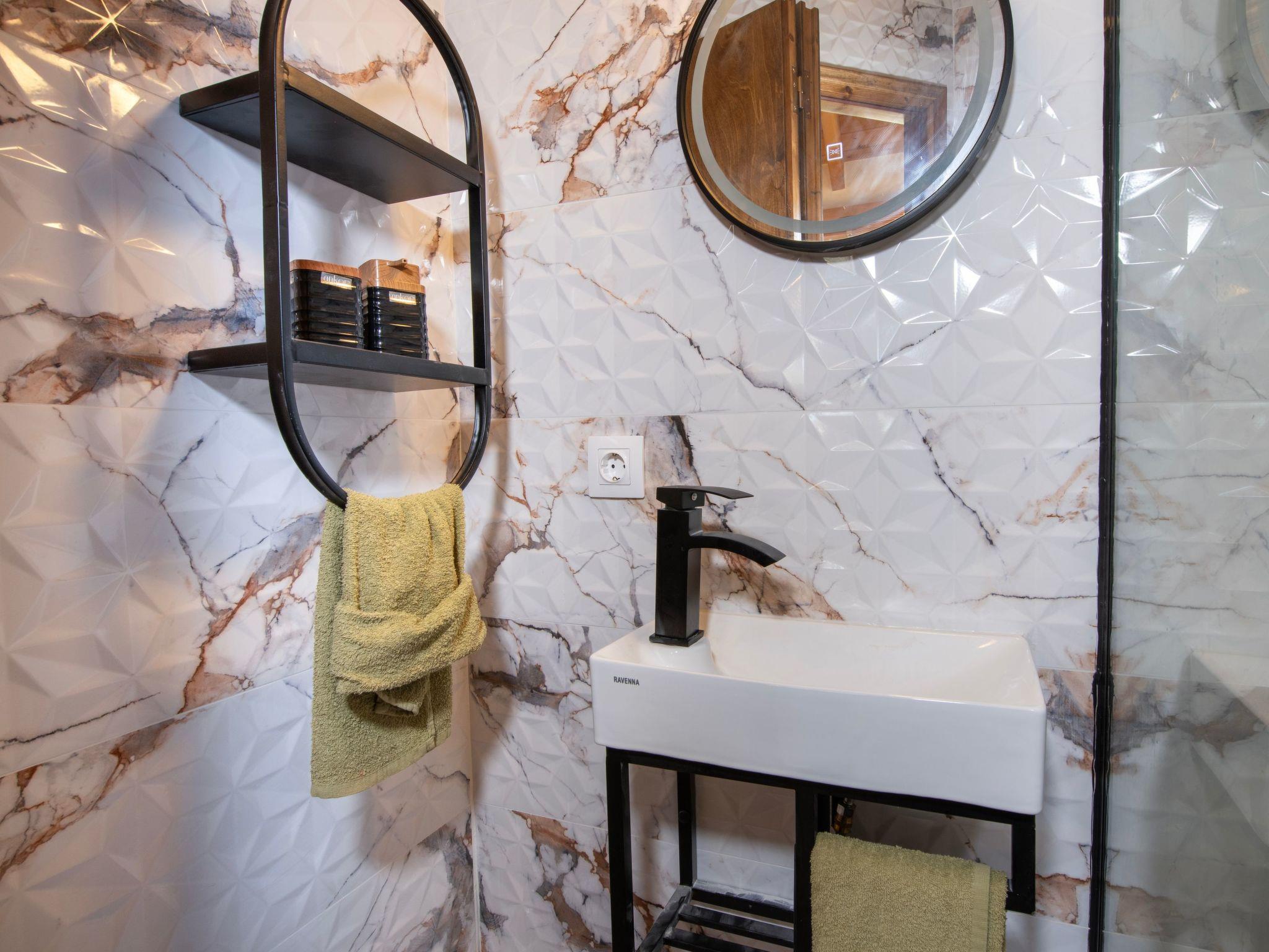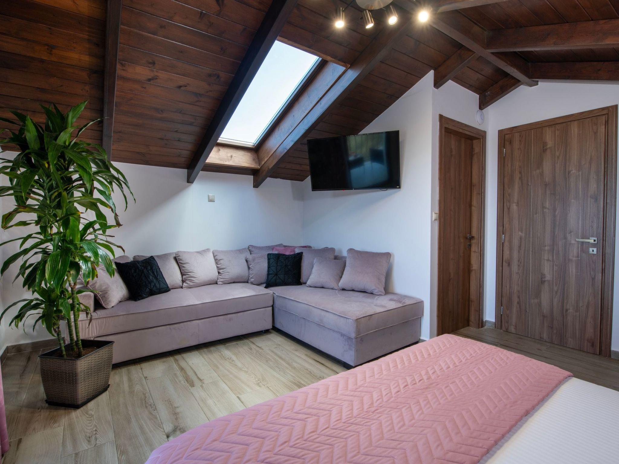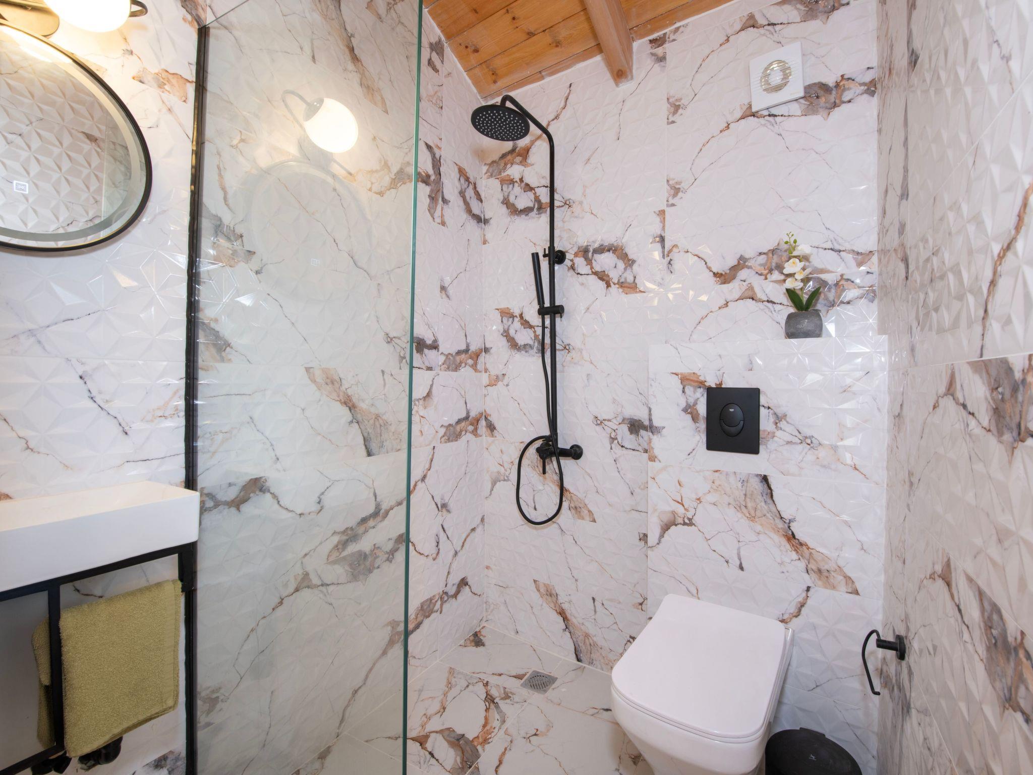 Step inside to discover a dedicated yoga area with mats, a jacuzzi, a sauna, and a bathroom with a shower. On the first floor, the open-plan living room with a 55’’ Smart TV and sea views connects to a fully equipped kitchen, a dining area, and a WC. A bedroom with a queen-size bed, sofa bed, and an ensuite bathroom. The best spot on this floor is the balcony with a swimming pool. The second floor hosts another bedroom with a queen-size bed, a sofa bed, an ensuite bathroom with a shower, and a balcony overlooking the sea, while the lower floor is like an apartment, including a fully equipped kitchen, a third bedroom, and a bathroom with a shower.
