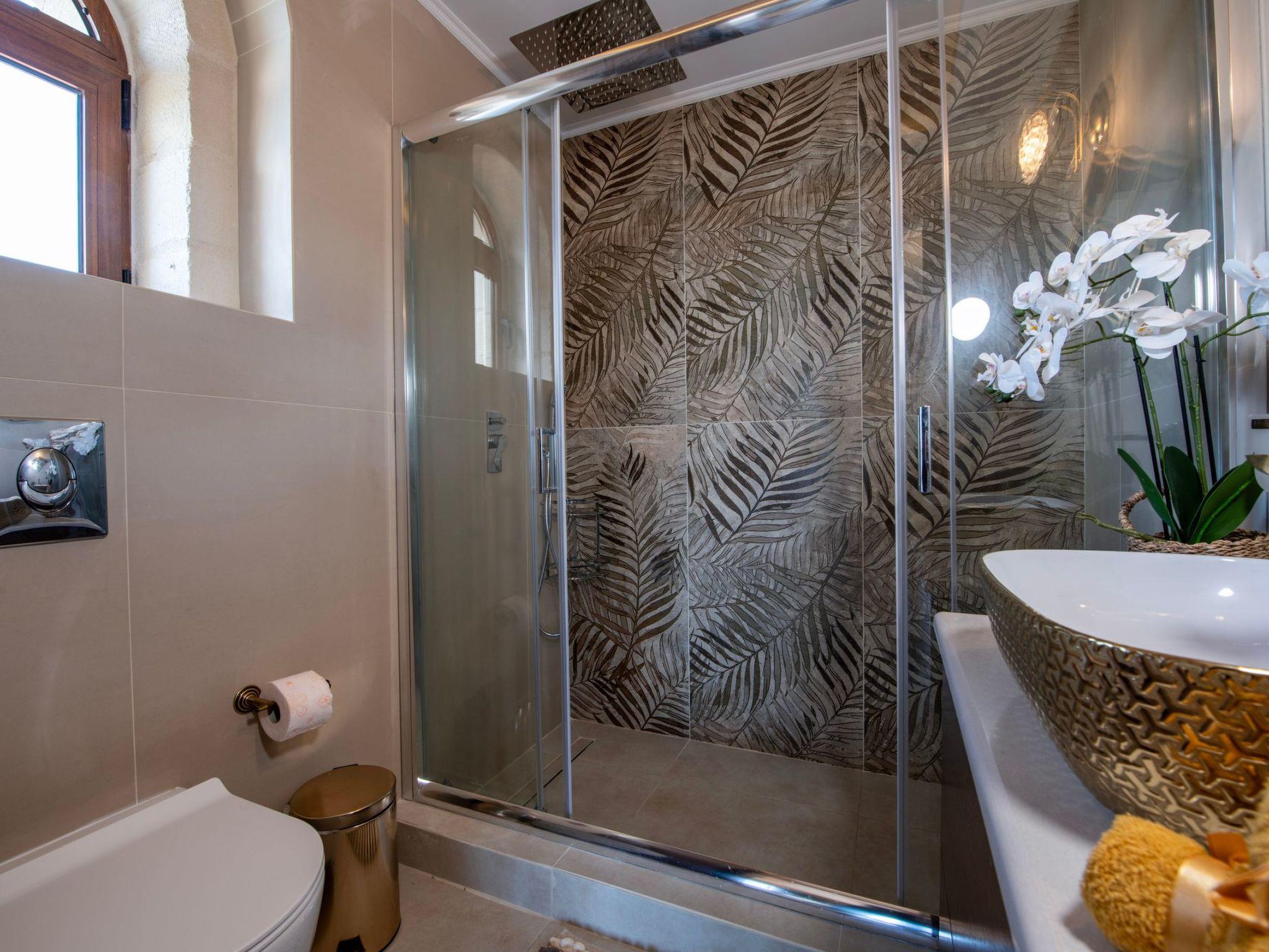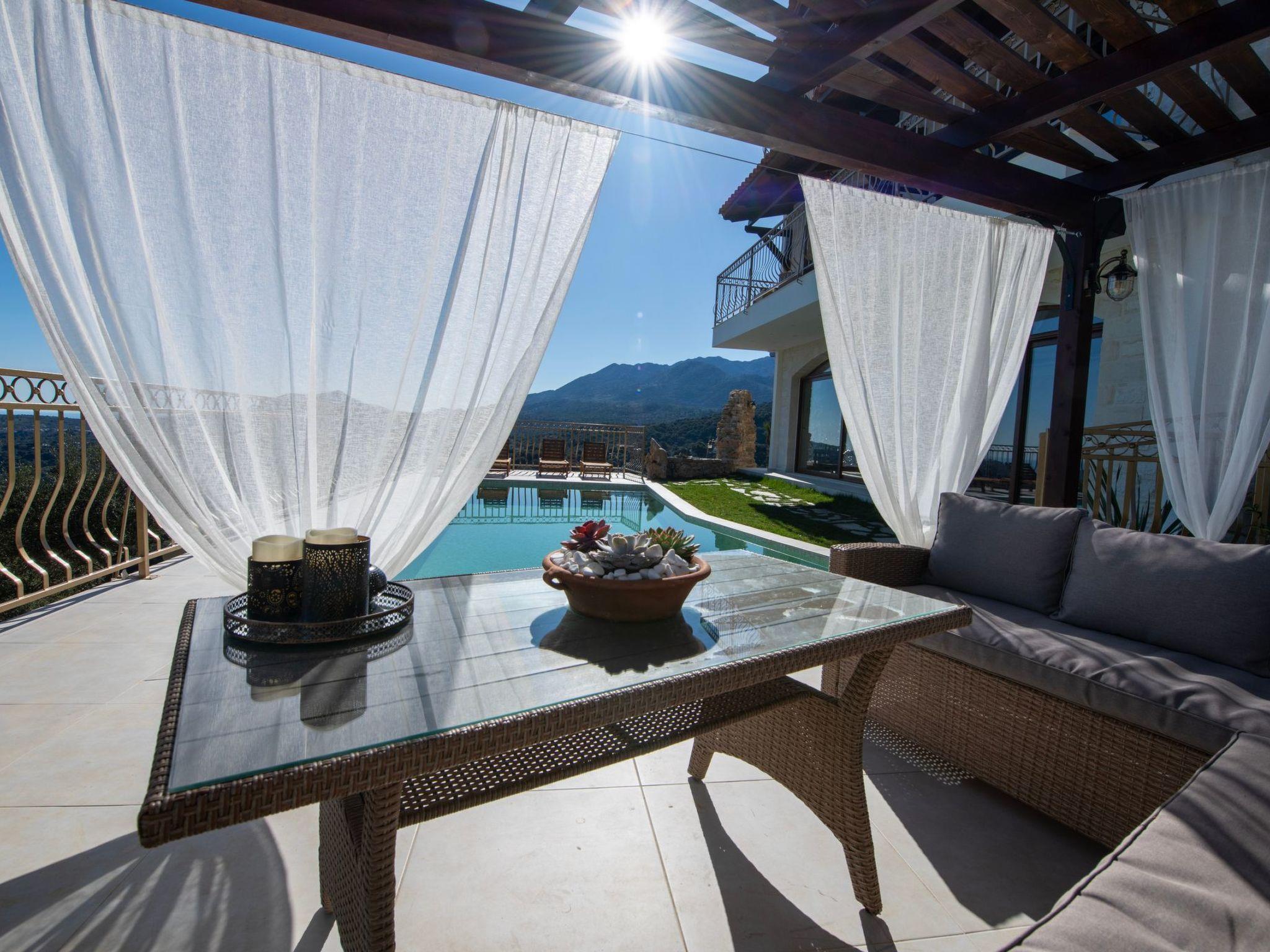 Outdoors, guests can enjoy the private pool, sun loungers, a barbecue area with electric and charcoal grills, and a pergola-shaded dining area for eight. A small waterfall adds a relaxing touch. Geroulios Kastro Villa II captures the true essence of tranquillity and natural beauty. Set on a hilltop surrounded by olive trees and lush greenery, it offers breathtaking panoramic views of the Cretan Sea and the majestic White Mountains.
