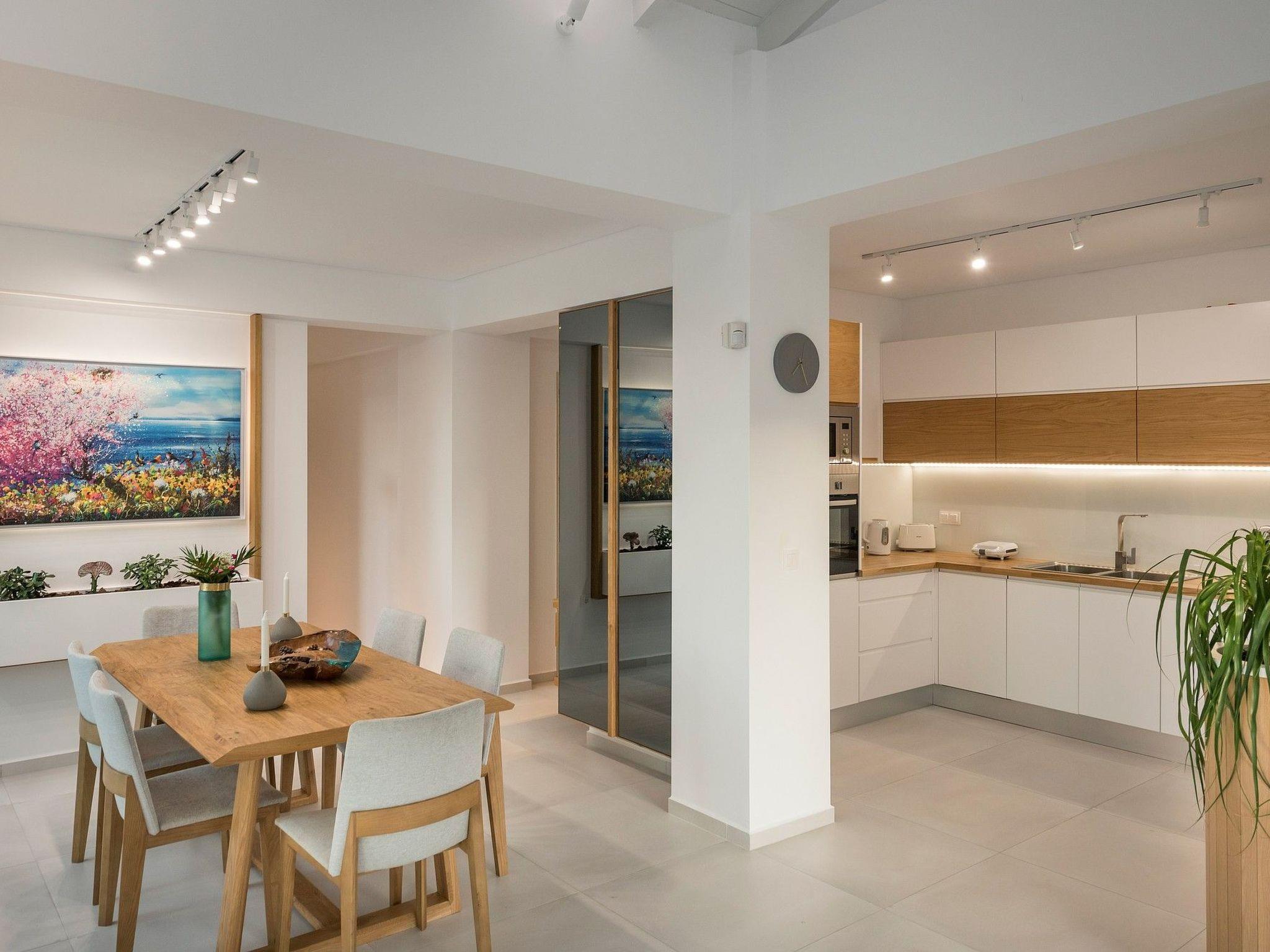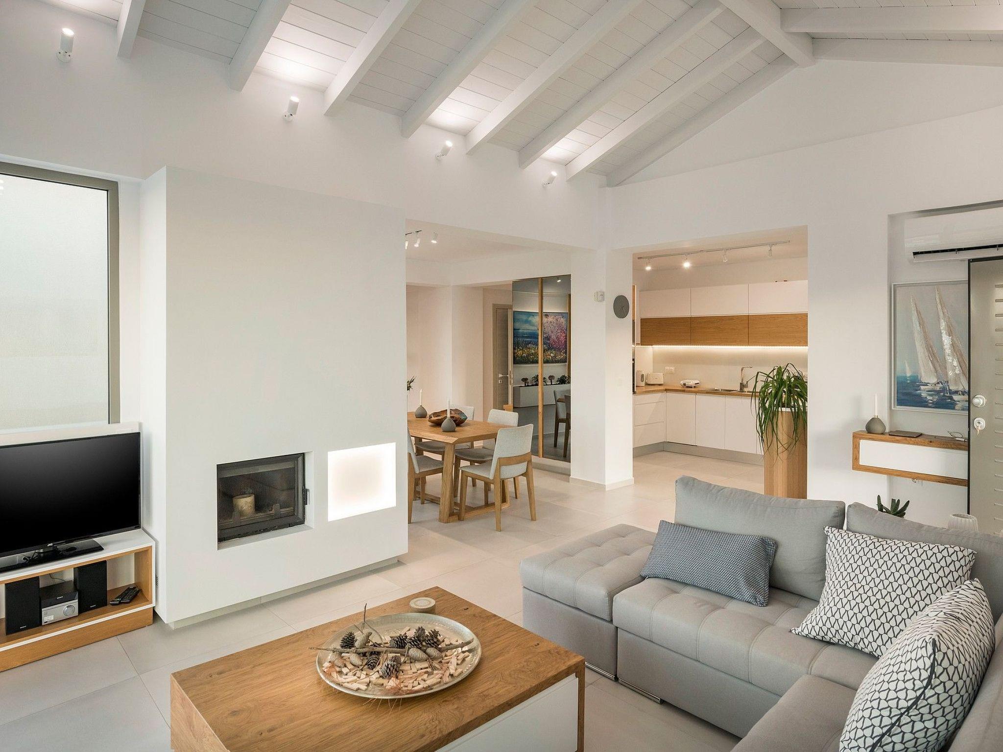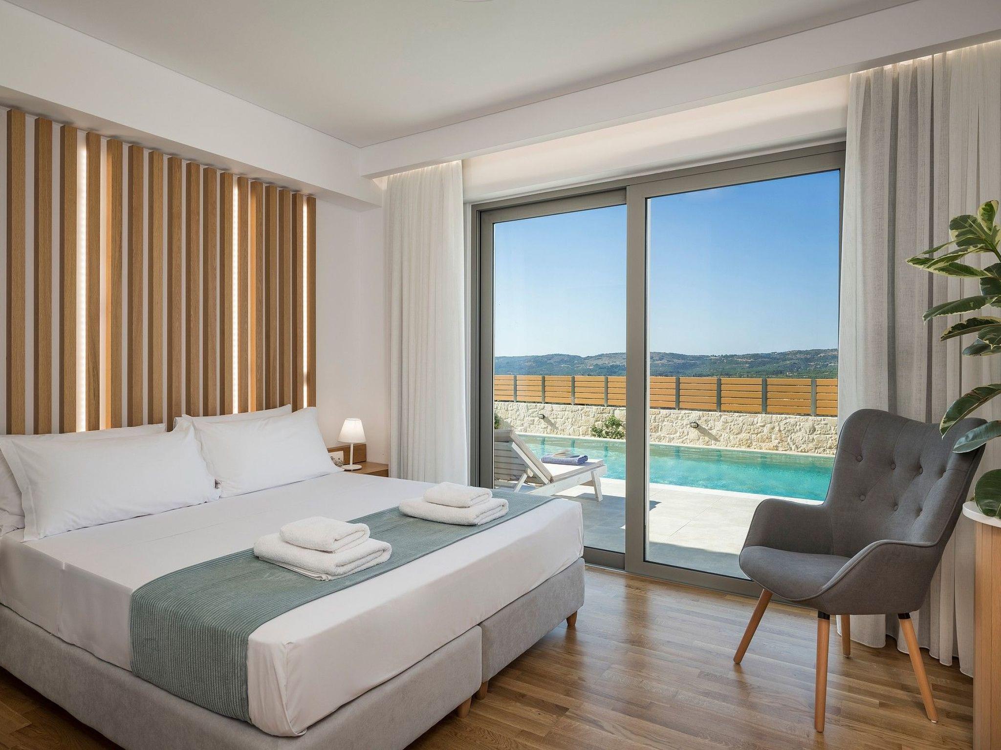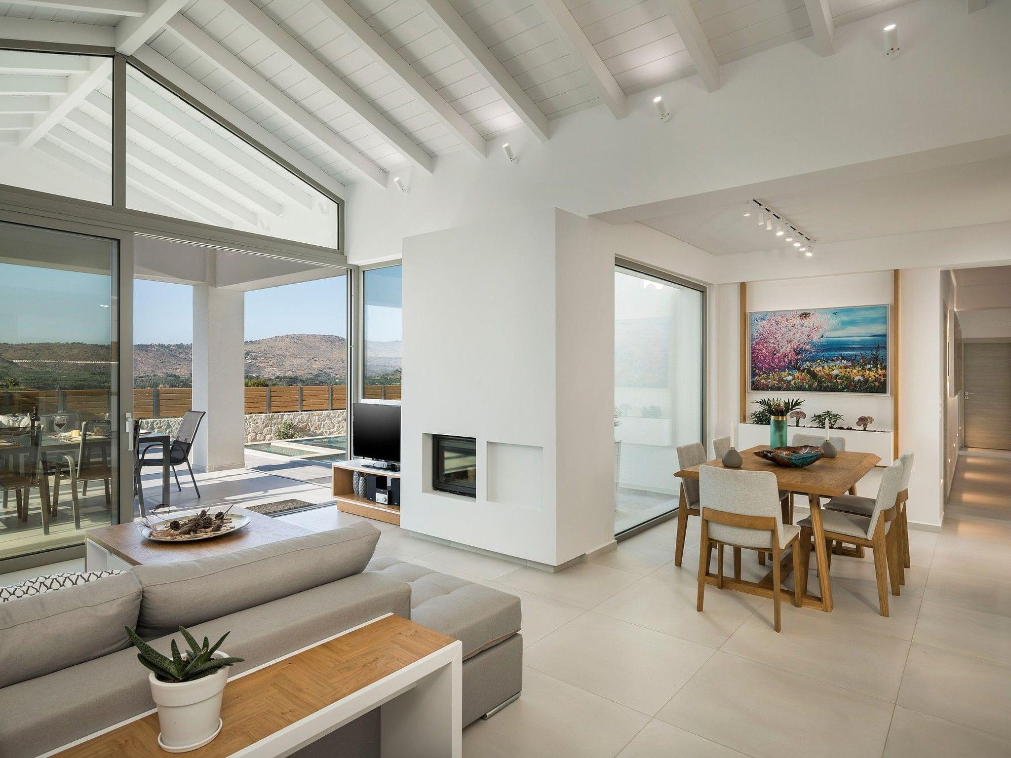 Villa White Harmony is the ideal shelter for the visitors of Crete which are visioning of a dream holiday overlooking the lush nature of Chania and the White Mountains, in an unbeatable location ideal for exploring Chania and Rethymnon. The outdoor heated pool with the sunbeds around can hold you at the villa all day long. As you walk in Villa White Harmony a delightful combination of natural materials and elegance create a welcoming atmosphere that gives relaxation and a sense of well-being. The handmade kitchen made by the owners has all the amenities you need for a comfortable stay, such as refrigerator, electric cooker, dishwasher, washing machine, coffee maker, toaster, kettle. The large 6-persons dining room invites you to dine with your friends while relaxing on the couch watching your favourite TV program featuring satellite channels and NETFLIX. In the same area there is a fireplace that you can light on the cold days and nights of your holiday. Moving down to the imposing White Harmony villa there are 3 tastefully decorated en suite bedrooms with king size double beds while one bedroom can be split into 2 single beds upon request. Each of the 3 bedrooms has air conditioning and a wardrobe while baby cot (one or more) is available upon request. Check out is 11:00 latest and check in is 15:00 earliest giving.