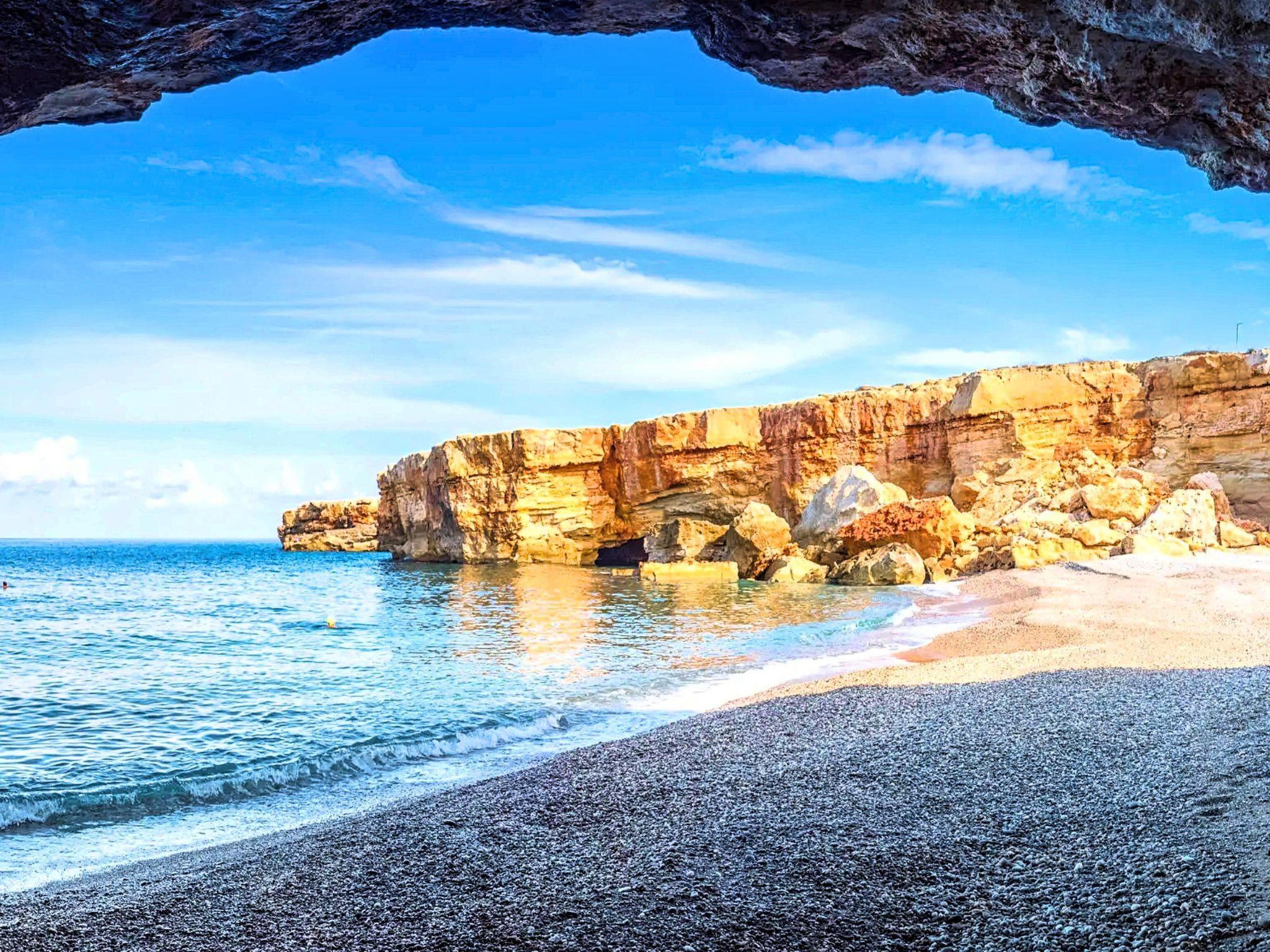 The rocky part of the coastal area boasts a number of caves, the Poseidon cave being the most important among them, to which access is possible from the sea only. Inside, bizarre formations of stalactites and stalagmites, reflecting the whole spectrum of colours, indeed display a "divine picture". At the entrance of the Poseidon cave, a huge stalgmite in the shape of a lion seems to watch over the enormous cave. Next to it, a peculiar accumulation of rocks could have been the "gate of the nymphs", under which the mermaids prepared themselves before they entered the cave of the great god of the seas.