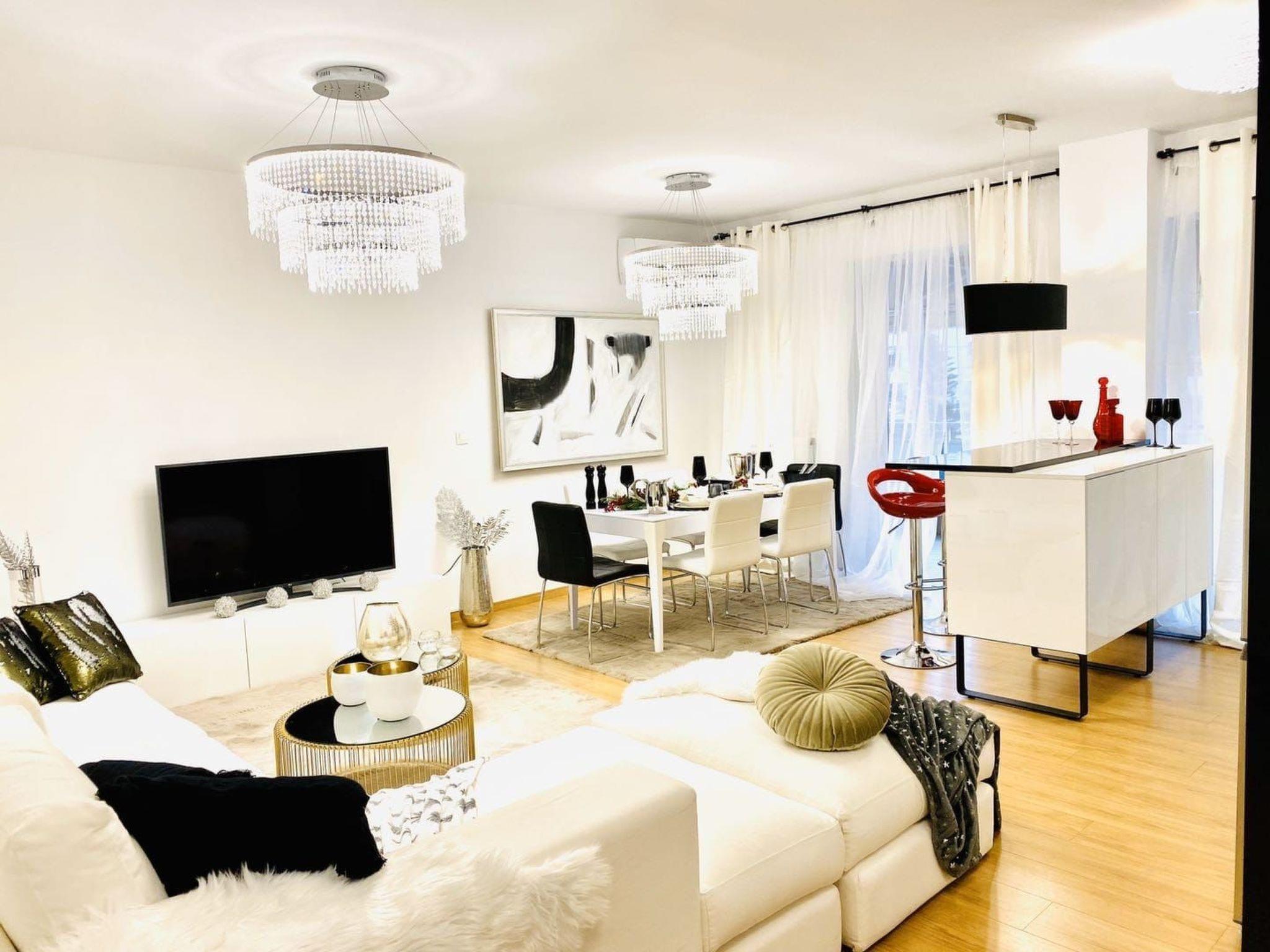 Inside, the apartment boasts a thoughtful layout designed to make your stay as comfortable as possible. The two bedrooms are furnished with cozy double beds, ensuring a good night's sleep after a day of exploration. The living area, spacious and inviting, comes equipped with a smart TV, offering endless entertainment options for guests of all ages. The inclusion of a fully equipped kitchen allows for seamless meal preparation, whether you're whipping up a quick breakfast or hosting a dinner.