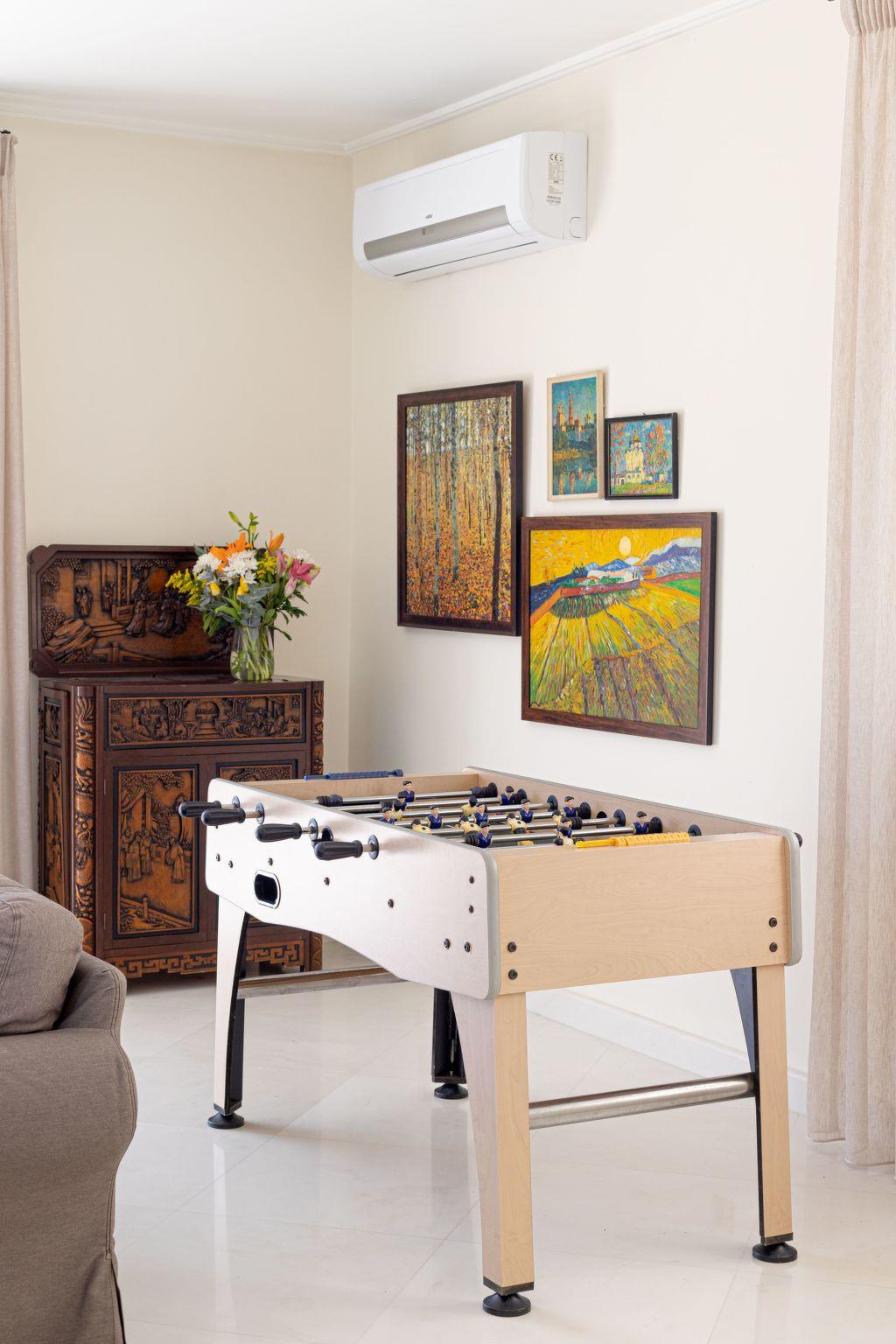 Guests can enjoy a wide range of leisure facilities within the villa. A private swimming pool, surrounded by a garden with a dining table and BBQ, is perfect for relaxing or entertaining. Indoors, you’ll find a sauna, billiards room, grand piano, table football, and even a wine cellar, offering something for every mood and occasion. A dedicated workspace with a desk, computer, and a 65” smart TV makes the villa suitable for remote work or business retreats, balancing productivity with relaxation.