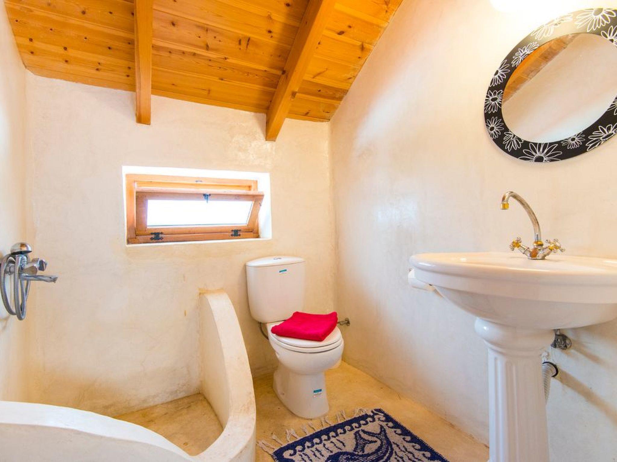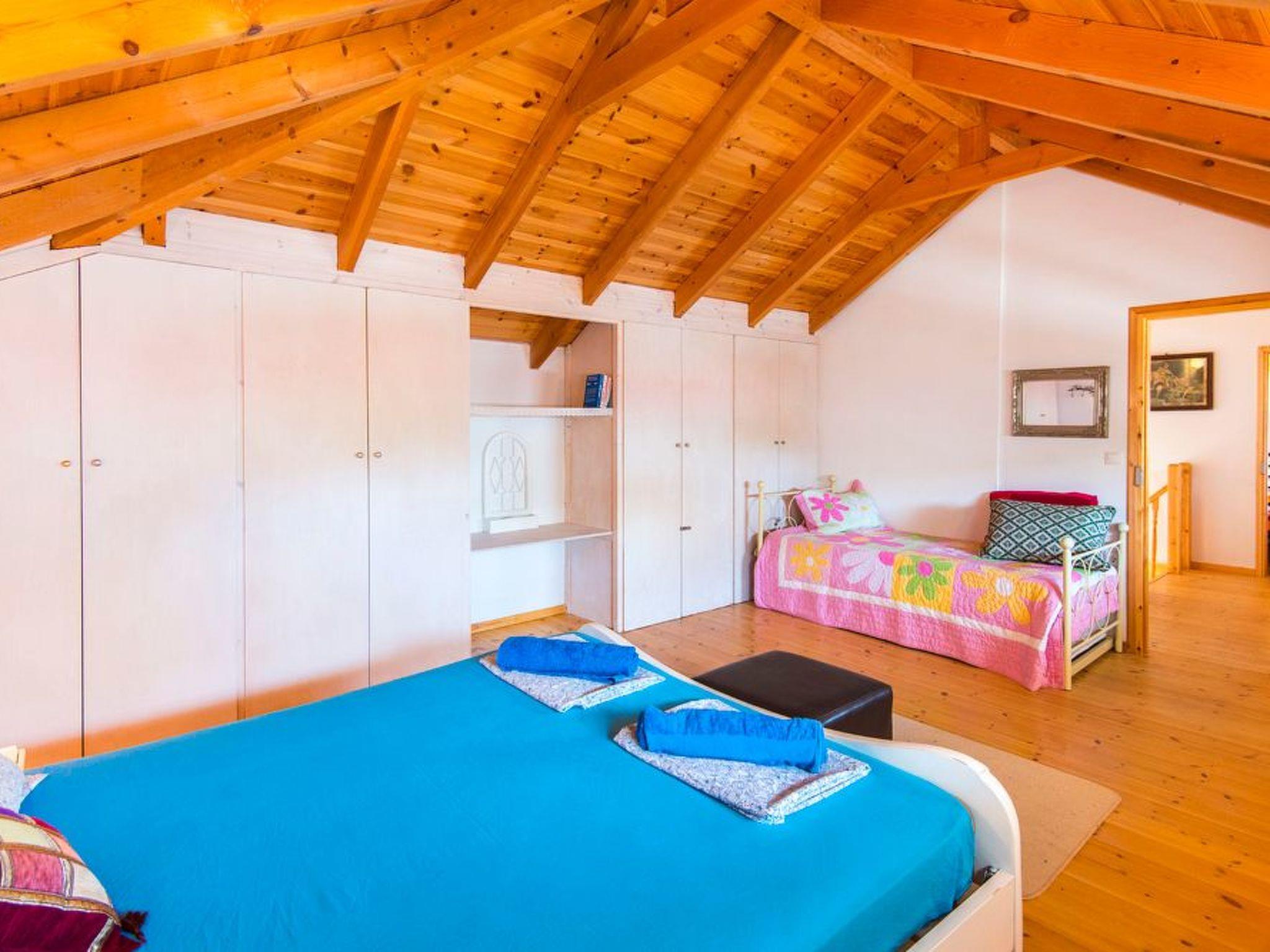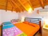 The house has a bathroom and two bedrooms upstairs. One large room with a double bed and extra double sofa and one more room with a double and a single bed. A living room, kitchen and bathroom are on the bottom floor as well as a side room that can be used as a bedroom c.q. sitting room.
