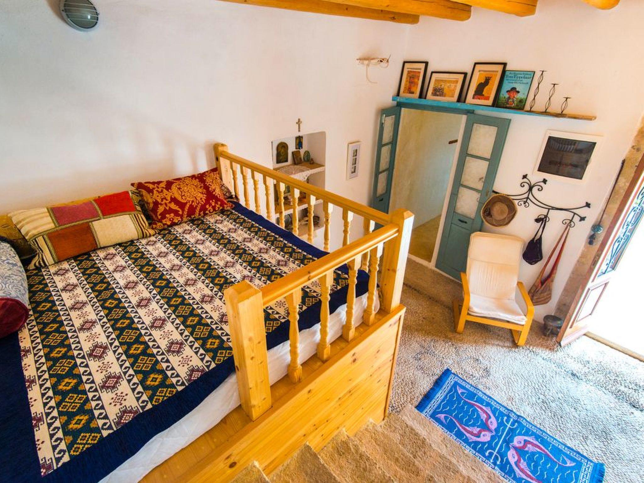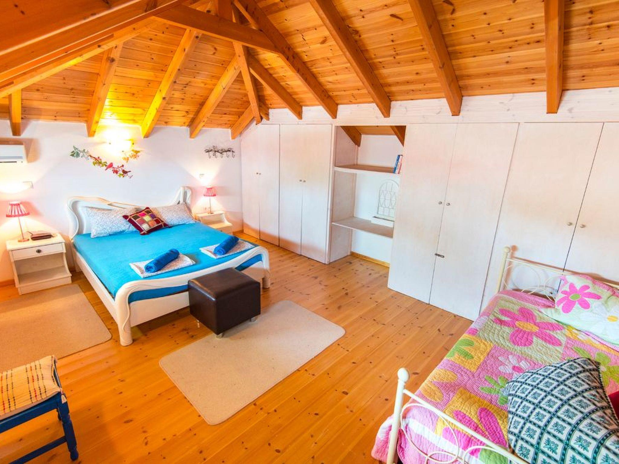 This side room has a double bed. Outside there is a big patio with table and chairs, a sunbed and a BBQ, surrounded by a nature stone wall decorated with flowers and plants. The village Trianta is located on the foot of the famous mountain Filerimos.