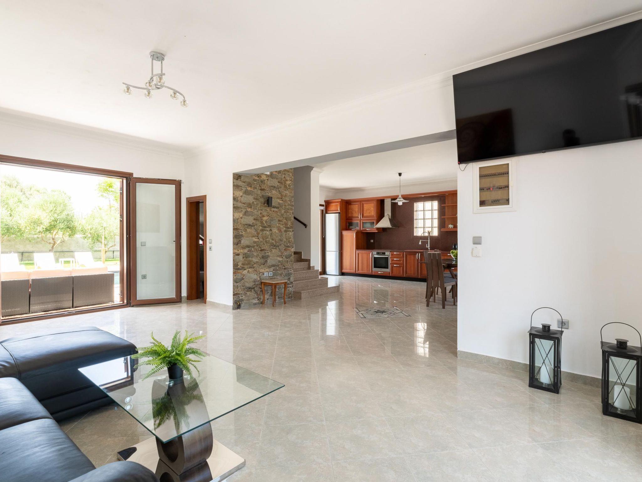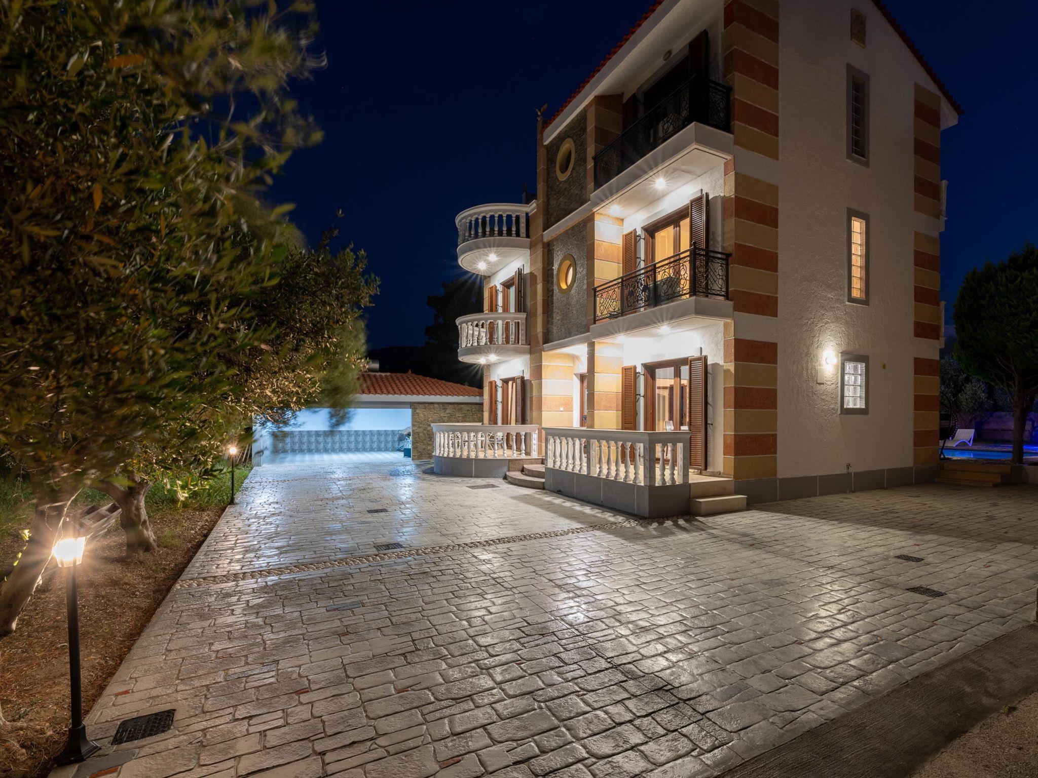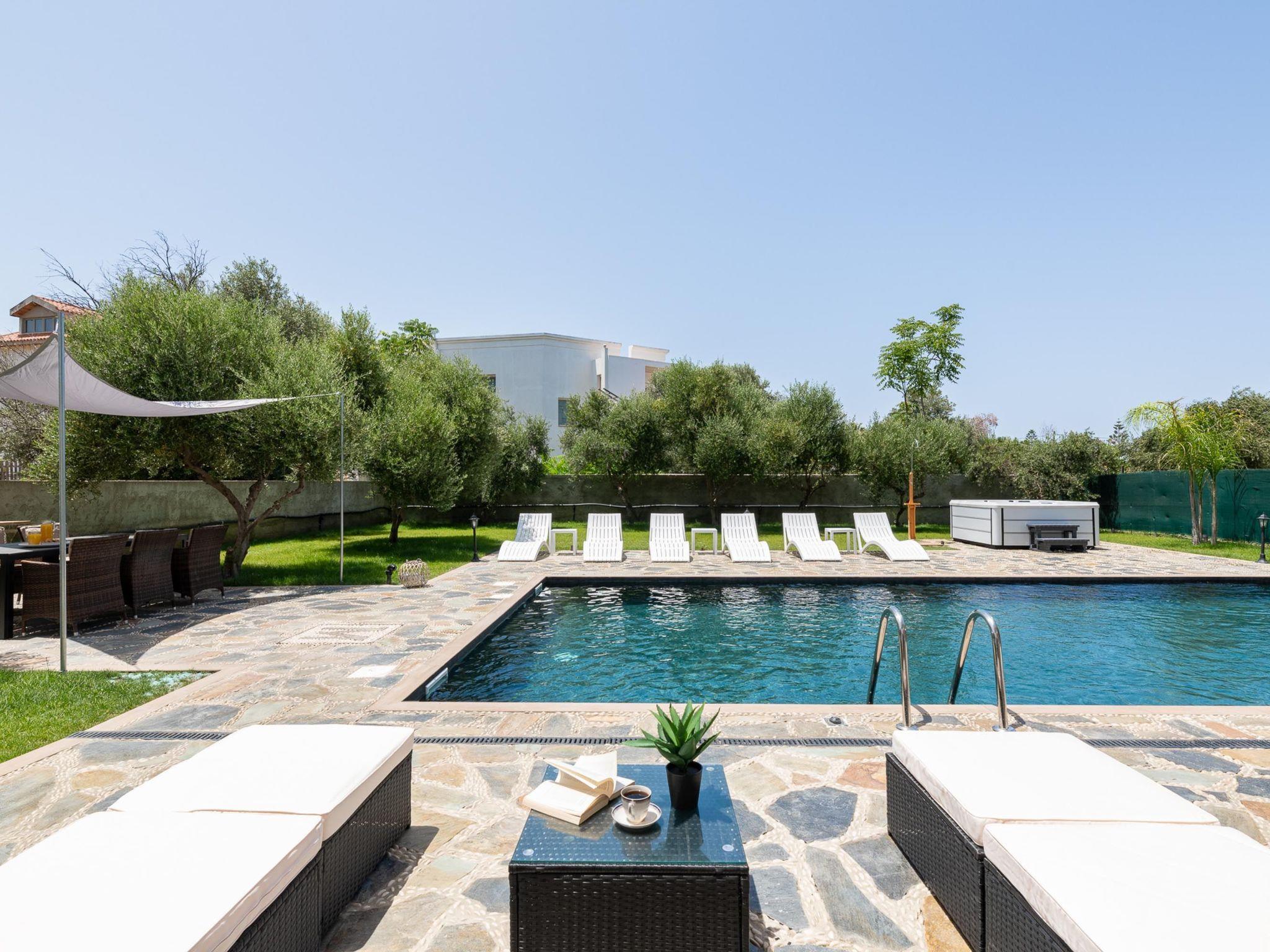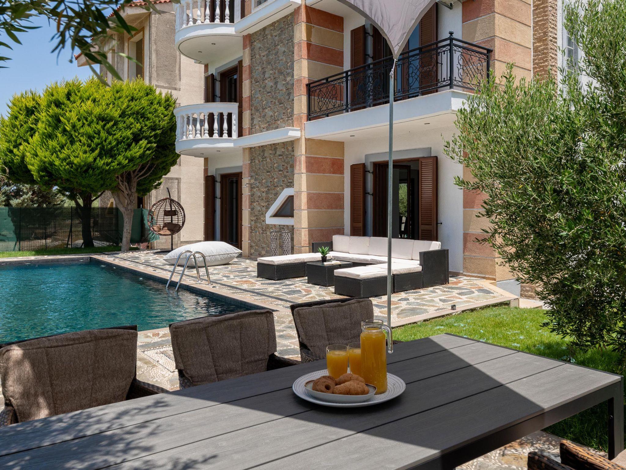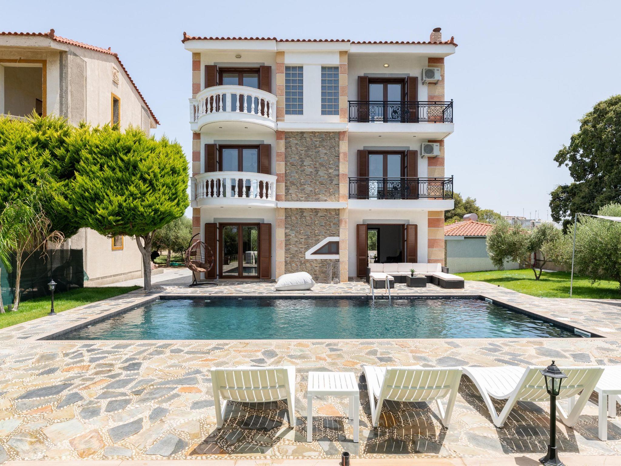 Sun Dream Villa is arranged in 3 floors and has four fully air-conditioned bedrooms, half of them with double beds,1 of them with 2 single beds and 1 with 2 single beds and 1 single sofa bed. All bedrooms offer TVs and balconies. There are two bathrooms in total, with bathtubs as well as a WC. All areas of the villa are fully airconditioned. Also, there’s an open-plan kitchen which is fully equipped and suitable for any meal preparation. In the same area, you will find the sitting area of the kitchen along with an incredibly cozy living room .There’s a smart TV and free Wi-Fi access throughout the property. Outdoors, there’s the wonderful private swimming pool and a heated jacuzzi with sunbeds where you can relax and work on your tan under the rays of the Aegean Sun. Of course, the beach is right about an 8-minute walk from the house so you can easily spend your time there. Also, there’s an outdoor furnished area and a BBQ installation along with a sitting area to enjoy a gathering with your friends or family under the starry sky!