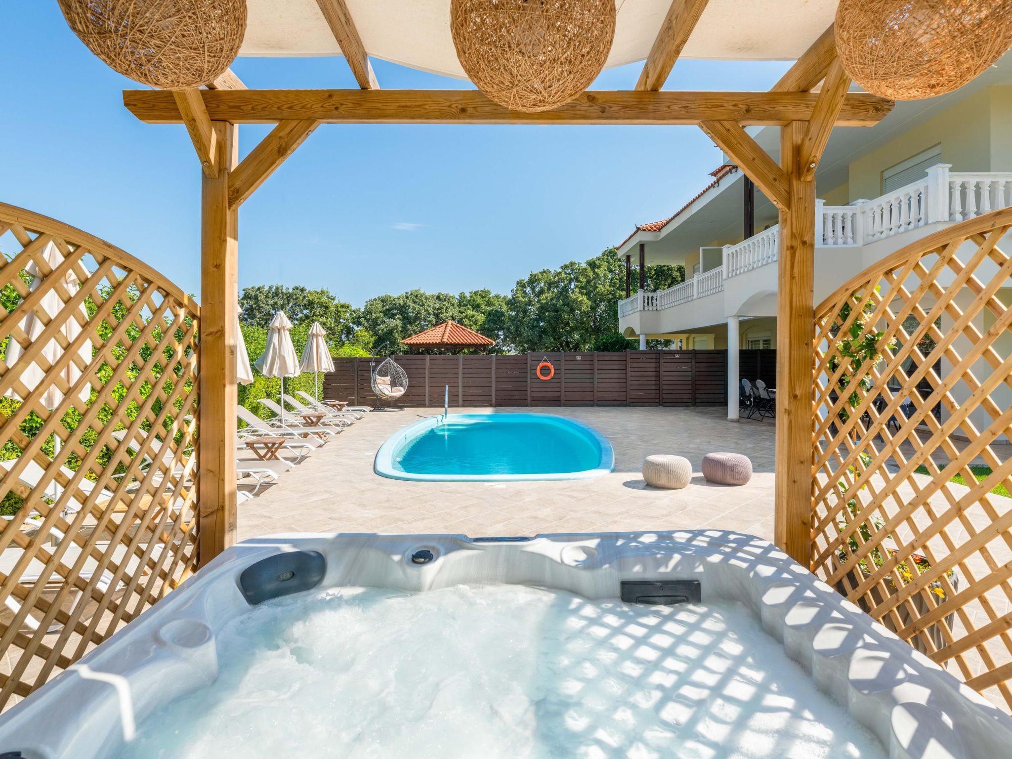 Villa Montefile has three fully air-conditioned bedrooms, all of them with double beds and balconies. One of the double bedded bedrooms includes an ensuite bathroom with a shower and has a flat-screen TV. There are two bathrooms in total, with showers as well as a WC. All areas of the villa are fully airconditioned. Also, there’s an open-plan huge kitchen which is fully equipped and suitable for any meal preparation. In the same area, you will find the sitting area of the kitchen along with an incredibly cozy living room in bright tones. There’s a smart TV and free Wi-Fi access throughout the property. There’s an entrance that leads to two houses that belong to one property. As you face the property from the entrance, Villa Montefile is on the left. Outdoors, there’s the wonderful private swimming pool and a heated jacuzzi with sunbeds where you can relax and work on your tan under the rays of the Aegean Sun. Of course, the beach is right about a 6-minute drive from the house so you can easily spend your time there. Also, there’s an outdoor furnished area and a BBQ installation along with a sitting area to enjoy a gathering with your friends or family under the starry sky!