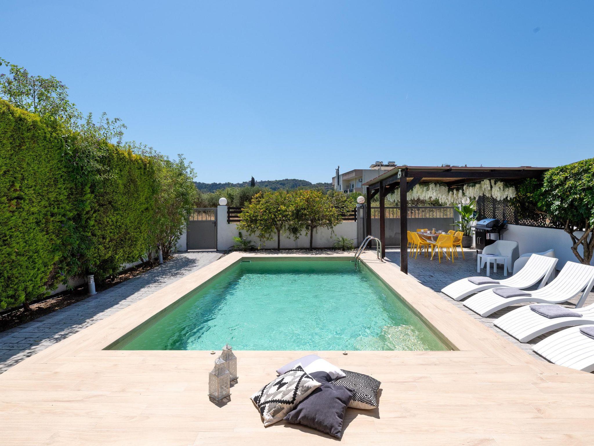 There’s a fully equipped kitchen suitable for any meal preparation. Also, there’s a comfy dining area and a large living room. The living room has a large screen TV with satellite channels. The decorating style is pretty inspiring and inviting. Outdoors, there’s the enchanting private swimming pool with sunbeds where you can relax and enjoy the beautiful surrounding and the summer sun. With spacious furnished veranda and surrounding patio and BBQ facilities, you will have the perfect place to enjoy the amazing Greek summer. You will have 3 bicycles provided with your stay, in order to joy a nice ride to the Village. Enjoy your morning coffee with the morning sun and drinks on a veranda while you feel the cooling breezes as the sun is setting.Our house is perfect for families or couples who will respect both the property and the neighbors, as the villa is situated in a peaceful neighborhood. Groups looking to party are not welcome. In case you did not respect the rules you will be escorted out of the house without a refund.