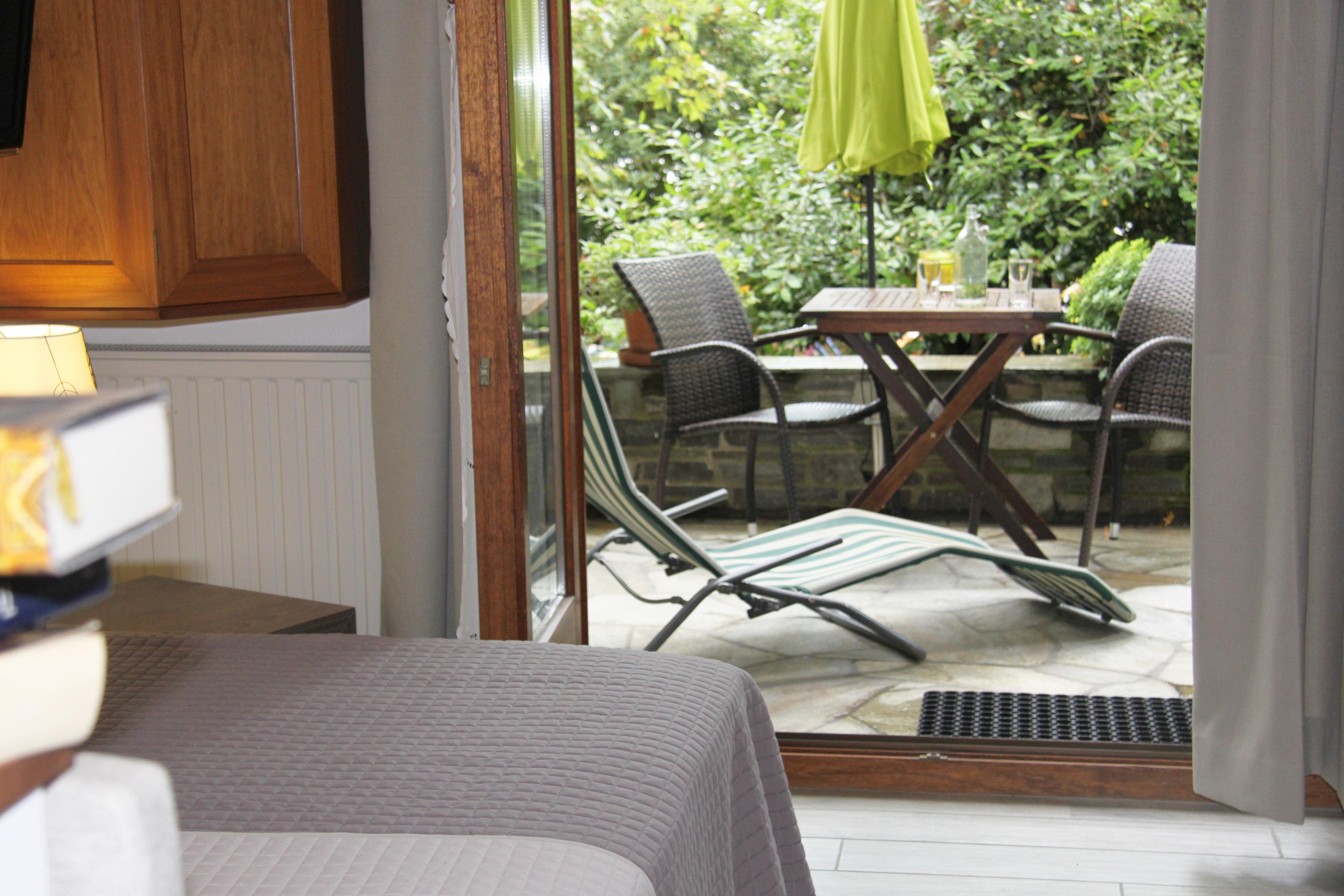 Komplett eingerichtetes Studio mit Badezimmer, neuer Küchenzeile und privater Terrasse. Direktzugang in unseren wunderschönen grün angelegten Garten und separater Eingang.