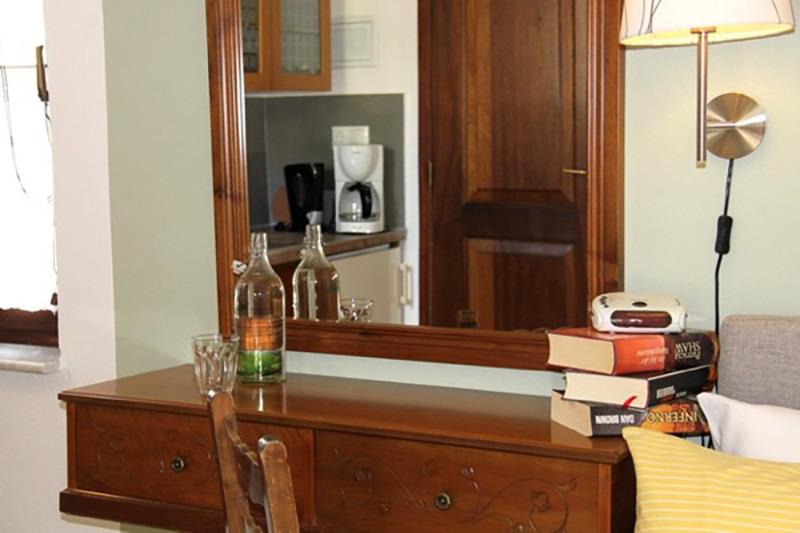 Komplett eingerichtetes Zimmer mit Badezimmer, Küchenzeile und privater Terrasse. Direkter Zugang in unseren wunderschönen Garten.