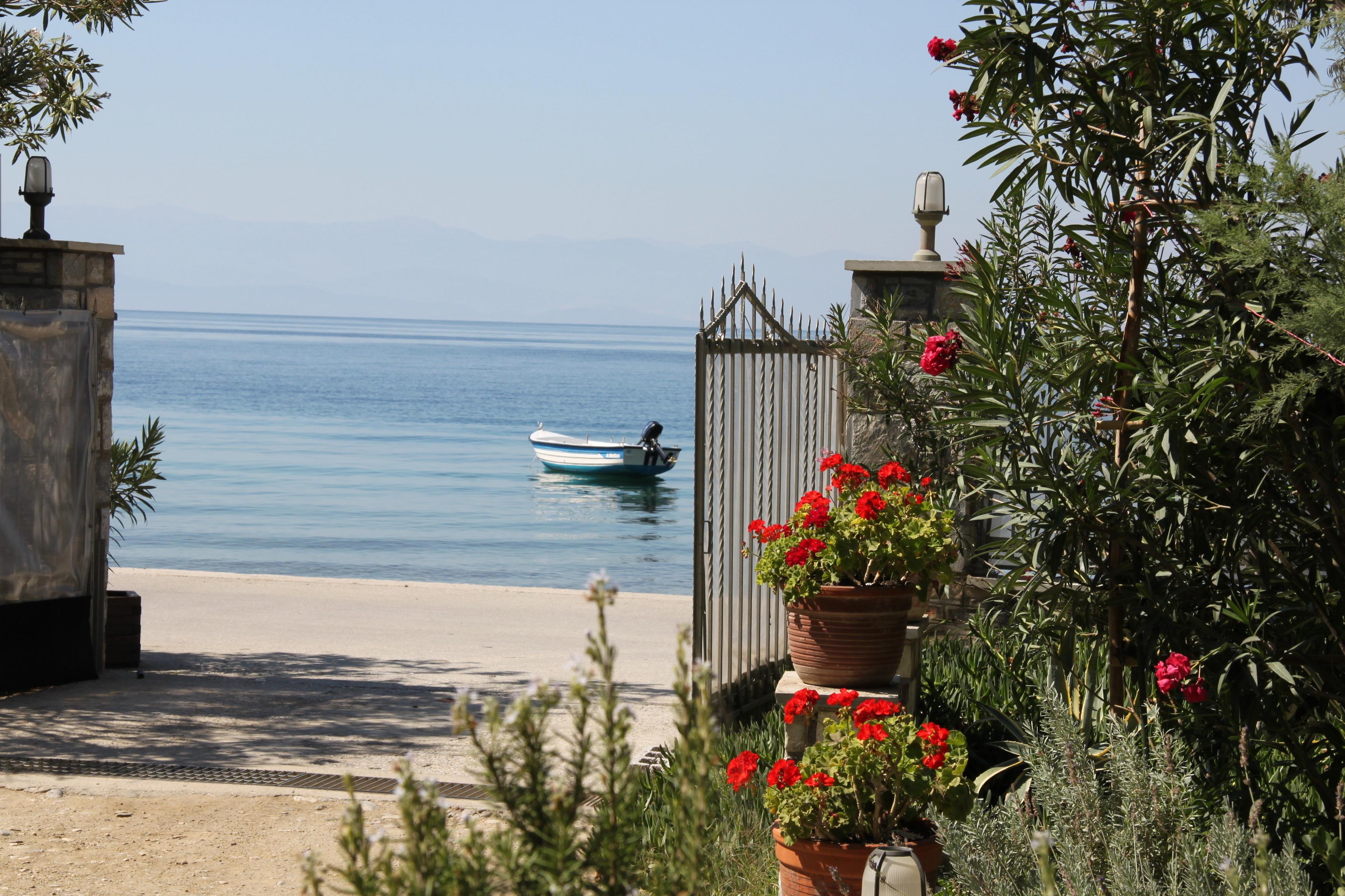 Vor dem Gebäude lädt ein kleiner Kieselstrand zum Baden im klaren Meer ein. Der Sandstrand von Kala Nera liegt nur etwa 5 Gehminuten entfernt, immer am Meer entlang. Das Dorf hat eine lange schattige Promenade, genau richtig zum Spazierengehen, Einkaufen, zu einer gemütlichen Mahlzeit in einer der Tavernen oder zu einem Drink in einer der Strandcafes oder Bars. Der Strand ist flach und sandig, in den Sommermonaten teilweise organisiert und wird jedes Jahr mit der "Blauen Flagge" (= sauberes Wasser) ausgezeichnet.