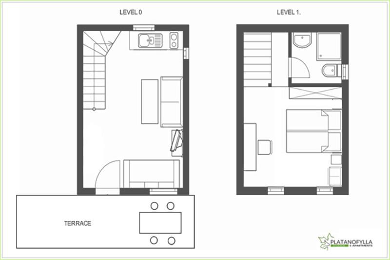 Es gibt zwei baugleiche Maisonetten, die direkt nebeneinander liegen und eine große gemeinsame Terrasse nutzen, mit Blick in Richtung Meer und Garten. Diese sind großzügige, geräumige und funktionelle Apartments mit einer Innentreppe, welche Wohn- und Schlafraum mit dem ersten Stock verbindet.