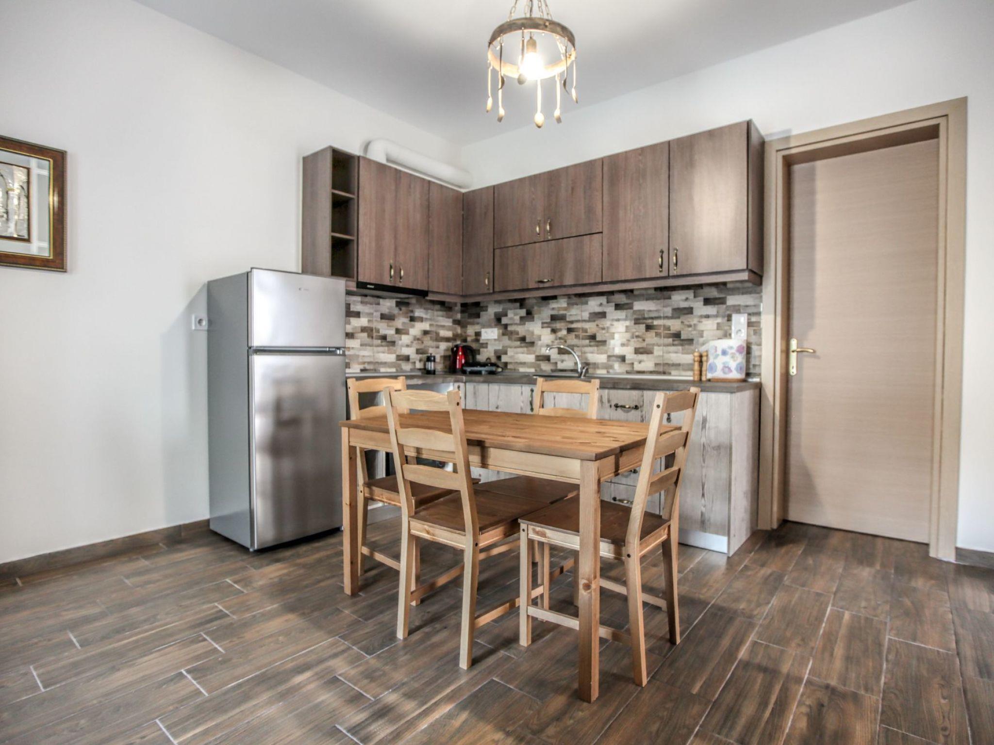 It consists of a bright double master bedroom looking out to the … and of a large open plan living room – dining room – kitchen. The living room, where you can relax on the six seater sofa opposite the fireplace and enjoy a movie, is discreetly screened off from the dining area, which extends to a fully-equipped kitchen with a four-chair kitchen table. There is a spacious bathroom with beautifully designed walls and a comfortable shower cabin, in which you can enjoy a hot bath, while the… rain falls down on you! On summer nights, make sure you switch the air conditioner on, while on wintery nights, the house is heated with natural gas, 24/7 natural. This apartment is ideal for families with children, couples, or groups of friends.