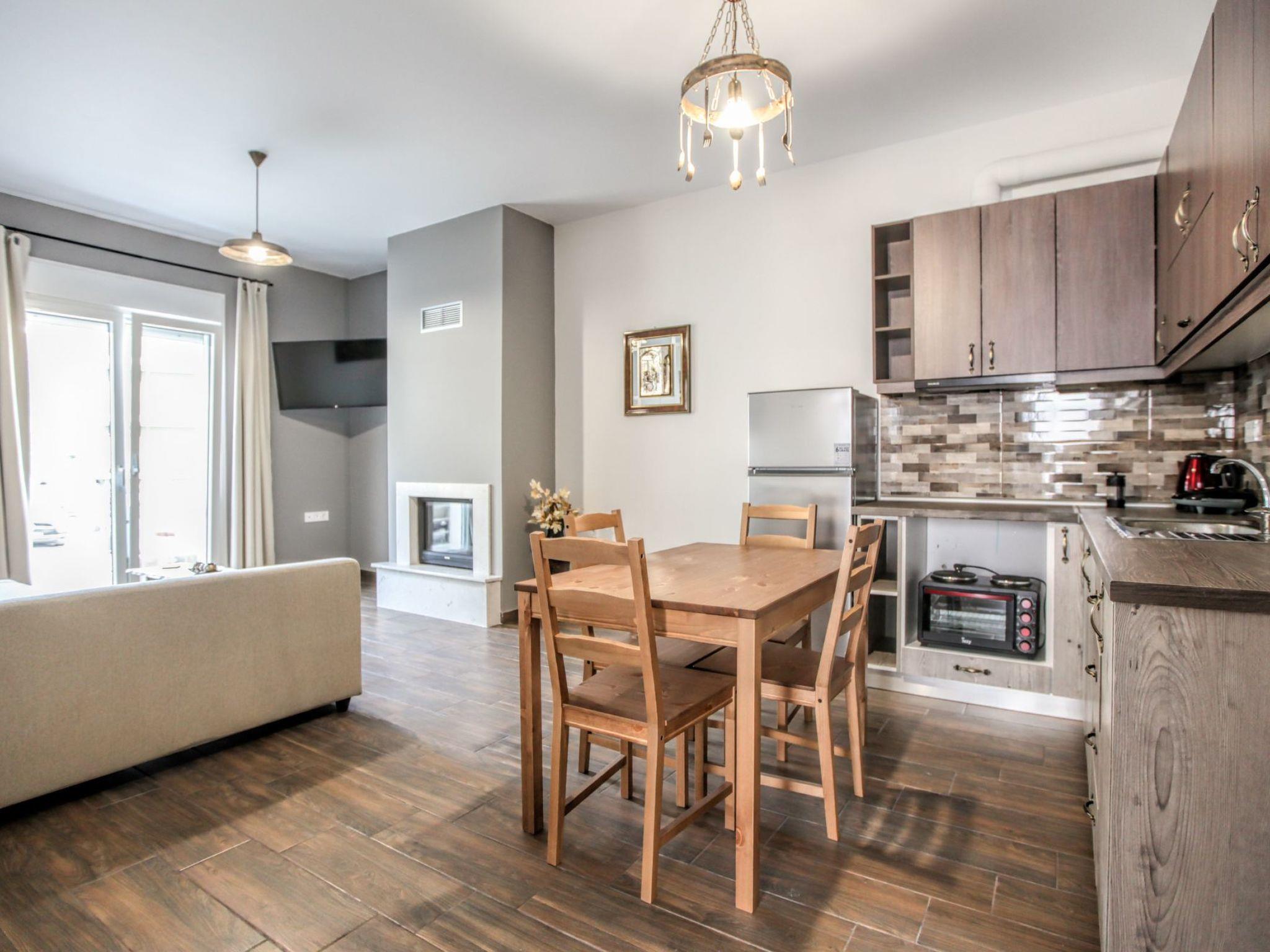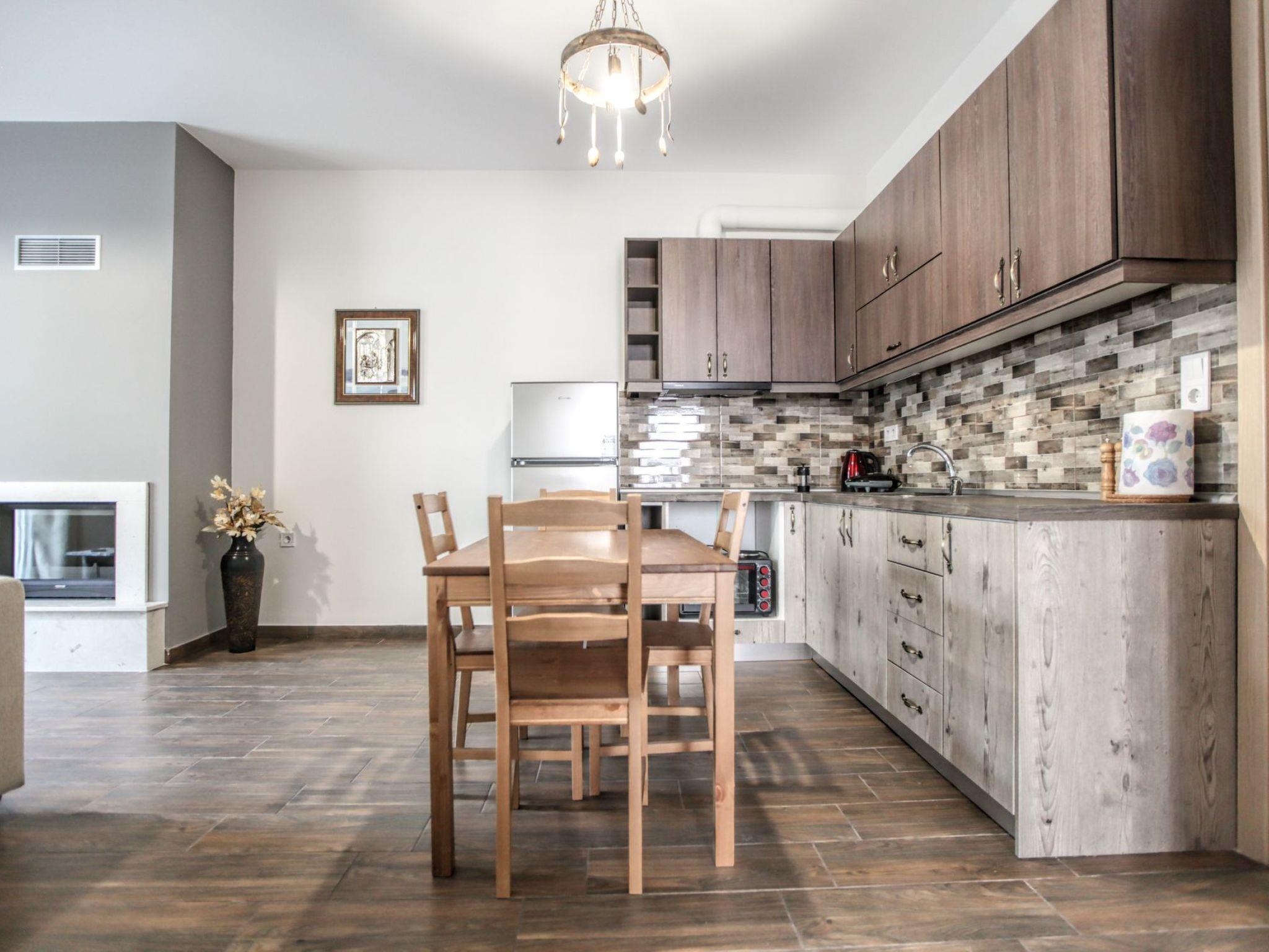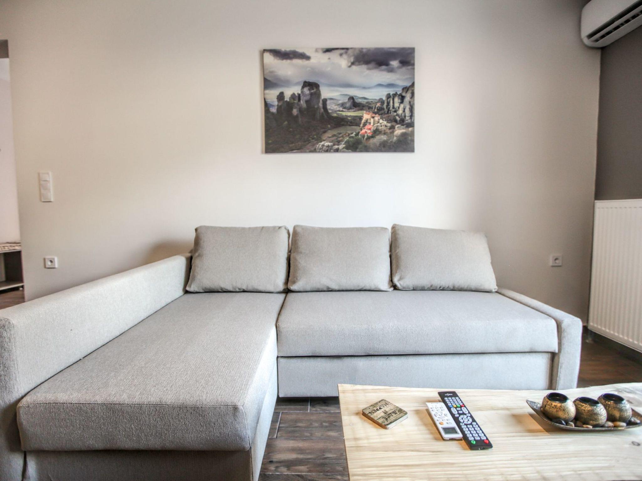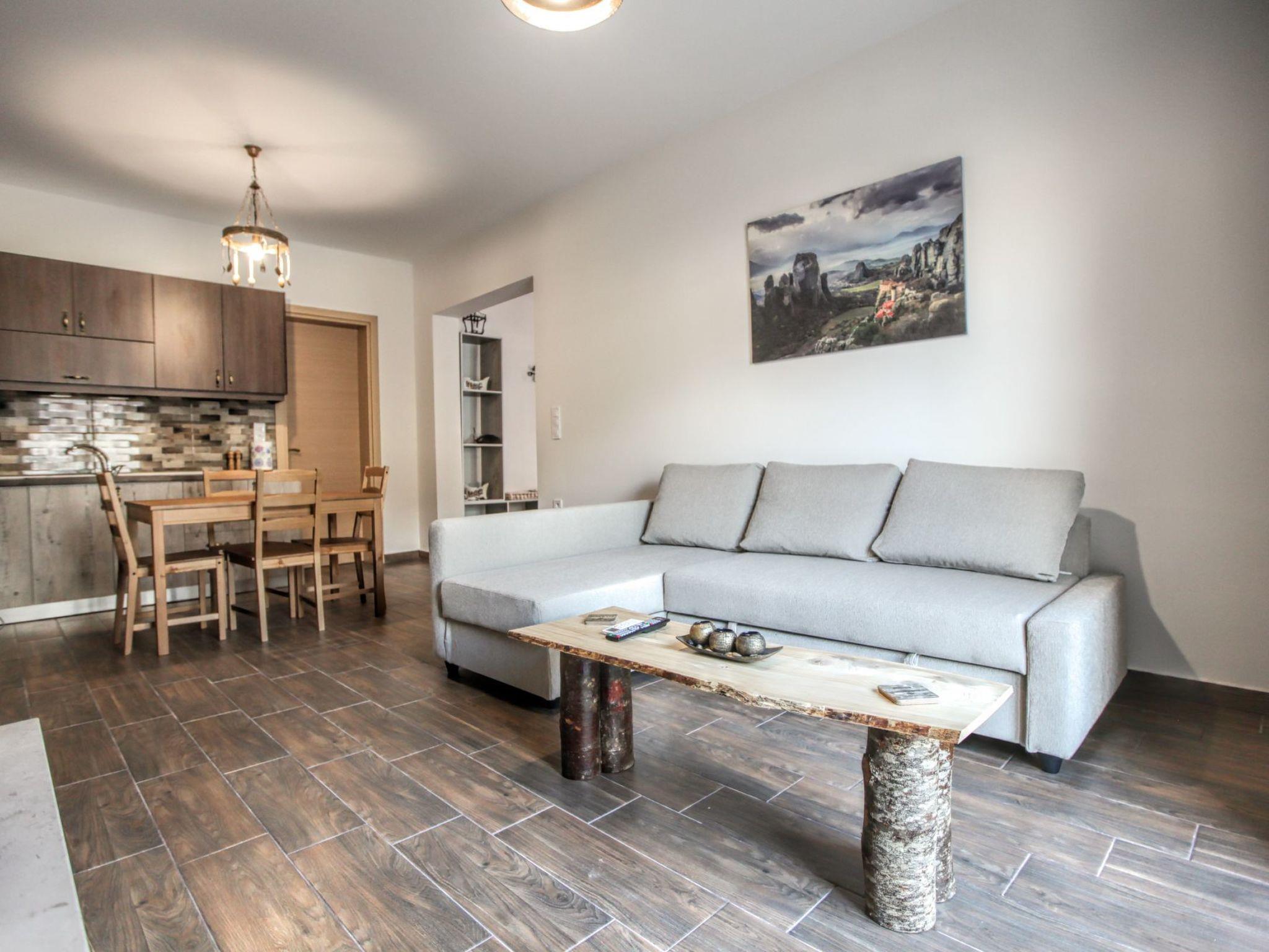 Explore the glorious Meteora rocks and the surrounding area with this brand new, large, airy, country rustic style apartment, which offers an open plan living space with all the modern facilities, as your base. The property is tastefully decorated with neutral patterns, high end finishings and wooden-like accents, for a luxurious yet charming feel. This contemporary apartment has everything to make you feel at home – Wi-Fi, energy fireplace, king-size beds, well-equipped kitchen and tableware,
