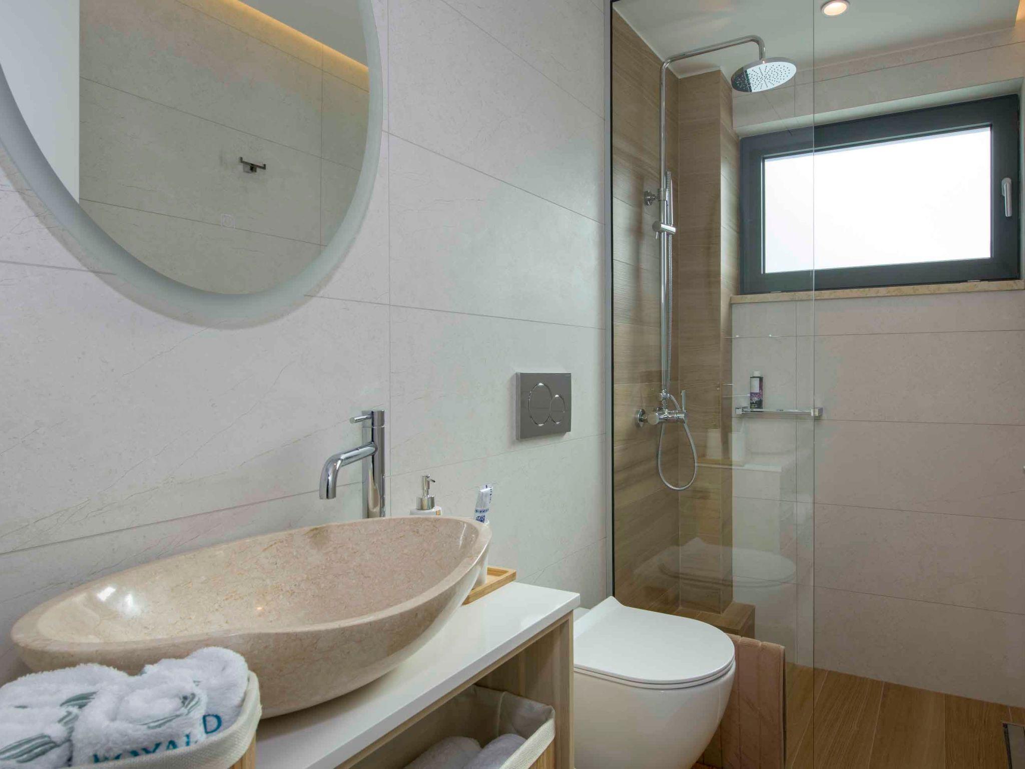 Royal Bird Villa is a three-story villa consisting of four bedrooms, one of them on the ground floor, with twin-size beds. On the ground floor, the open-plan space area offers direct access to the pool area. The real heart of the home is the open plan living area with a fireplace and the scenery is completed with a kitchen with a modern design and all the necessary amenities for easy preparation of meals. There is also a ding space where you could enjoy your meals gazing at the sea. On the same floor, you can find a communal bathroom with a shower.