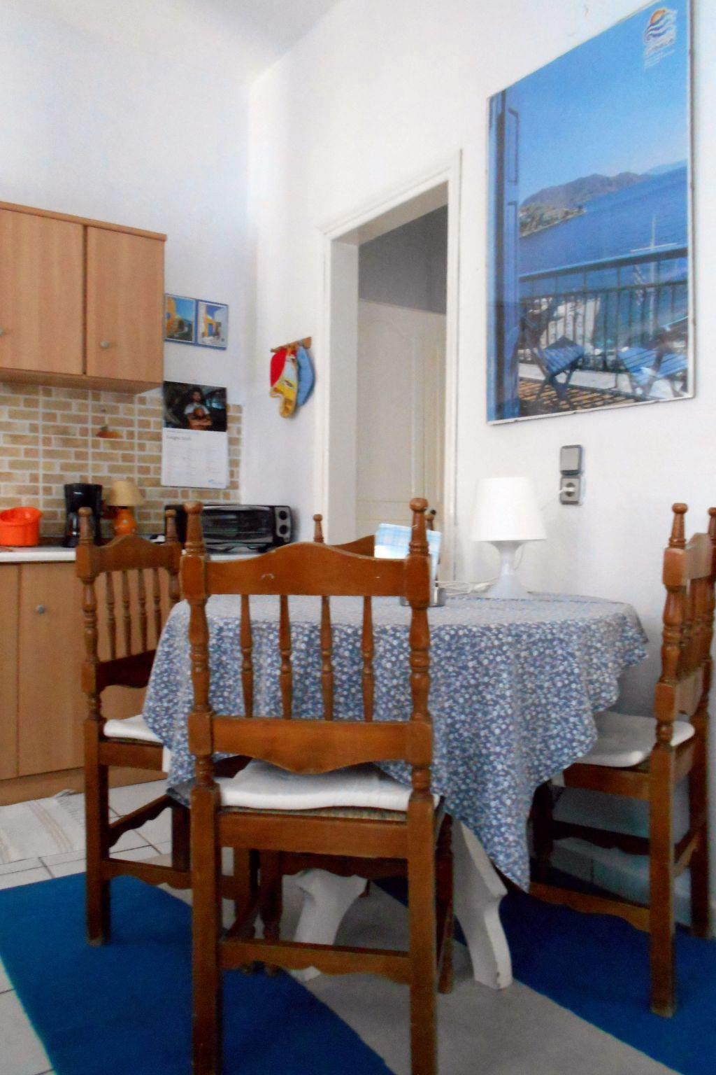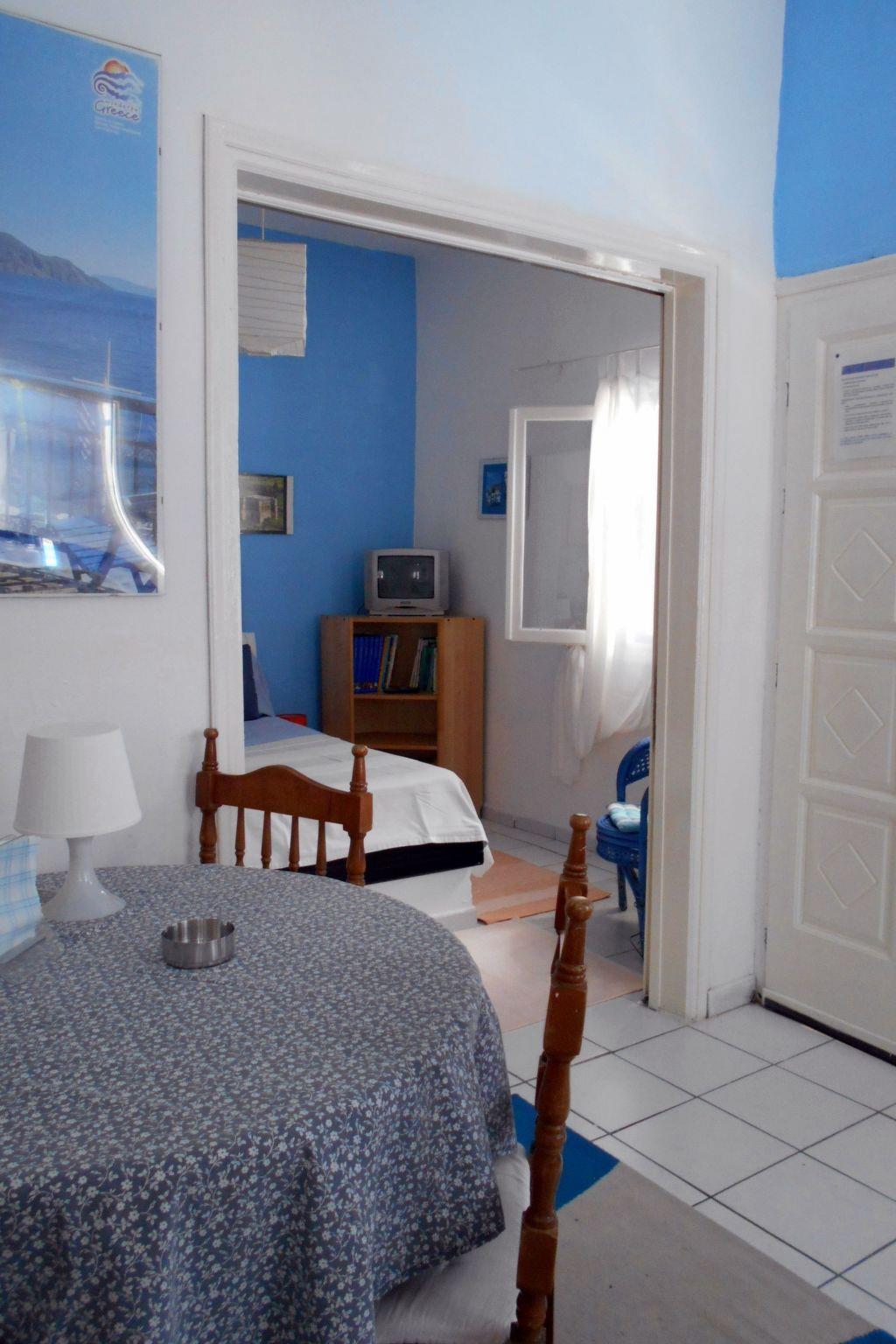 Double bedroom,single bed and fully equipped kitchen The ground floor, about 35 sq.m., consists of the following rooms: a living room and a bedroom (next to the living room) with a double bed; a fully equipped kitchen with electric stove, oven, coffee machine and dining area; and an adjoining bathroom with shower, hairdryer and sink. Room,kitchen and bathroom linen is provided.Every 4 days there is a complete cleaning and change.Furnishings in Greek oriental architecture.On request air conditioning,personal washing machine,breakfast,safe.