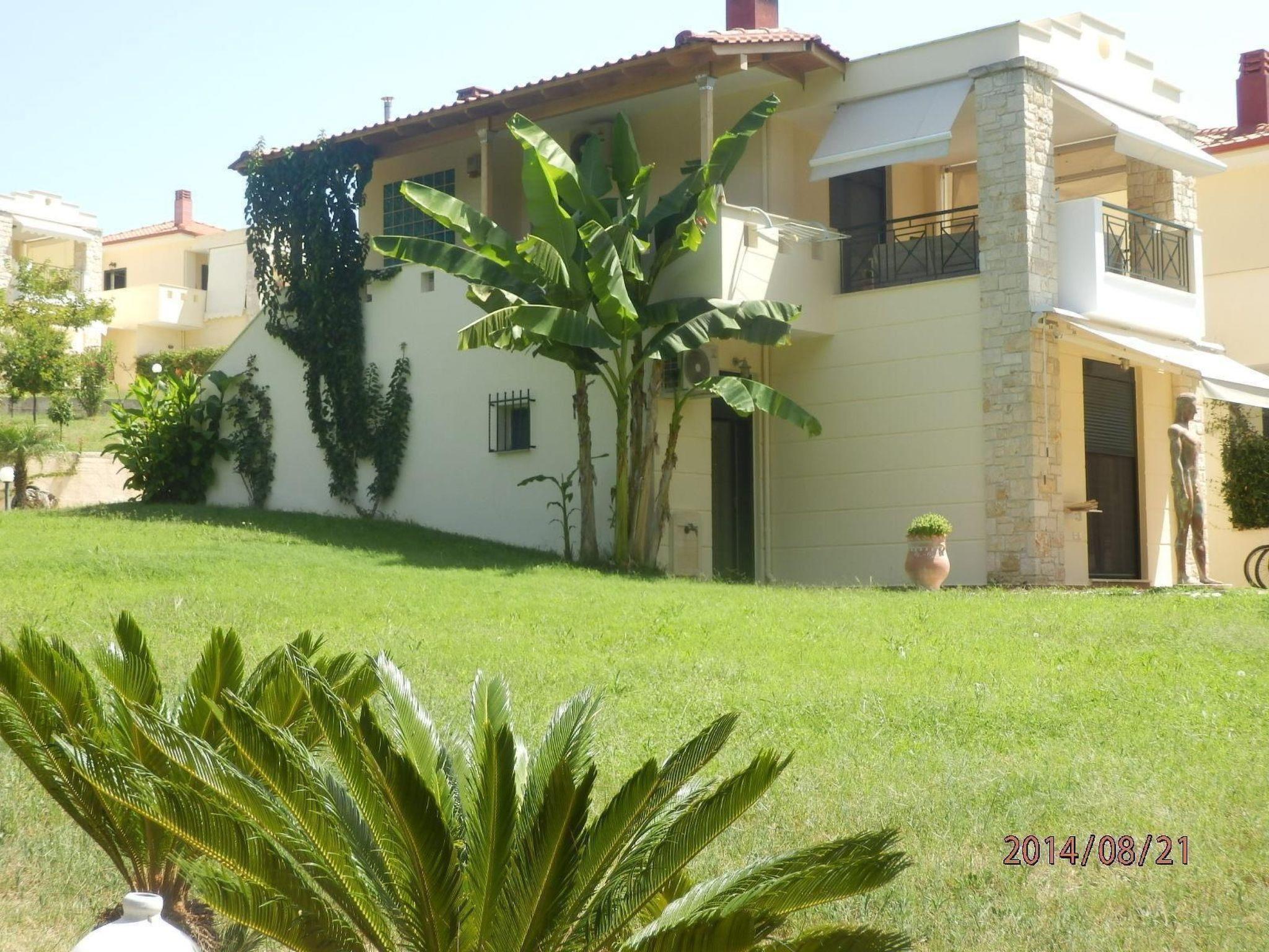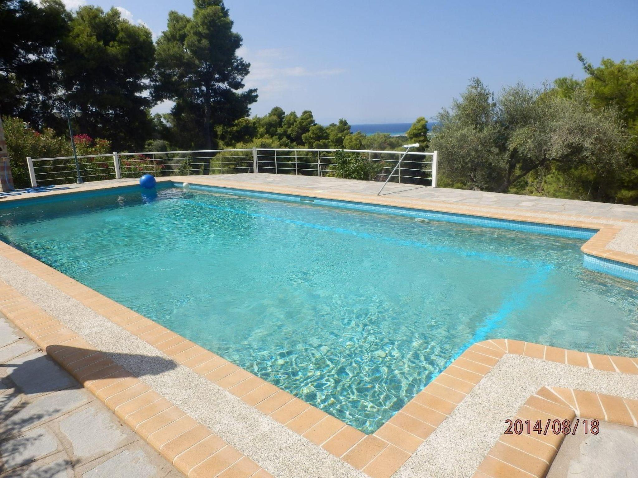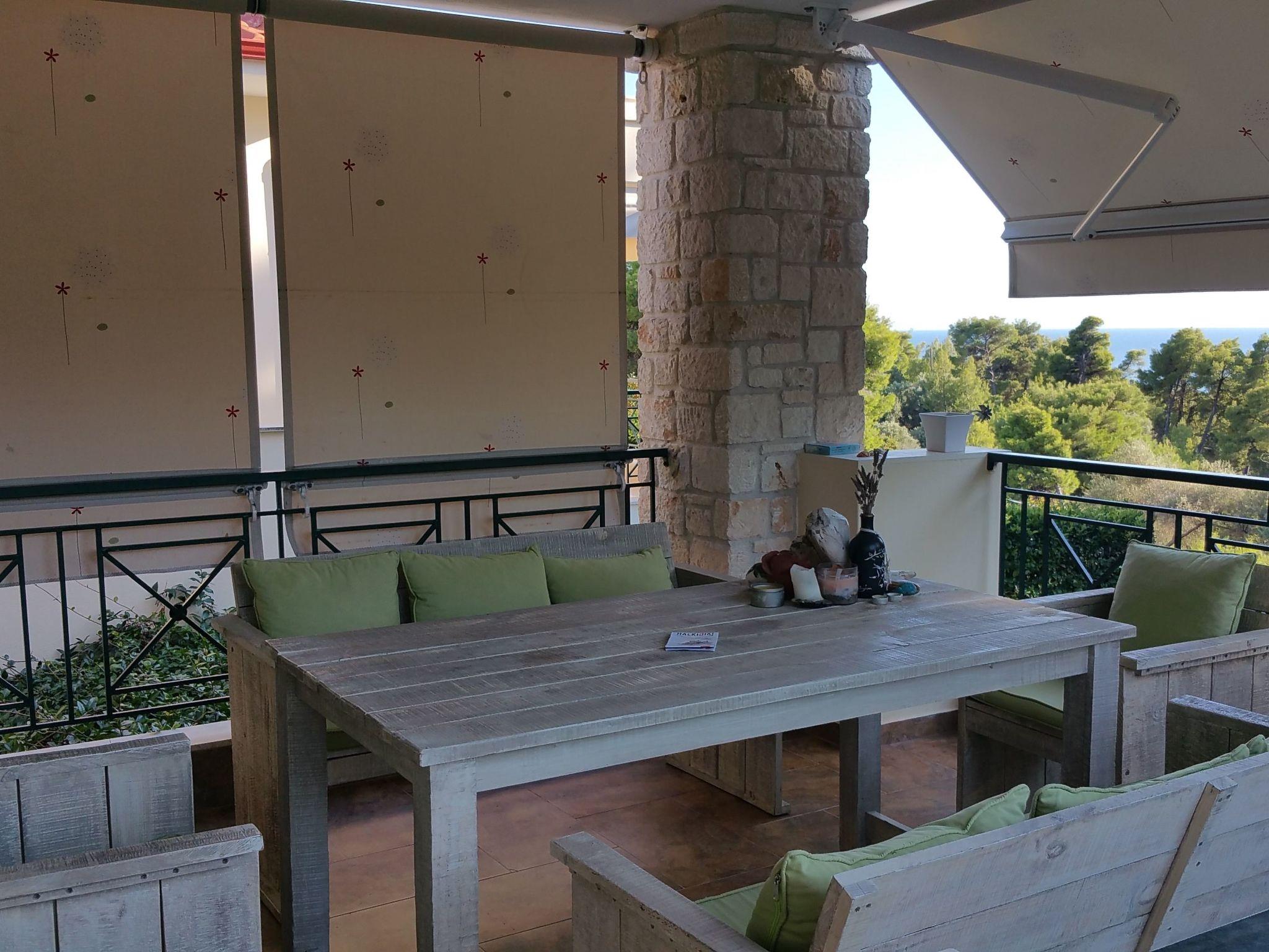 This very tasteful and comfortable holiday home is located on the outskirts of Possidi on a beautiful sandy beach. It is the end house of a row of houses and is situated directly on a small hill, surrounded by many trees of the neighbouring forest and many plants. The house is 100m² in size and has two floors. On the lower floor are the three bedrooms, which were freshly renovated in summer 2021. One of them is furnished with two single beds and a wardrobe. The other two bedrooms each have a double bed. A set of changeable bed linen is available for all beds. On this floor you will find the bathroom with WC, washbasin and a modern shower and steam cabin. Towels and a washing machine are available here. There is a small minibar with fridge in the hallway where you can store your drinks. The upper floor of the house consists of the living and kitchen area. There is a cosy leather sofa in the large living room. On cooler evenings, you can relax here in front of the fireplace. The open-plan kitchen is modernly equipped with an electric cooker (ceramic hob), oven, toaster, kettle and large fridge with freezer compartment. Four people can sit at the round table. The second bathroom with WC, washbasin and shower is located on this floor. All windows in the house are fitted with mosquito screens. The large balcony gives the house a special touch, as here you can enjoy the view of the forest all the way to the sea while smelling the conifers. There is a private barbecue and parking for up to three cars. The residential complex's pool can also be used. This is shared with 5 other holiday homes. Possidi is located on the first finger of the Halkidiki peninsula. The village has marvellous sandy beaches where you can enjoy the sunsets with an enchanting view of Olympus, the mountain of the gods. Small tavernas right on the beach, pizzerias, fast food outlets, bars, souvenir shops and a small supermarket can be reached on foot in approx. 15 minutes, the beach in 10 minutes. If you are travelling by car, you will find parking facilities everywhere. The journey from the nearest airport in Thessaloniki takes approx. 1 hour and 15 minutes by hire car.